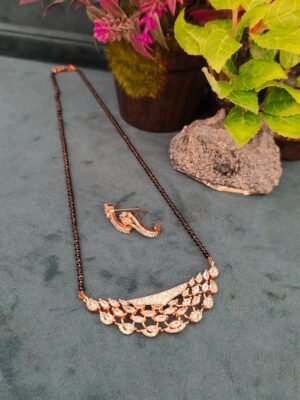 🔵 Metal: German Silver (Silver Alloy) 🔵 Stones: AAA+ Quality American Diamonds 🔵 Plating: Rose-Gold 🔵 Lifetime Guarantee on stones 🔵 For Jewellery Care, please refer here 🔵 For Exchange Policy, please refer here