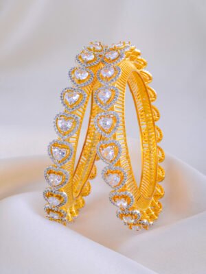 Radiate timeless elegance with this stunning diamond bangle set, expertly crafted from premium German Silver with a luxurious rhodium/silver plating finish. The set features two exquisite bangles adorned with intricate filigree design embellished with lustrous white pearls and brilliant AAA-quality American Diamond stones arranged in an elegant pattern throughout. The sparkling diamonds catch light beautifully,...