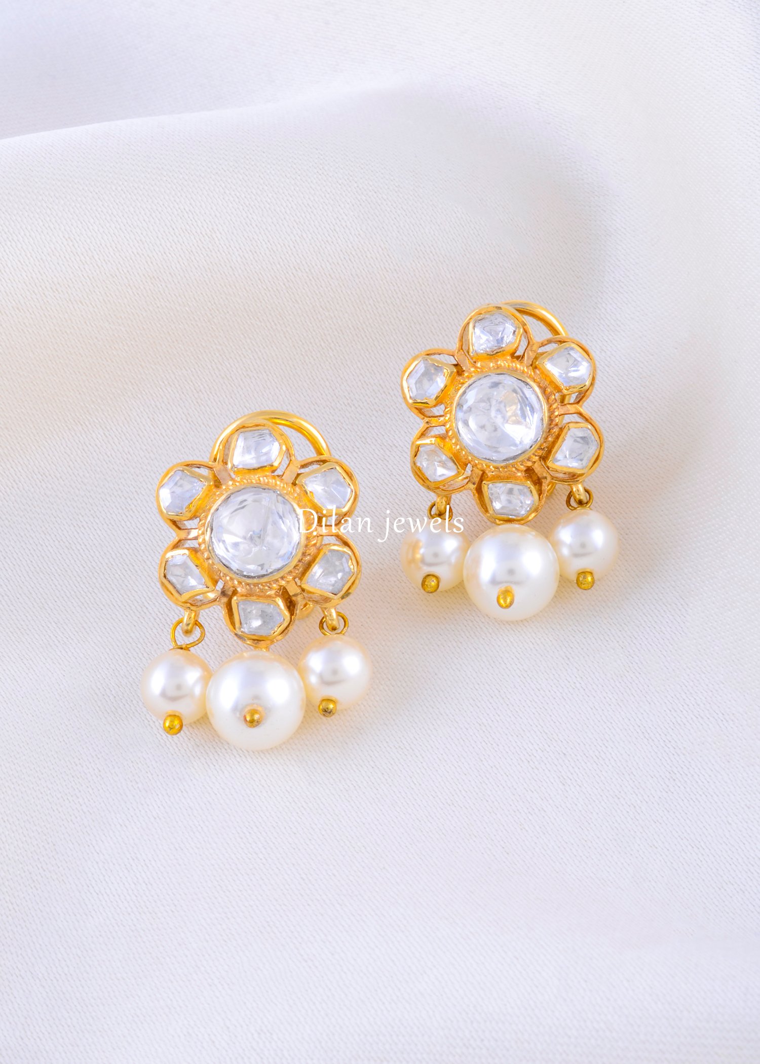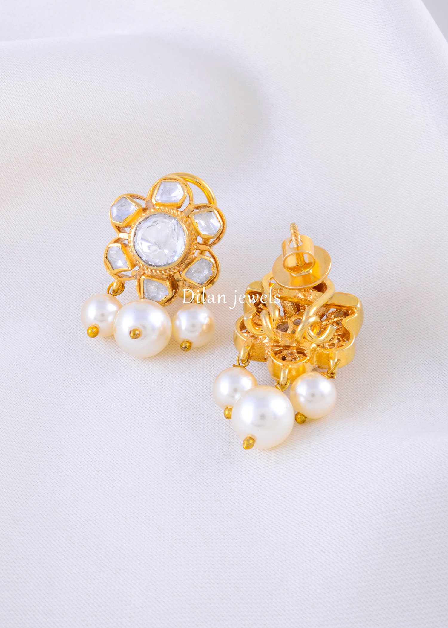 925 Silver Moissanite Polki Floral Studs with Pearl Drops (Yellow Gold) EAR002388