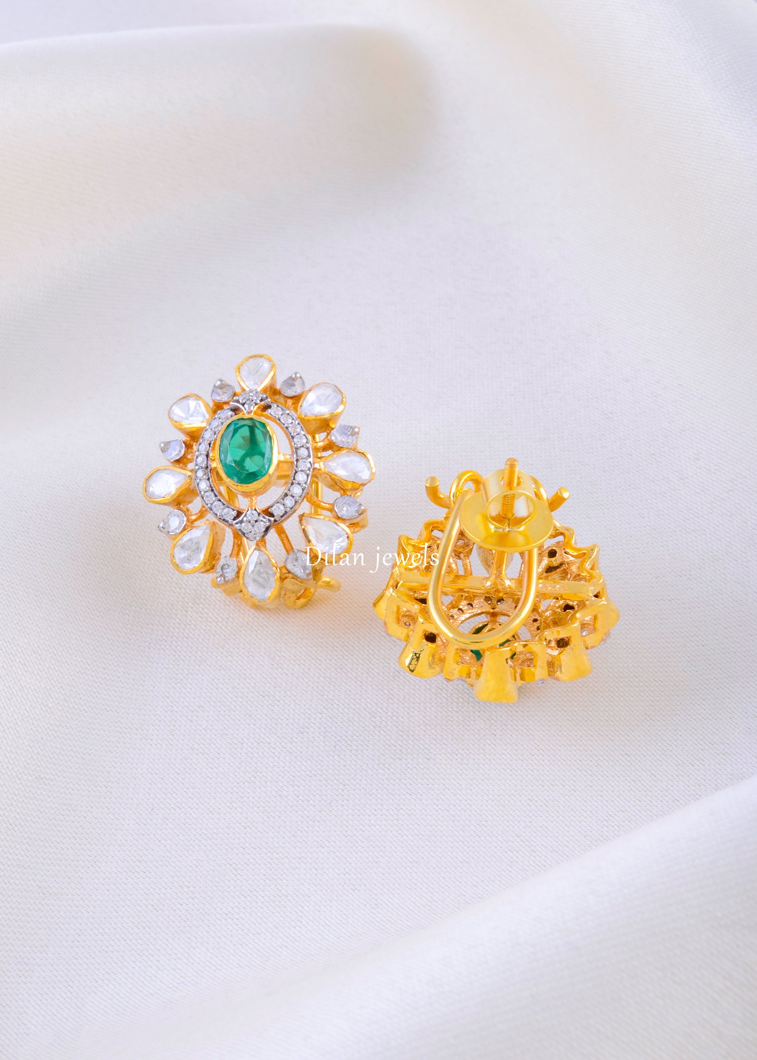 Embrace regal elegance with this exquisite necklace set crafted in premium 925 sterling silver with lustrous gold plating, featuring a stunning oval-cut emerald (Mojonight Pulki) as the focal point, complemented by AAA-quality American diamonds and matching earrings. The ornate floral motif showcases brilliant faceted diamonds surrounding the vivid green emerald, creating a majestic sunburst effect. The adjustable gold-plated chain ensures comfortable everyday or formal wear. The accompanying stud earrings mirror the pendant’s enchanting design perfectly. Ideal for weddings, festive celebrations, or elevating special occasions. This sophisticated set harmonizes authentic sterling silver with contemporary artistry, making it a cherished heirloom piece that radiates timeless grace and refined luxury.