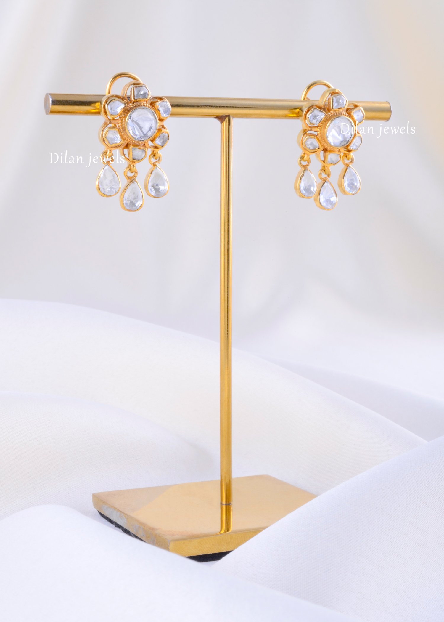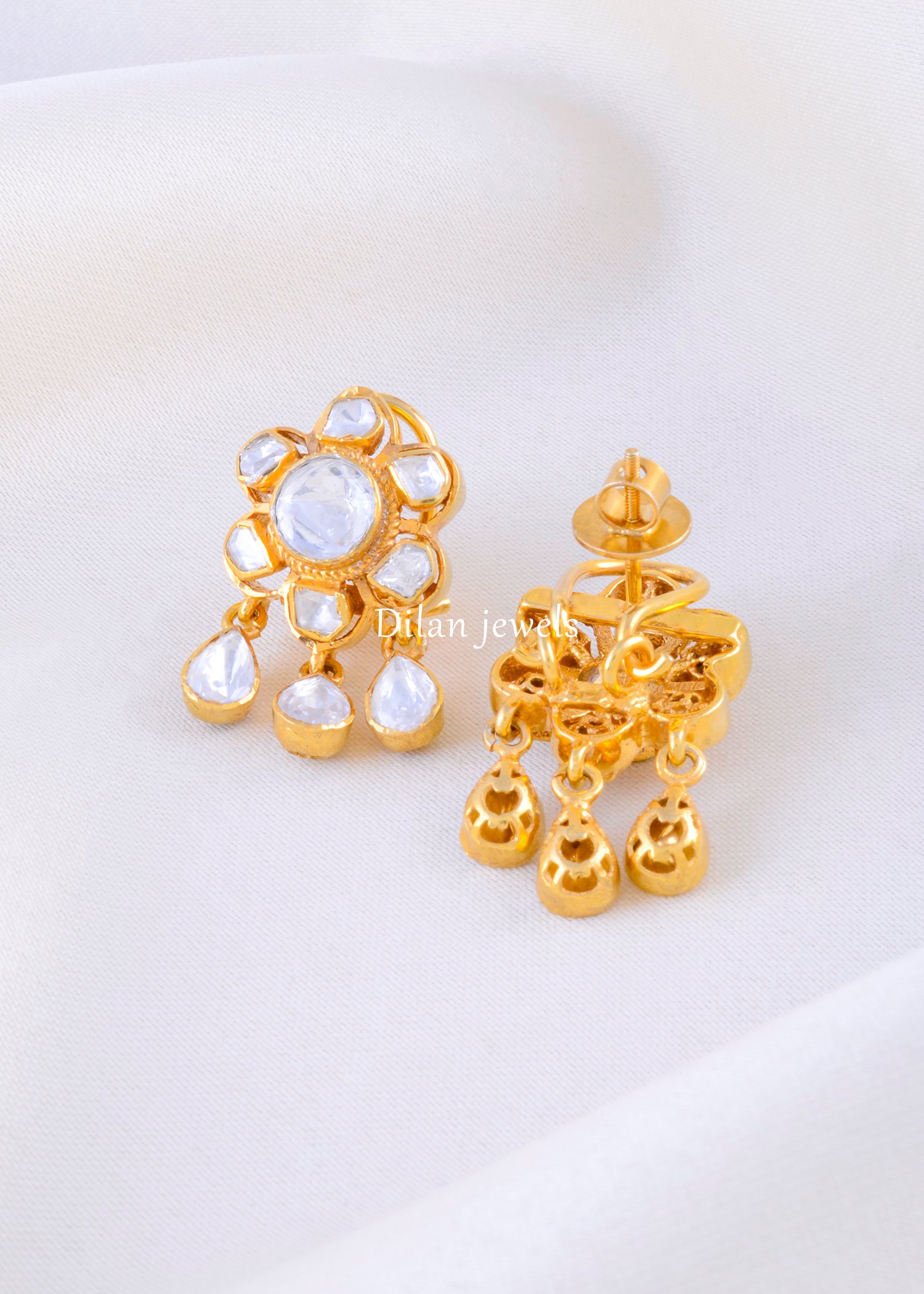 Experience the allure of traditional craftsmanship with these captivating floral drop earrings, expertly fashioned in 925 Sterling Silver. At the heart of each stud lies a radiant Moissanite Polki, surrounded by smaller uncut stones in a classic flower setting. Three delicate pear-shaped Moissanite drops dangle gracefully from the base, adding movement and sparkle with every turn. The gold-plated finish enhances the vintage appeal, making these earrings a sophisticated choice for weddings, festive gatherings, or as a timeless gift.