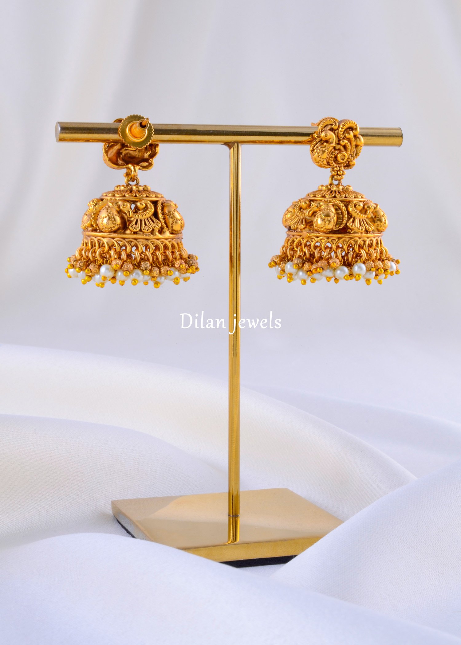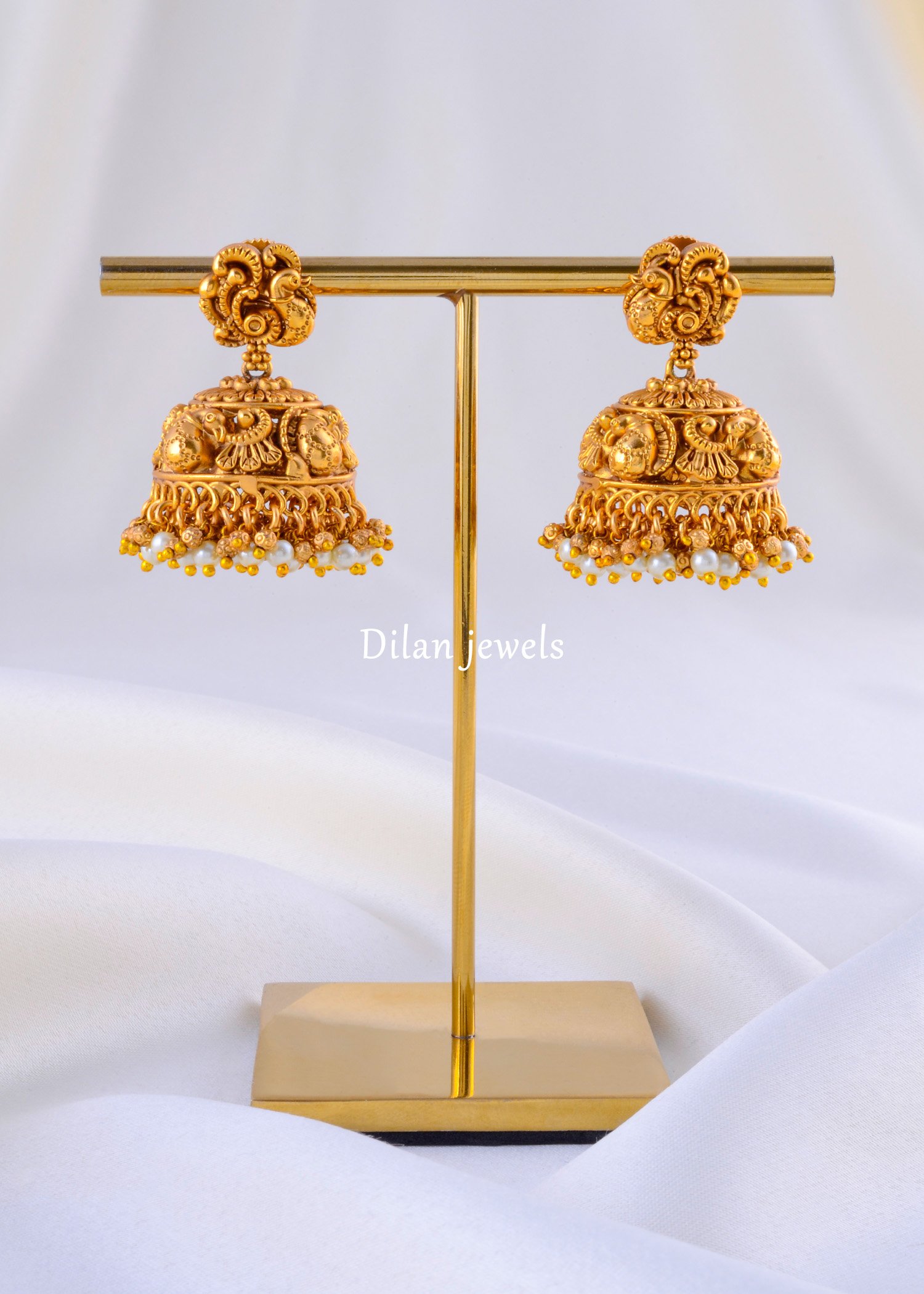 Discover the perfect blend of tradition and grace with these Antique Gold Pearl-Drop Jhumkas. Expertly designed in the style of classic Temple jewelry, each earring features an intricate swirled stud that supports a magnificent, bell-shaped dome. The jhumka is heavily embossed with detailed bird motifs, showcasing rich artistry and texture. The design is beautifully finished with a dense cluster of tiny white pearls and golden beads fringing the rim, adding a soft, lustrous contrast to the matte antique gold finish. These regal earrings are the ideal companion for silk sarees and heavy ethnic wear at weddings and festivals.