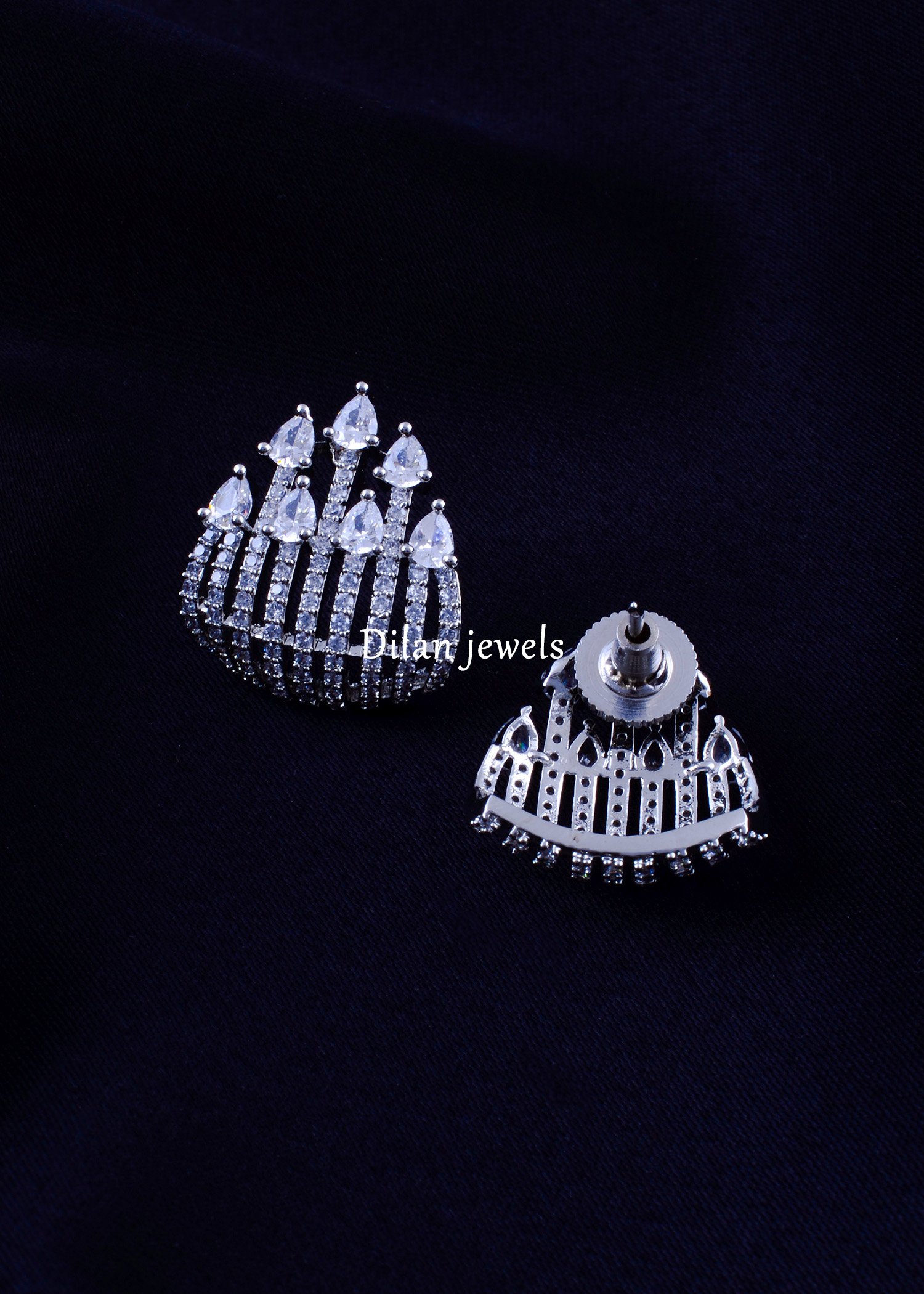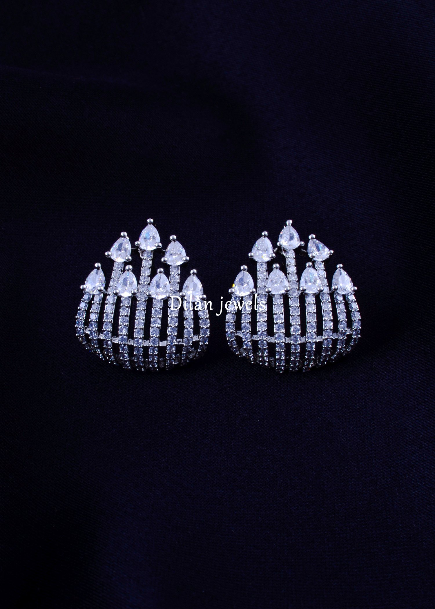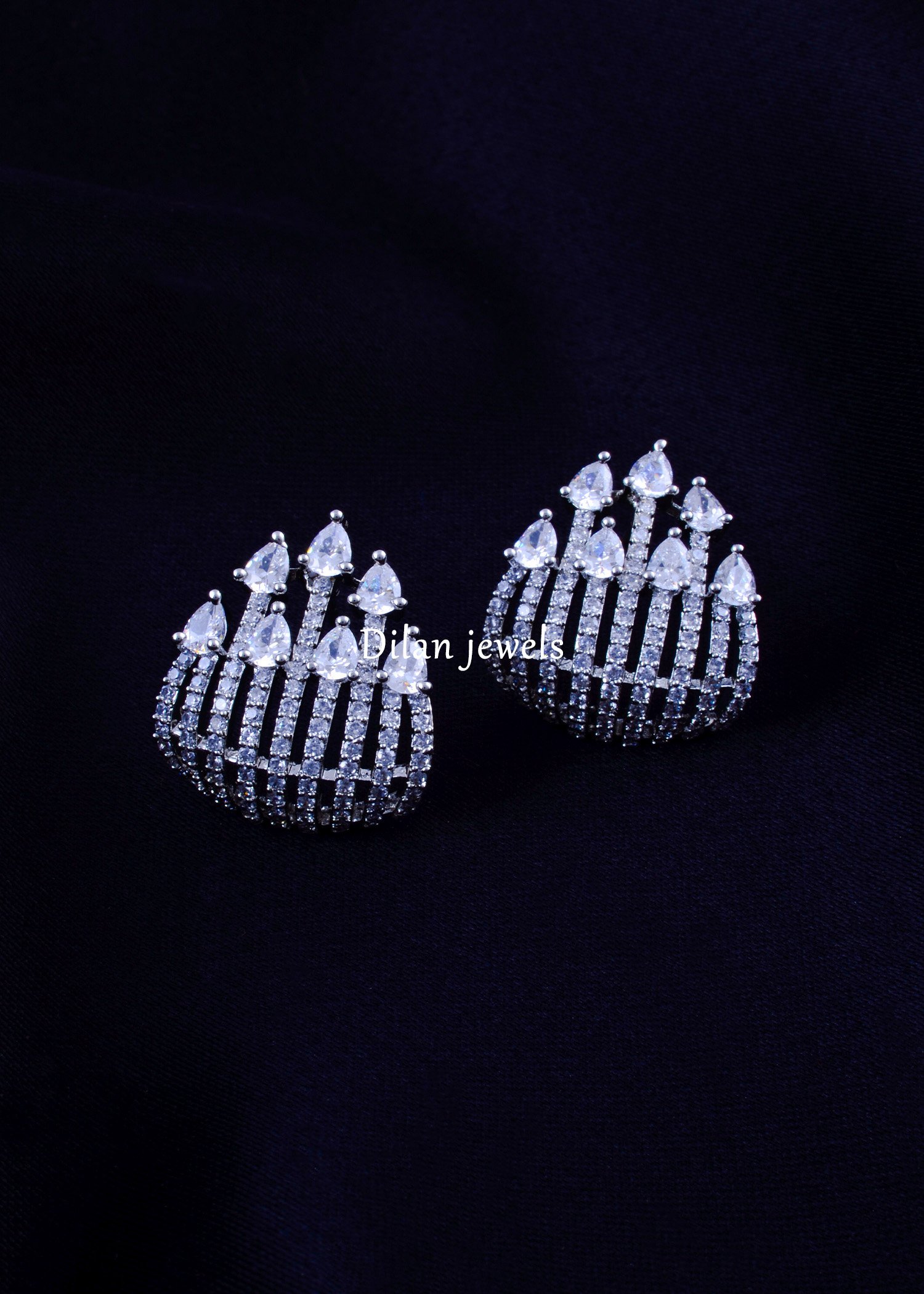 These exquisite earrings from Dilan Jewels are crafted in premium German silver and adorned with dazzling AAA-quality American diamonds. The elegant design radiates a luxurious brilliance, perfectly blending sophistication with modern style. Lightweight yet striking, these earrings elevate any outfit—from festive ensembles to evening wear—with effortless grace. The shimmering diamonds and silver detailing make them a timeless addition to your jewelry collection, reflecting unmatched craftsmanship and elegance.