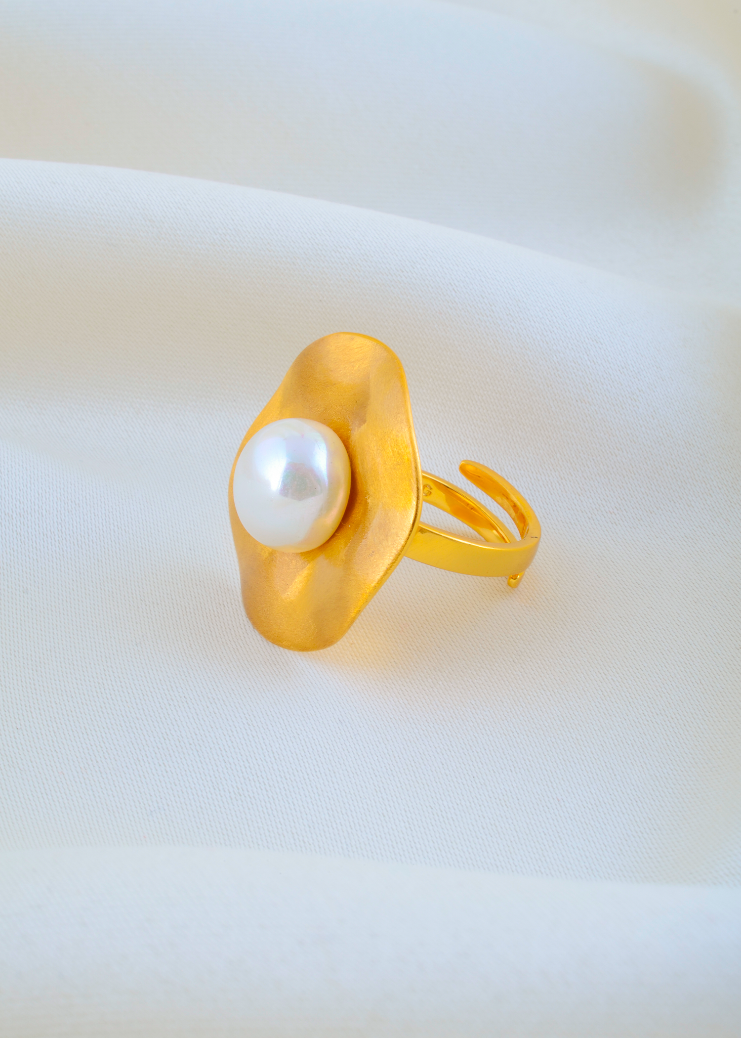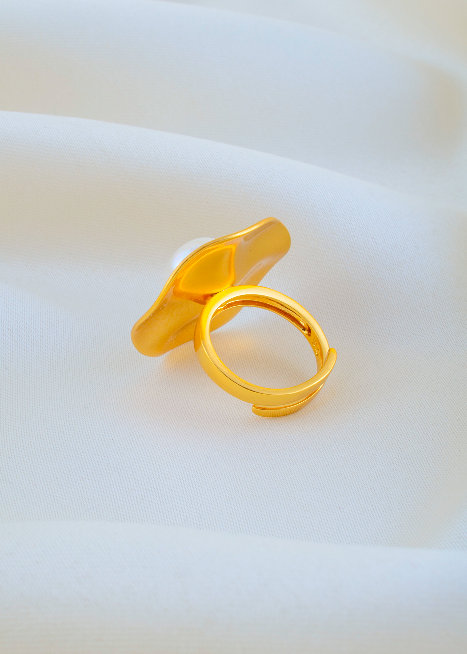 Elevate your everyday elegance with the Aurora Pearl Bloom Ring, a contemporary piece crafted in German silver and coated in a radiant yellow gold finish. The centerpiece is a luminous pearl set atop an abstract floral-inspired design, blending modern artistry with timeless charm. Its adjustable band ensures a perfect fit for any finger, making it as comfortable as it is captivating. Ideal for both minimal chic and festive looks, this ring adds a graceful touch to any ensemble.