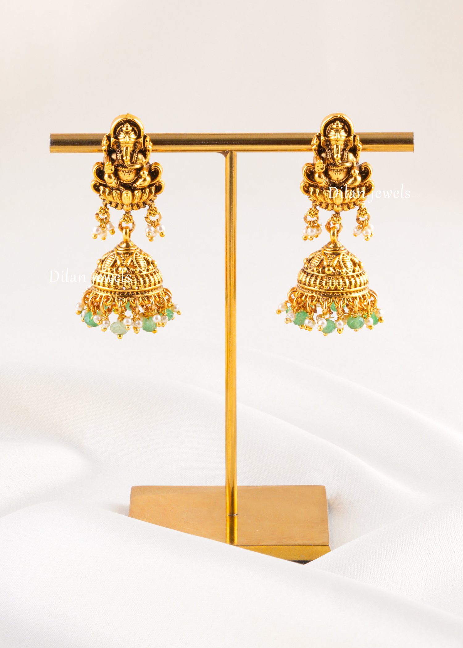 Regal German silver necklace set featuring an intricately sculpted Ganesha pendant and matching temple‑style jhumka earrings. The double-strand green beaded chain is accented with gold-tone spacers, leading to a detailed Ganesha motif framed by ornate floral scrollwork and dainty dangling beads. Coordinated jhumkas mirror the deity design, crowned with miniature Ganesha tops and finished with clusters of soft green and pearl-like beads. Lightweight yet grand, this sacred statement set is perfect for festive pujas, weddings, and traditional celebrations, bringing divine grace and auspicious charm to every ensemble.