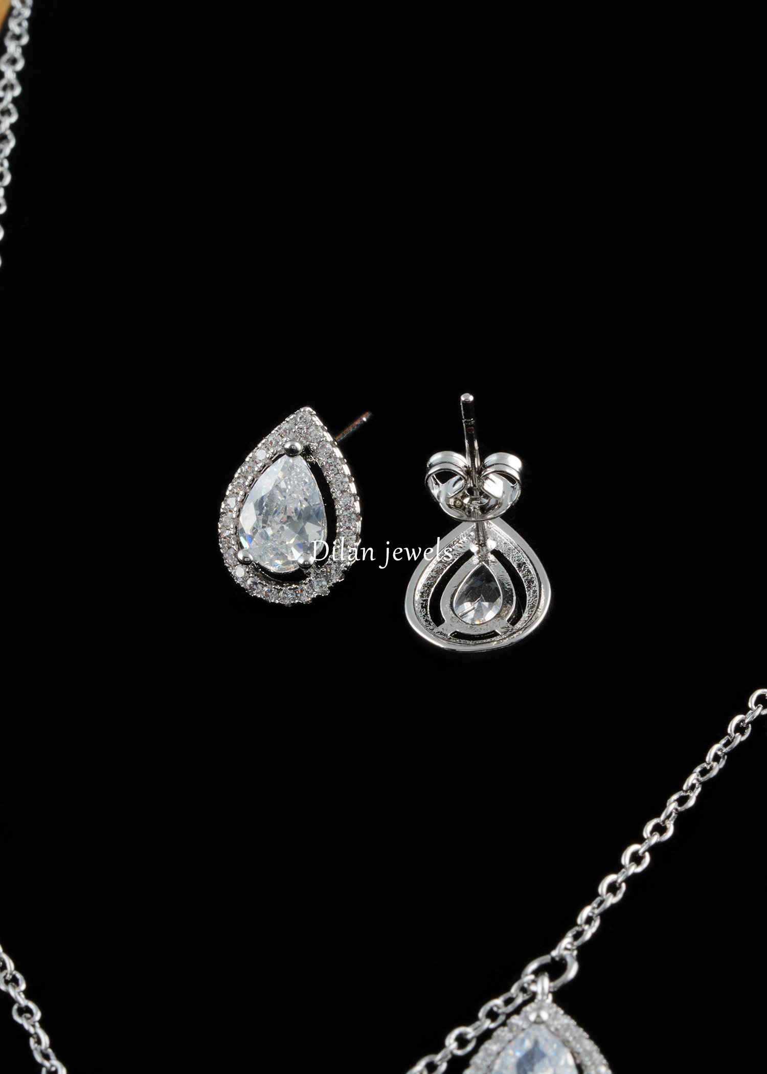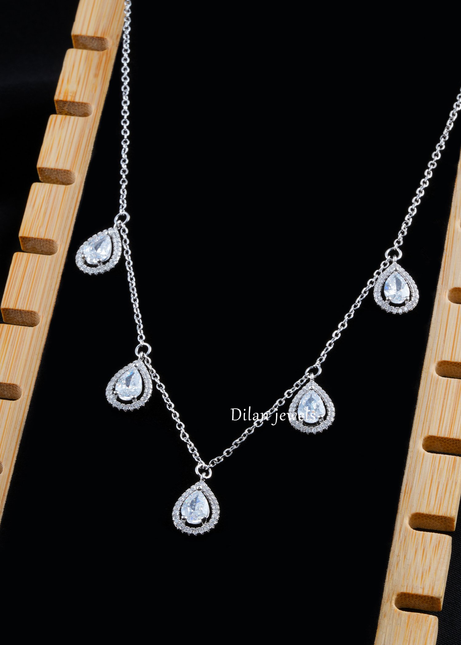 Enhance your jewelry collection with this elegant German silver necklace set, adorned with AAA quality American diamonds for a radiant and graceful finish. Featuring delicate pear-shaped drop motifs beautifully placed along the chain, this design offers a perfect blend of minimal charm and timeless sophistication. Paired with matching earrings, this set is ideal for parties, festive occasions, weddings, and evening wear. Its lightweight feel and refined sparkle make it easy to style with both ethnic and western outfits, adding a polished and luxurious touch to your overall look.