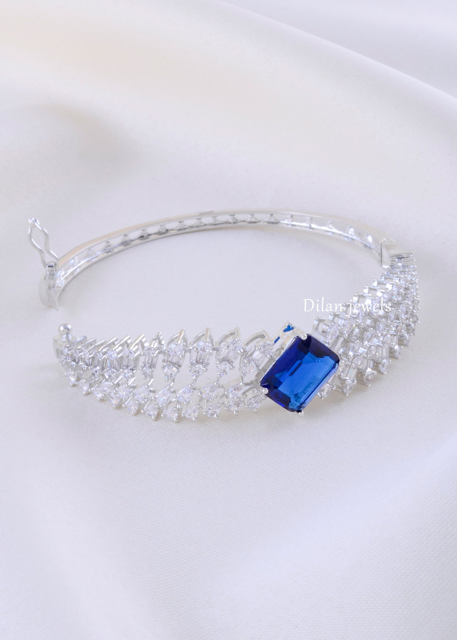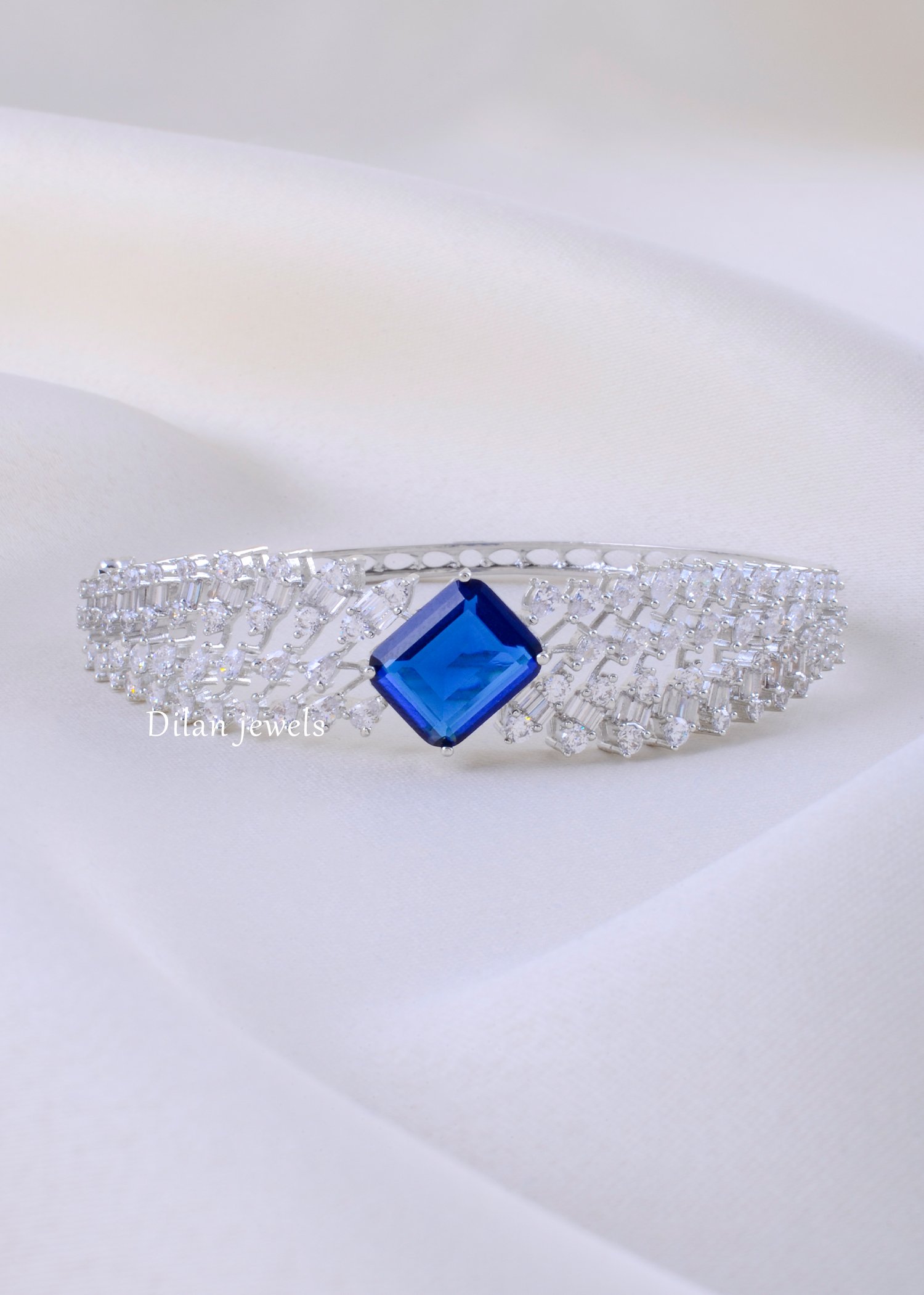 Make a refined statement with this elegant bracelet crafted in premium German silver, featuring a striking cushion-cut sapphire-blue centerpiece framed by AAA-quality American diamonds. The dazzling multi-row diamond lattice creates a graceful “drift” pattern on both sides, adding depth, sparkle, and a modern couture feel. Finished in a sleek silver tone, this bracelet offers a comfortable fit with a secure clasp, making it perfect for day-to-night styling. Ideal for weddings, cocktail evenings, and festive wear, it delivers timeless glamour with a contemporary edge.