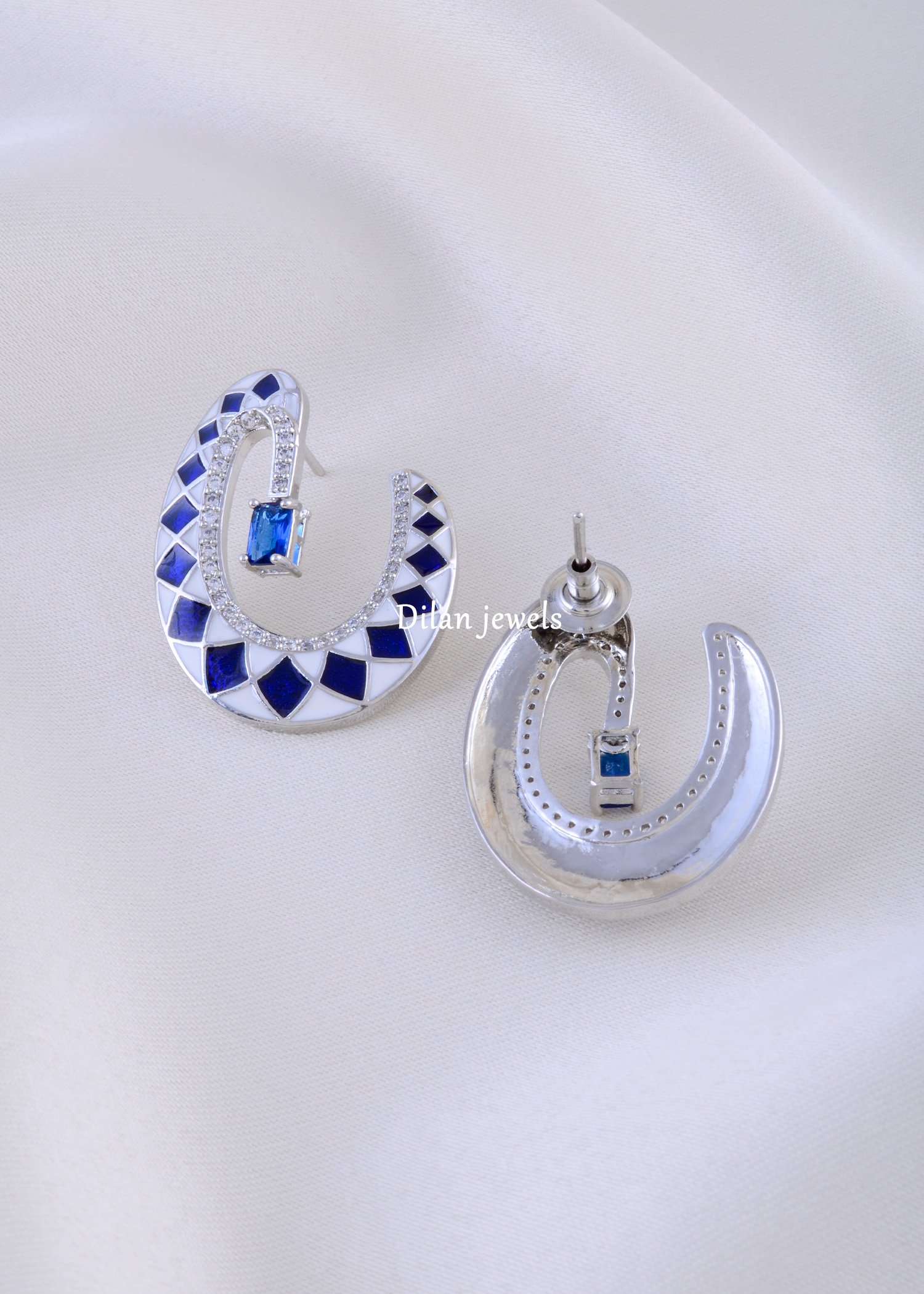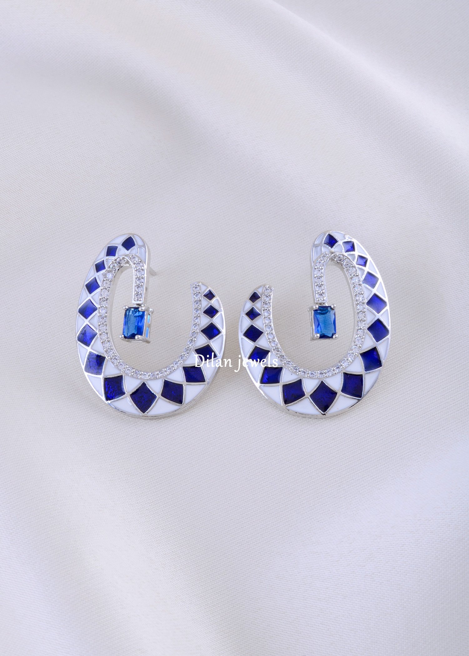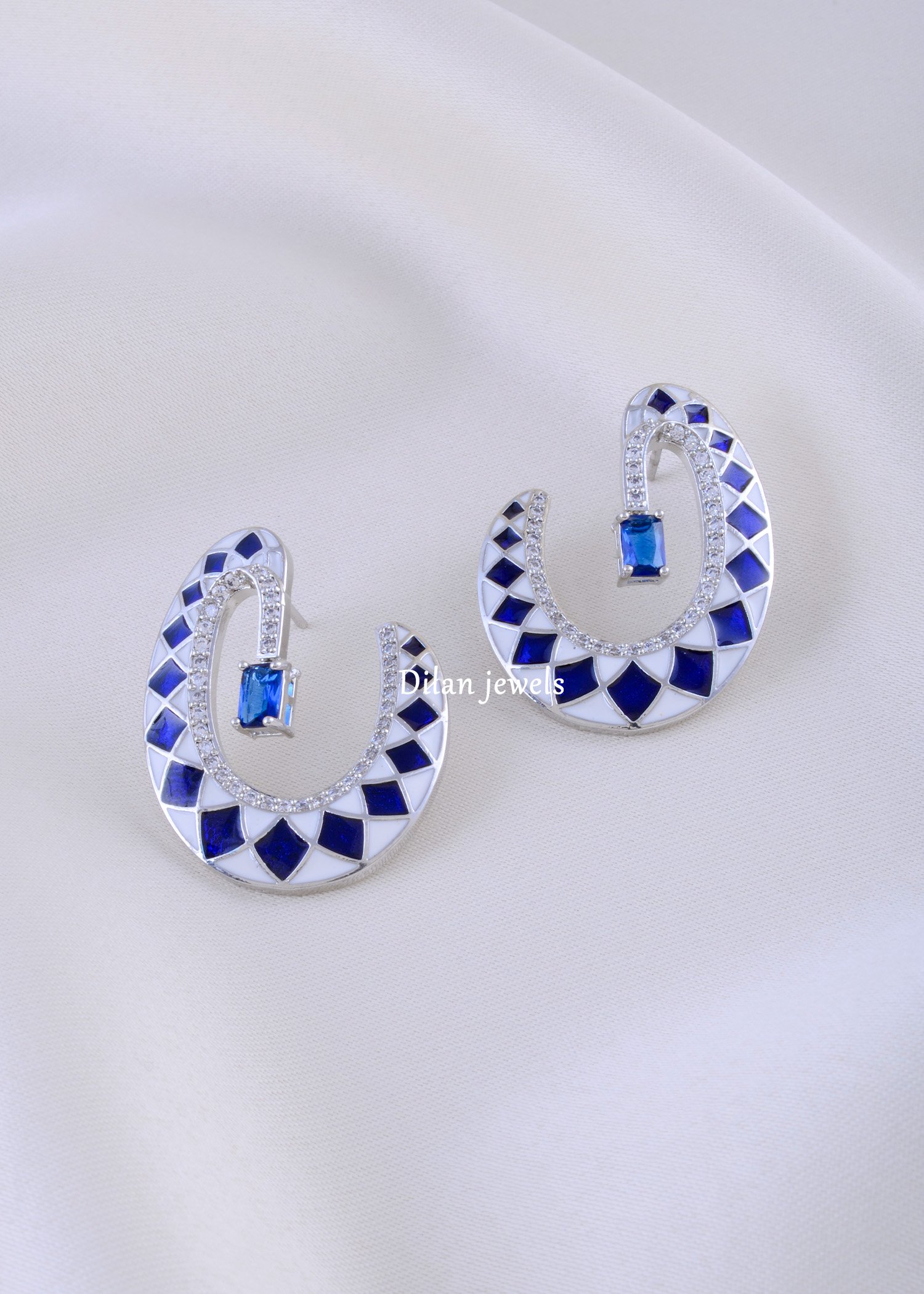 These stunning designer earrings are crafted in premium German Silver and embellished with AAA Quality American Diamonds for an elegant sparkle. Featuring a unique mosaic-inspired design in royal blue and white enamel, they combine contemporary artistry with luxurious detailing. The center sapphire-blue stone adds a rich pop of color, making them a perfect statement accessory for festive occasions, parties, and evening wear. Lightweight, stylish, and eye-catching, these earrings are designed for women who love bold and beautiful jewellery. Elevate any outfit effortlessly with this modern yet timeless pair.