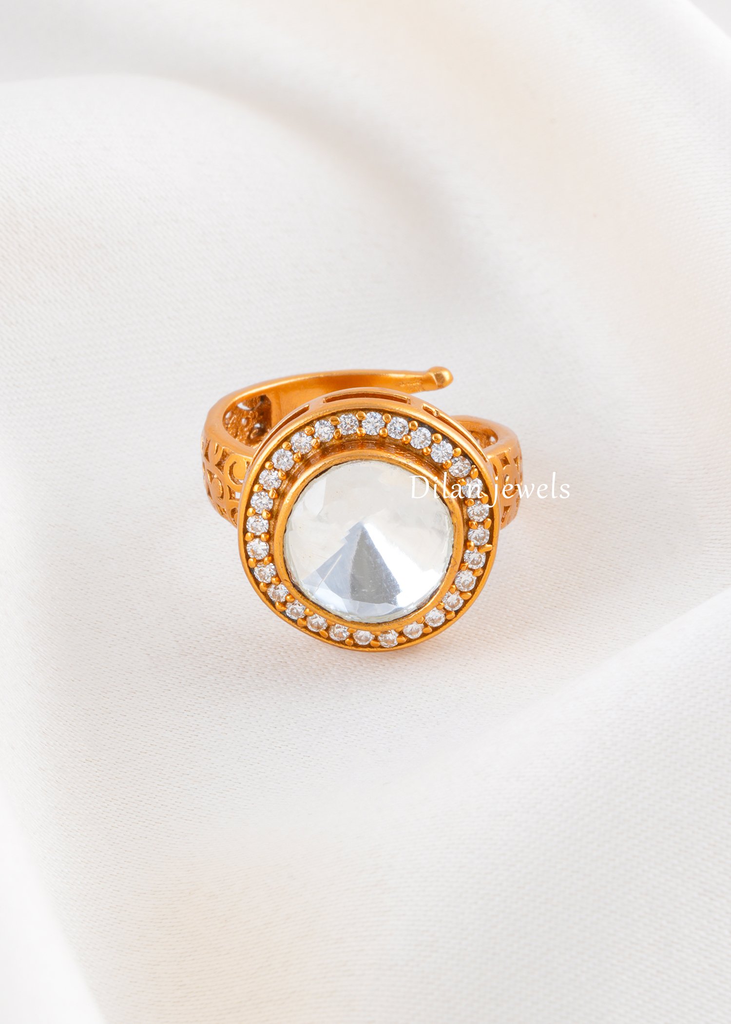 Add instant glamour to your look with this statement ring crafted in German silver and finished in a rich gold-tone style. The design features a bold round-cut AAA Quality American Diamond in a sleek bezel setting, surrounded by a sparkling halo for extra brilliance. The open, adjustable band and intricate cutwork details give it a premium, airy feel while keeping it comfortable for long wear. Perfect for parties, festive outfits, and gifting—this ring shines beautifully from every angle.