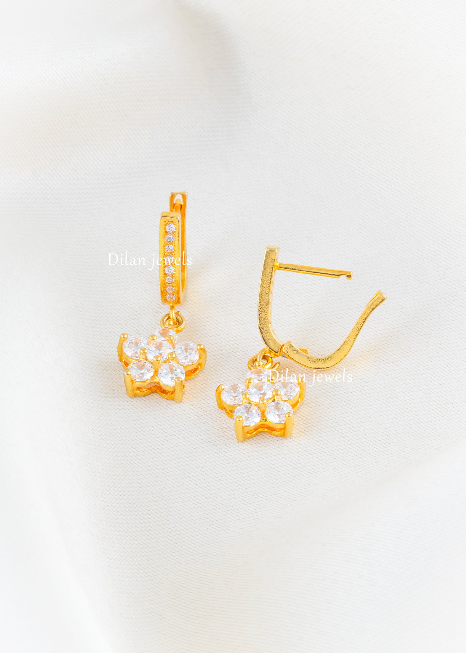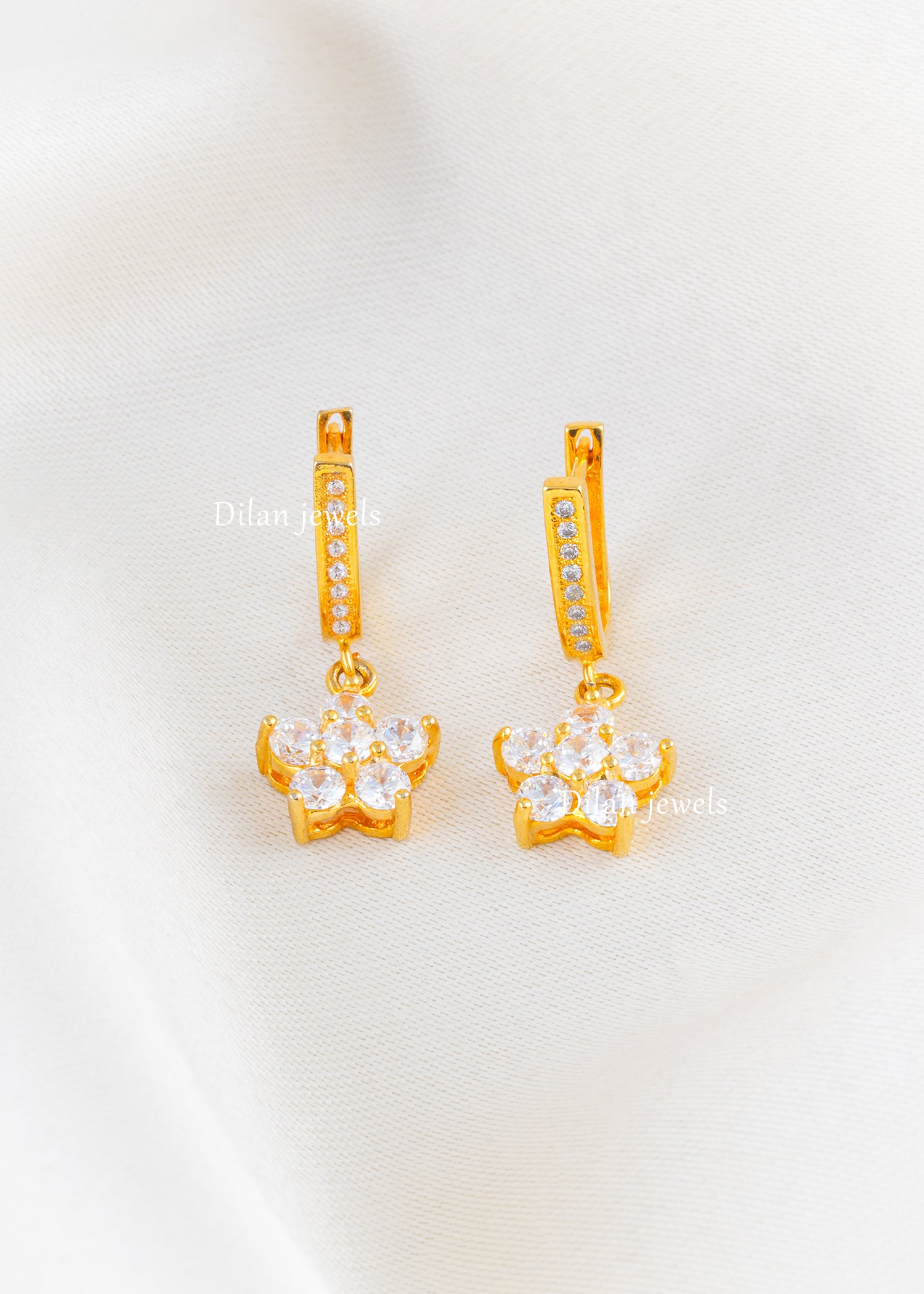 Elevate your everyday style with these stunning star-burst drop earrings, meticulously crafted in premium German silver. Each earring features a captivating star-shaped pendant adorned with sparkling AAA-grade American diamonds that catch light beautifully. The textured lever-back huggies in gleaming gold-plated German silver ensure comfort and secure wear for all-day elegance. Perfect for both casual occasions and special celebrations, these versatile pieces add a touch of sophistication to any ensemble. The intricate diamond arrangement creates a mesmerizing floral effect that complements modern and traditional aesthetics alike.