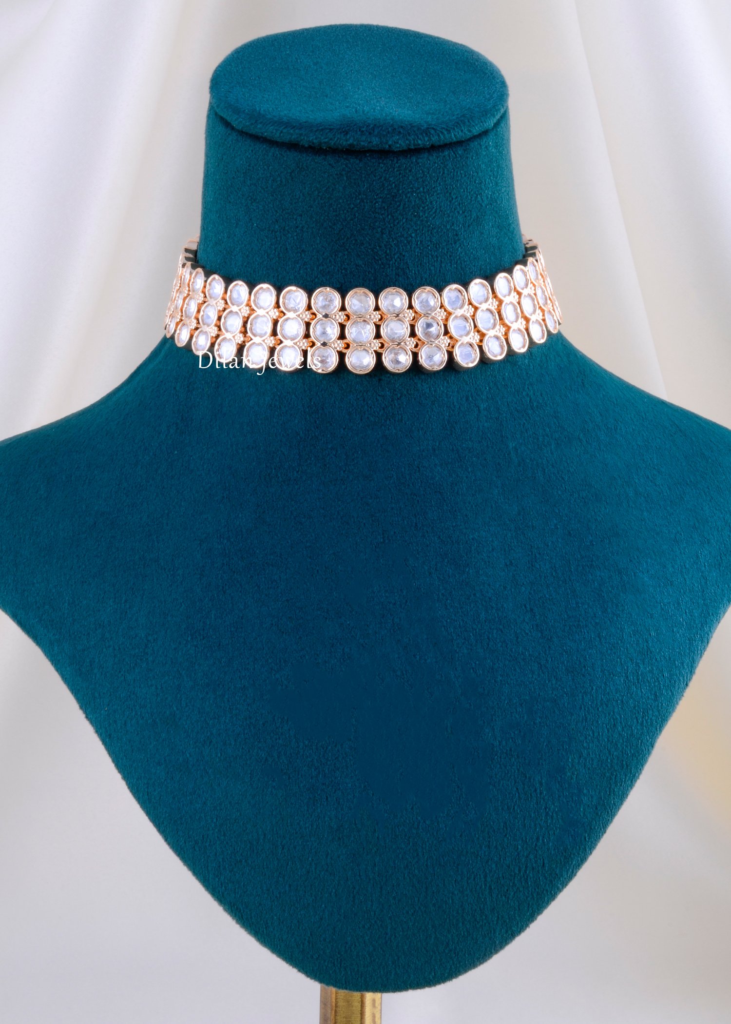 Embrace timeless elegance with this stunning Kundan Pulki choker necklace set, expertly crafted in premium German silver with gold finish. The design showcases a lustrous double row of luminous round Kundan stones intricately set in traditional bezels, creating a sleek yet regal collar that flatters the neckline. Paired with matching clustered floral Kundan stud earrings, this set epitomizes refined simplicity and sophisticated charm. Lightweight and supremely comfortable for extended wear, it seamlessly complements sarees, lehengas, and ethnic ensembles. Perfect for weddings, festivals, and celebrations, this heirloom-worthy piece exudes timeless grace and cultural richness.