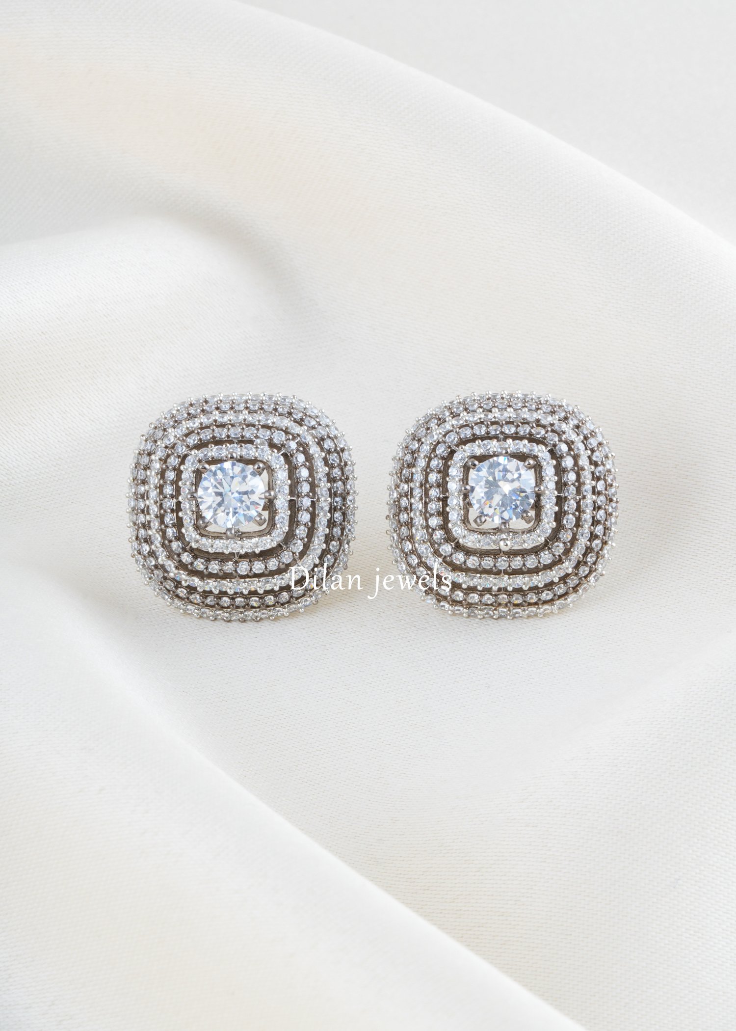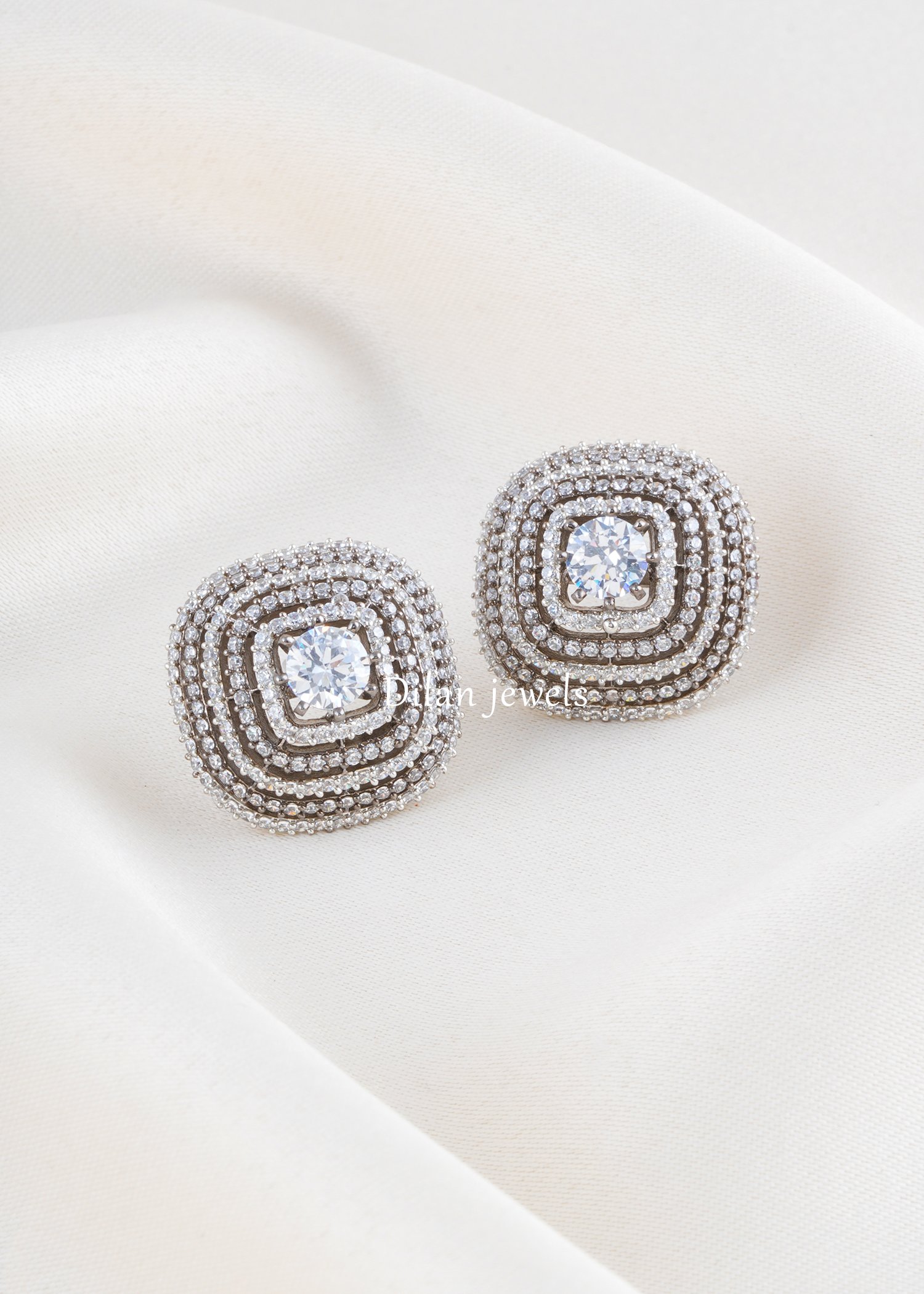 Showcase timeless sophistication with these captivating concentric square diamond earrings, expertly crafted in premium German silver. Each earring features a brilliant cushion-cut AAA-grade American diamond centerpiece surrounded by multiple concentric halos of sparkling smaller diamonds, creating a stunning geometric illusion of depth and dimension. The post-back closure ensures secure, comfortable wear throughout the day. Perfect for engagements, weddings, or as a luxury investment piece, these statement studs radiate elegance and refined taste. The intricate layered design amplifies brilliance and fire, making them an absolute showstopper for anyone seeking understated glamour with maximum impact.