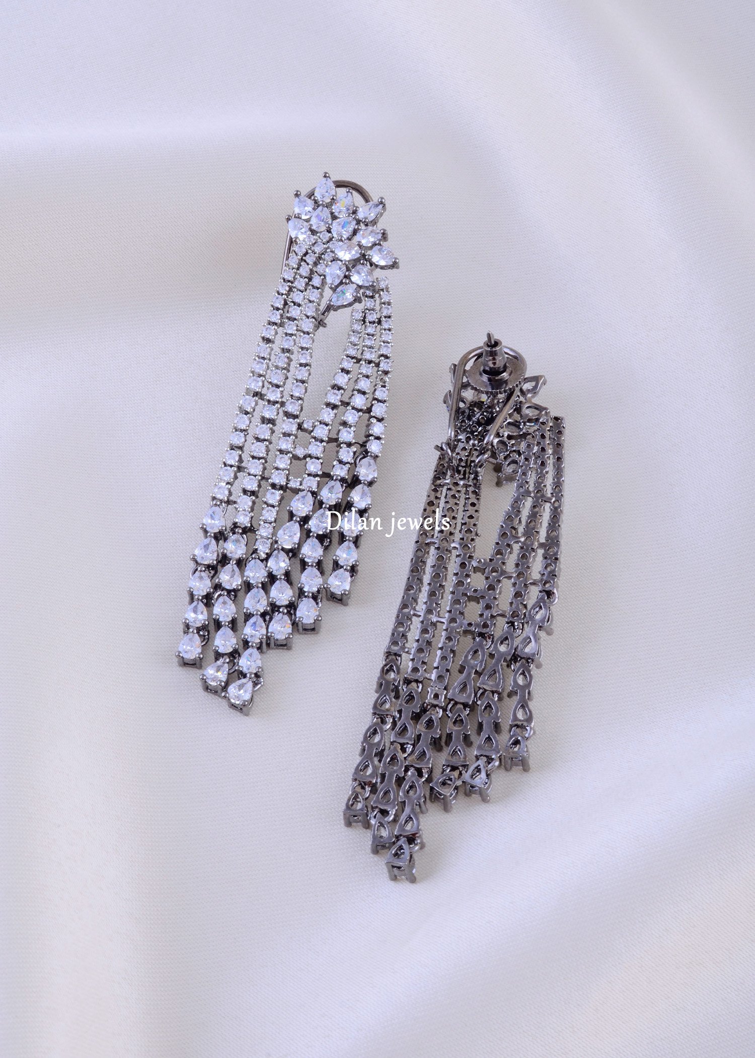 Add a luxurious sparkle to your look with these statement waterfall earrings crafted in high-quality German silver and studded with AAA-grade American Diamonds. Designed with an elegant floral top and cascading diamond strands, this pair delivers maximum shine with a lightweight, comfortable fit. The brilliant stones catch the light beautifully, making them perfect for weddings, cocktails, festive events, and evening wear. Style them with Indian or Western outfits for a glamorous finish. These premium-quality earrings offer lasting shine, anti-tarnish comfort, and a timeless fashion-forward appeal.