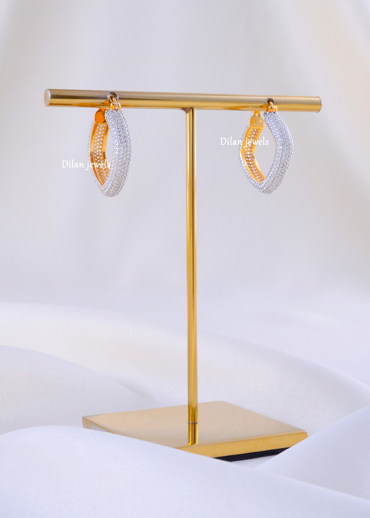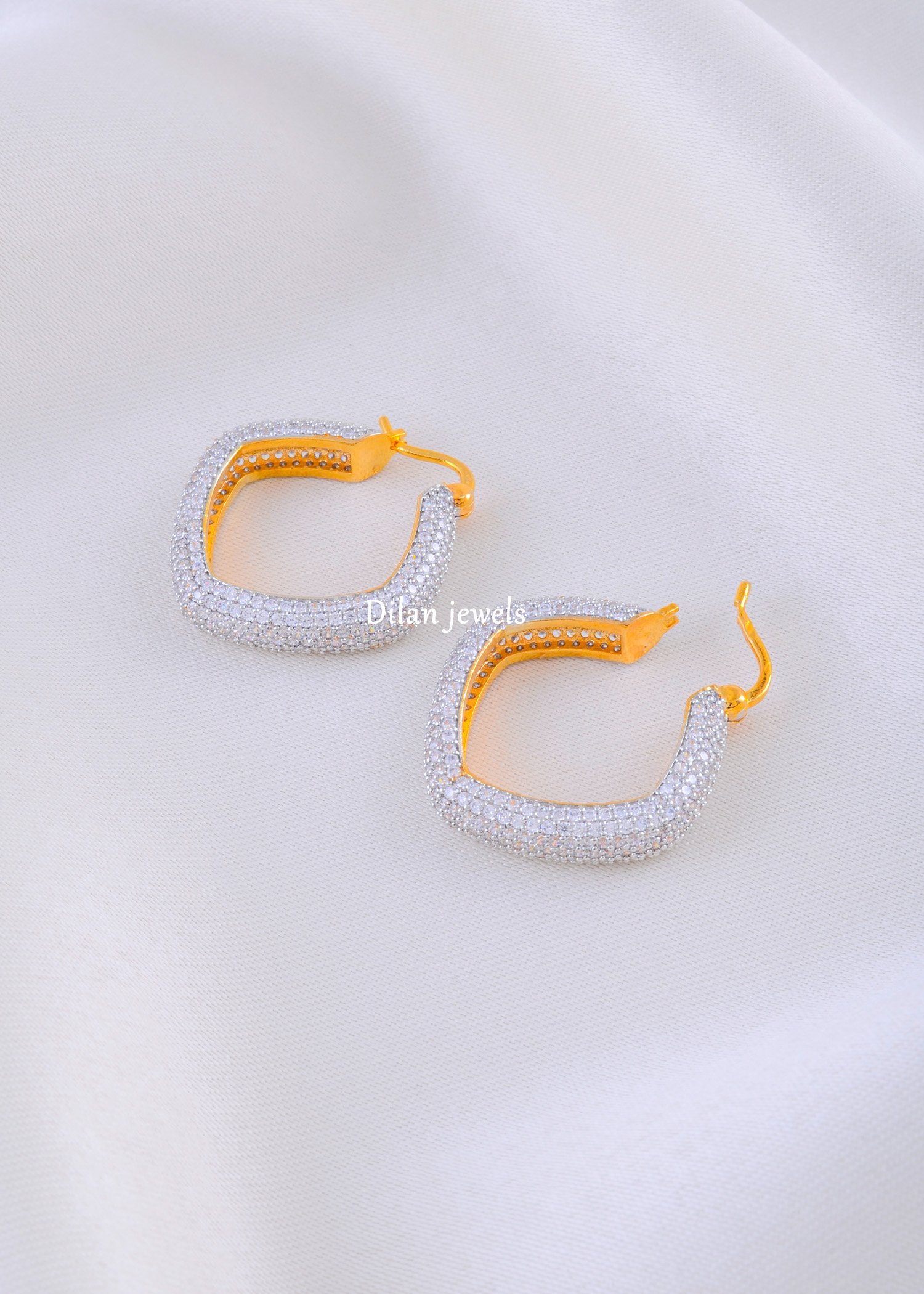 These elegant hoop earrings are crafted in premium German silver and encrusted with AAA-quality American diamonds for a stunning, high-shine finish. The sleek, elongated design offers a modern twist on classic hoops, making them perfect for both everyday wear and special occasions. Their fine craftsmanship ensures a luxurious sparkle from every angle, while the lightweight structure provides maximum comfort. Whether styled with ethnic outfits or contemporary looks, these diamond-studded hoops add effortless sophistication and timeless charm to your jewellery collection.
