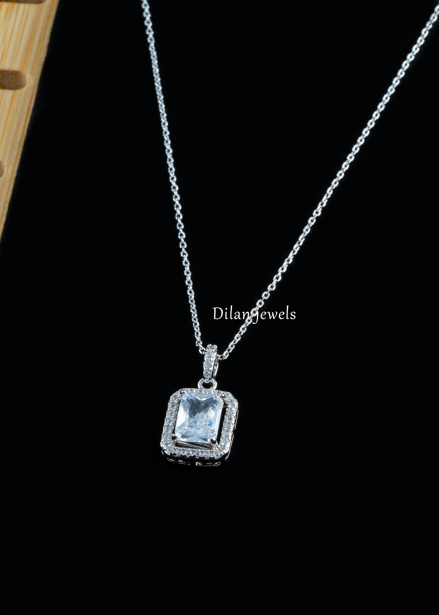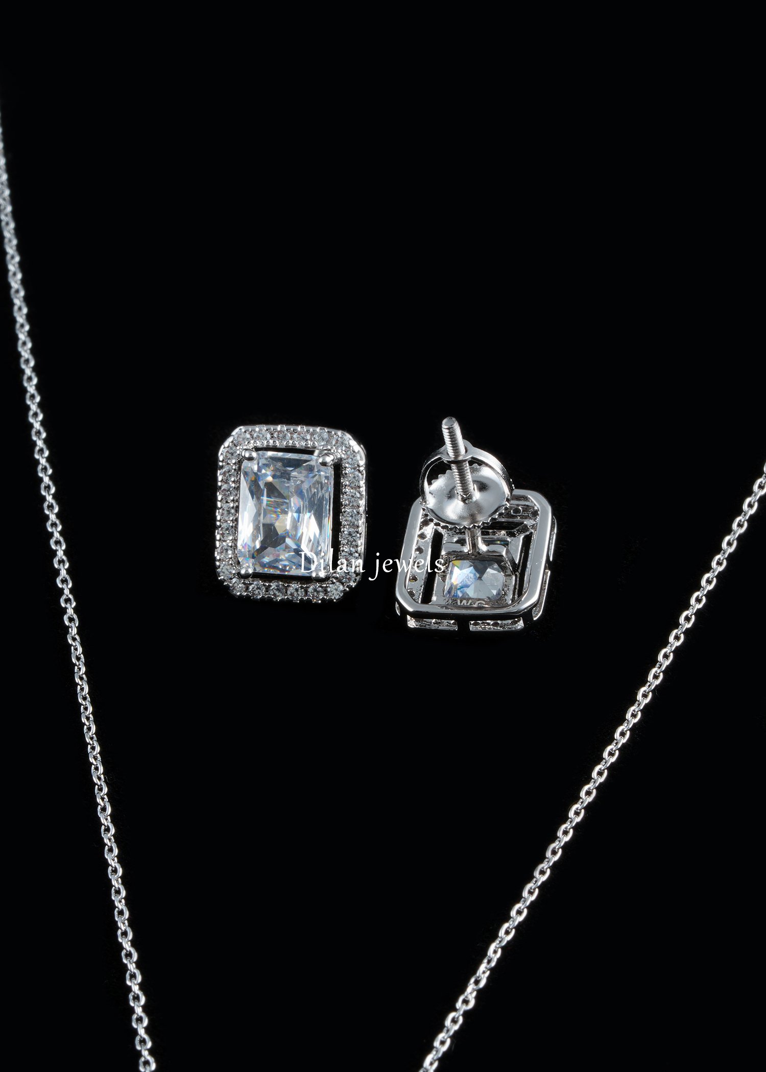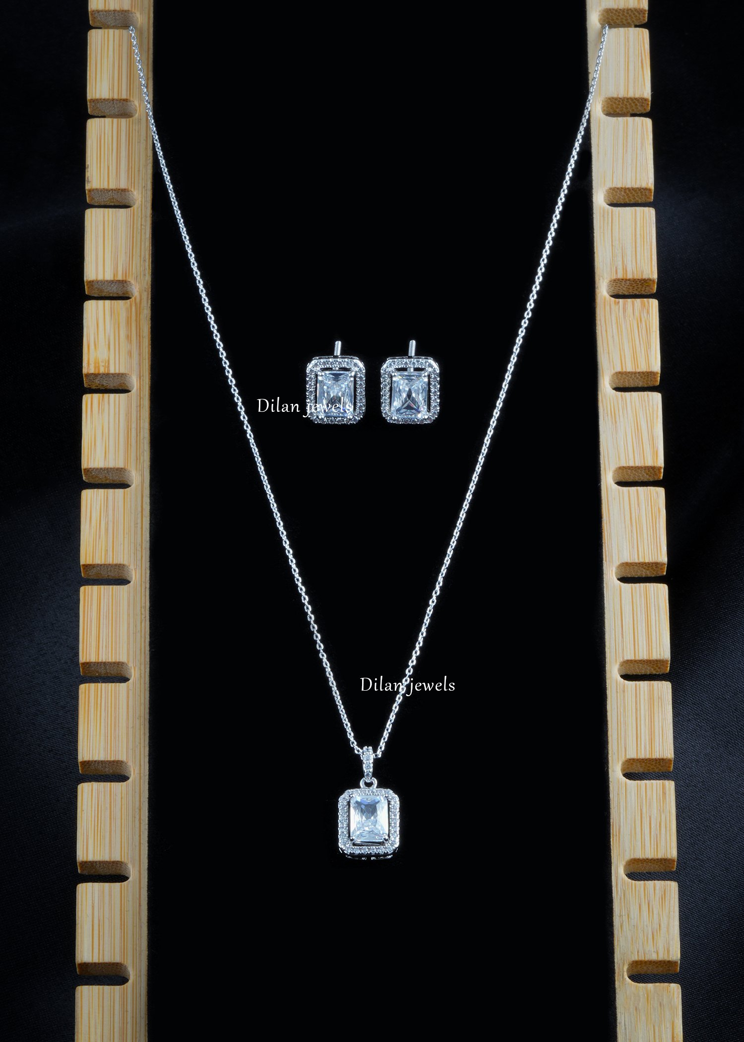 Elegant and eye-catching, this German silver necklace set is adorned with AAA quality American diamonds for a brilliant, luxurious sparkle. Featuring a refined rectangular centerpiece design with a halo-style stone border, this set brings a modern yet timeless charm to your jewelry collection. The matching pendant and stud earrings create a polished, coordinated look that is perfect for parties, festive occasions, dinners, and gifting. Lightweight, versatile, and graceful, this set adds a sophisticated sparkle to both ethnic and western outfits.