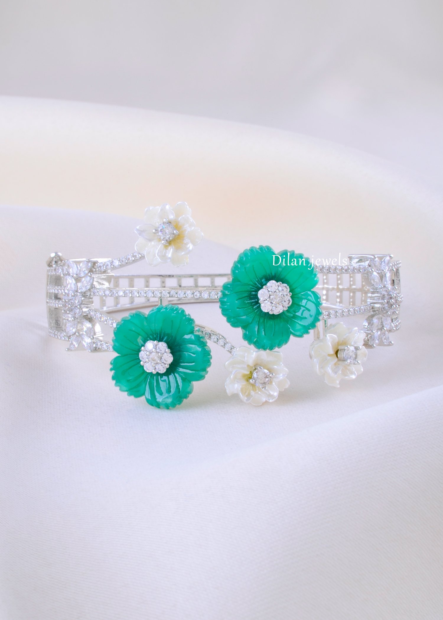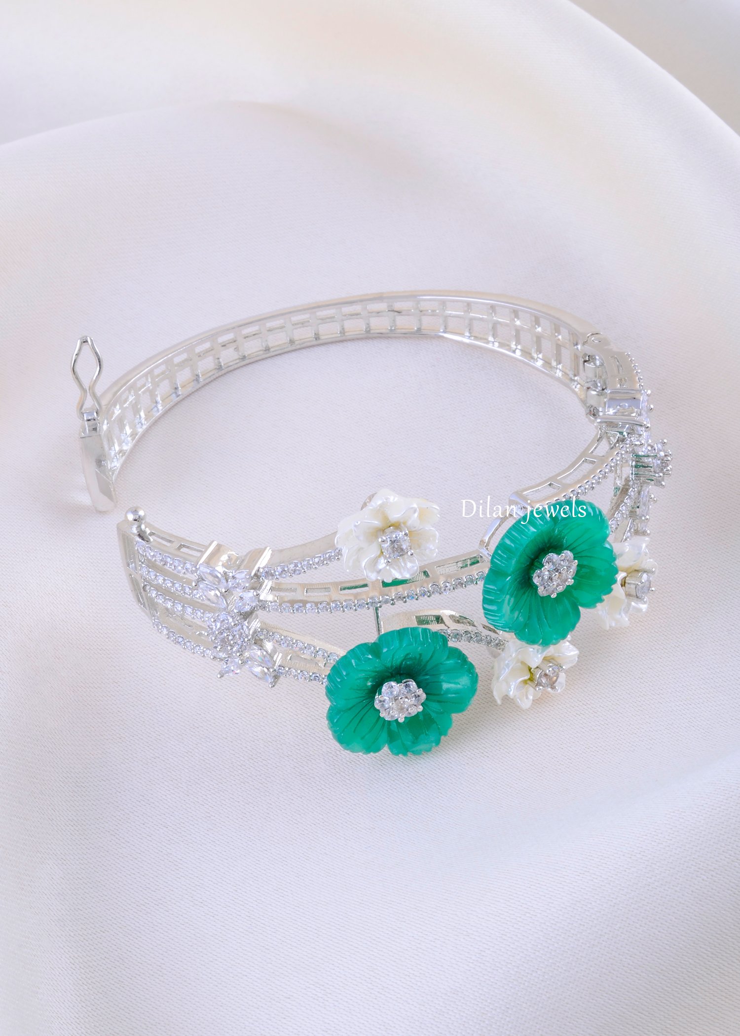 Celebrate nature’s beauty with this enchanting bracelet crafted in premium German silver, featuring hand-carved emerald and pearl flower petals adorned with AAA-quality American diamonds. Each delicate blossom is meticulously designed with gleaming diamond centers that sparkle brilliantly. The alternating pattern of rich green emerald blooms and creamy white pearl flowers creates a harmonious balance of color and sophistication. The adjustable design with secure clasp ensures comfortable daily wear or special occasion elegance. This botanical-inspired piece brings timeless grace and refined femininity to any ensemble, perfect for nature lovers and jewelry connoisseurs.