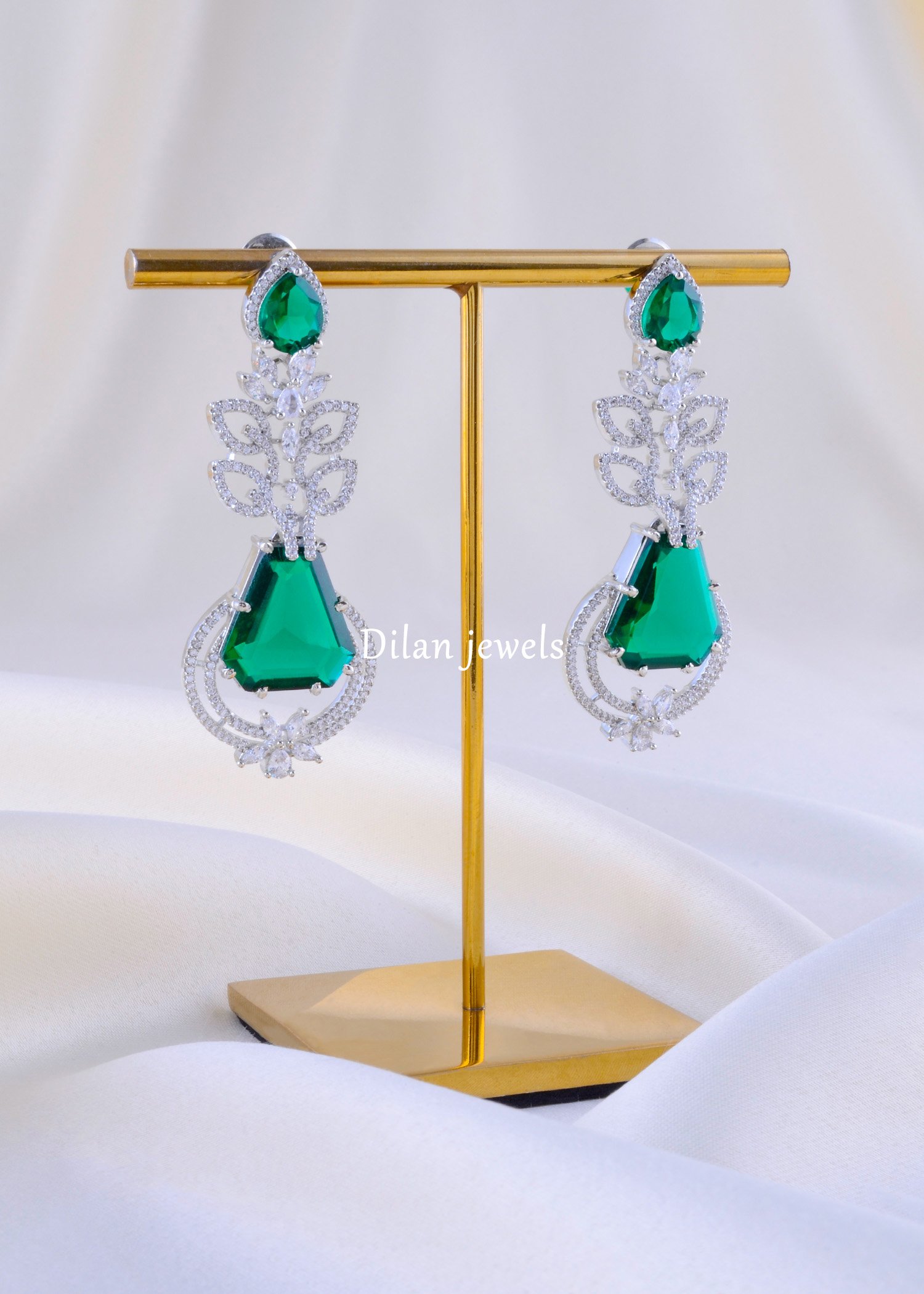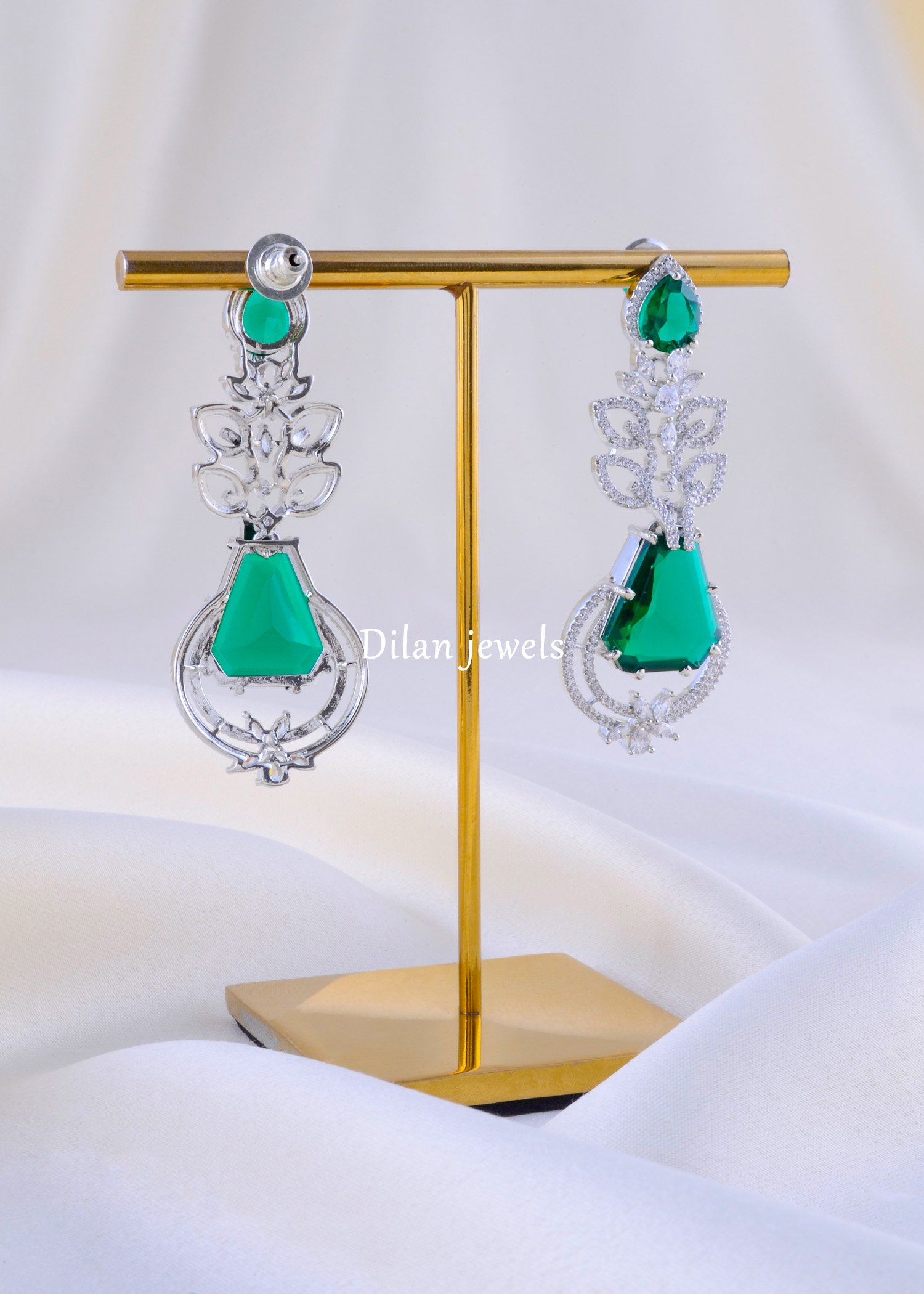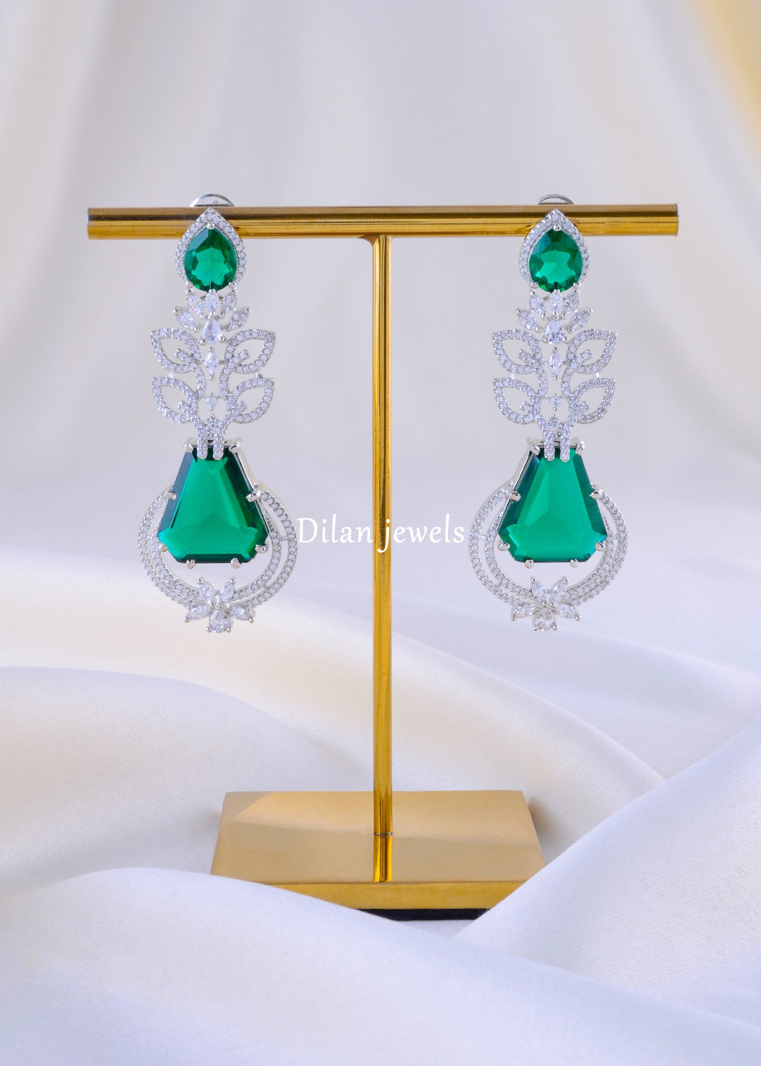 Radiate sophistication with these breathtaking Emerald Green Drop Earrings, expertly crafted from durable German Silver. The design features a vibrant pear-shaped green stud that cascades into a delicate, leaf-inspired framework, fully encrusted with shimmering AAA quality American Diamonds. The centerpiece is a striking geometric green crystal suspended at the bottom, embraced by a dazzling horseshoe halo of zirconia. The cool silver finish perfectly complements the deep emerald tones, making these lightweight statement earrings the ultimate accessory for cocktail parties, receptions, or adding a touch of modern luxury to your evening wear.