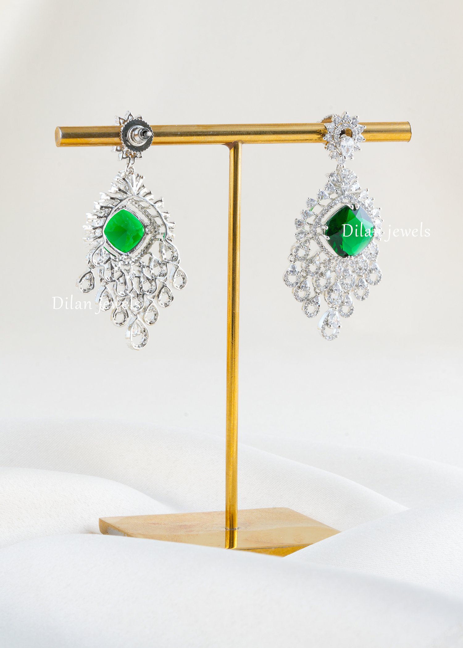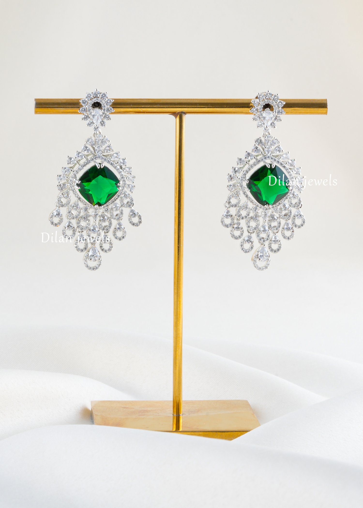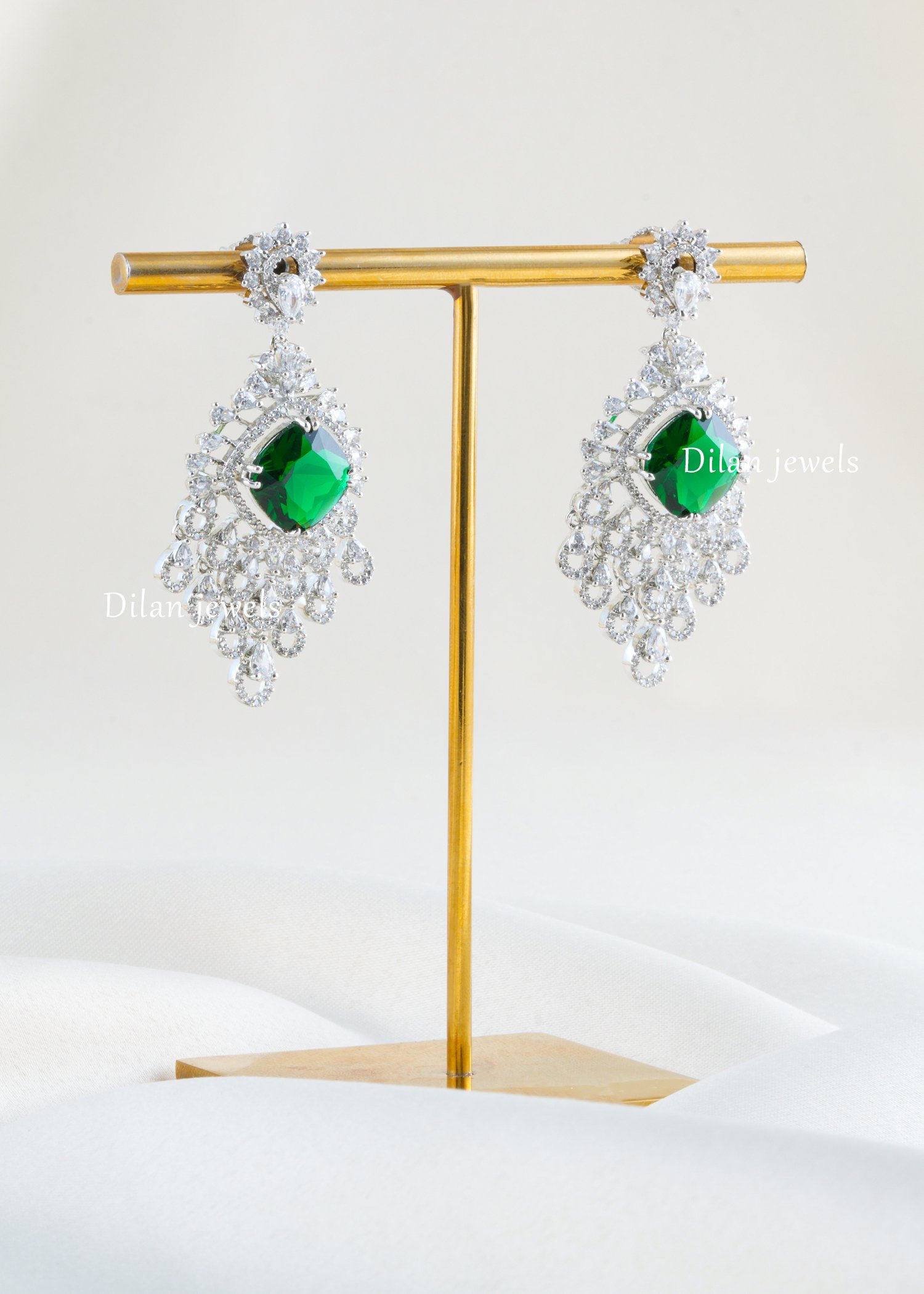 Enchant with botanical brilliance through these breathtaking emerald peacock chandelier earrings, expertly crafted in premium German silver with lustrous finish. The design features a stunning cushion-cut emerald gemstone as the focal point, crowned with an exquisite ornate halo and cascading teardrop diamonds forming an intricate peacock-inspired pattern. AAA-quality American diamonds create luminous sparkle throughout the design. The vibrant emerald beautifully contrasts with shimmering diamond accents, while the flowing silhouette creates dramatic movement and elegance. Perfect for weddings and special occasions, these statement pieces exude timeless luxury, opulence, and contemporary sophistication.