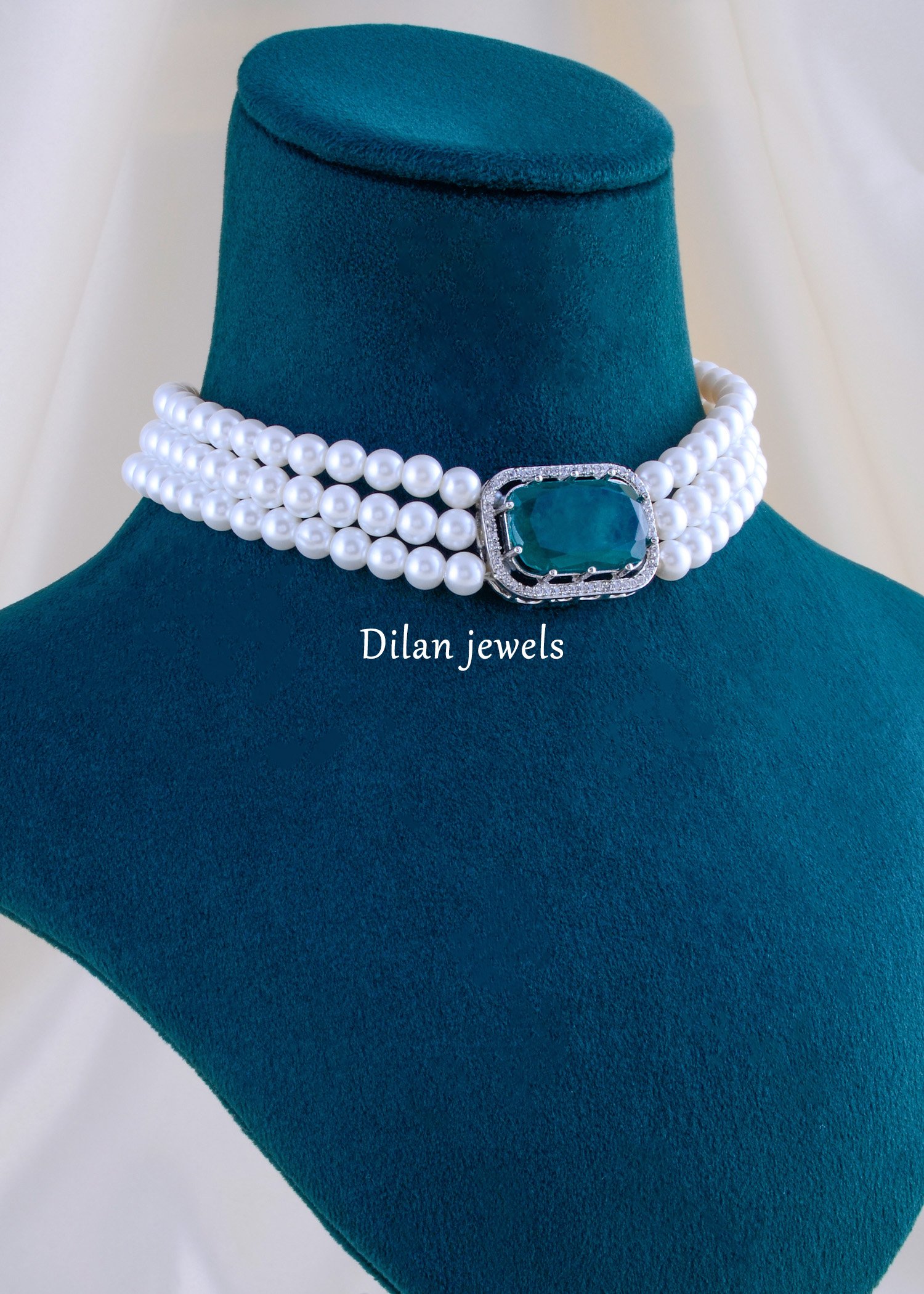 Elevate your elegance with this exquisite choker necklace set by Dilan Jewels, meticulously crafted in premium German silver. The design features a radiant centerpiece embellished with a striking color stone, framed by sparkling AAA quality American diamonds. The triple-layered pearl strands add a touch of sophistication and grace, making it the perfect blend of contemporary charm and timeless beauty. Paired with matching earrings, this set is ideal for weddings, cocktail parties, or festive celebrations — a statement piece that defines luxury and poise.