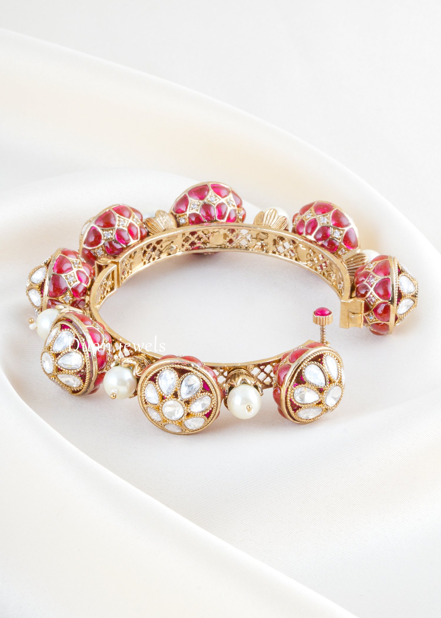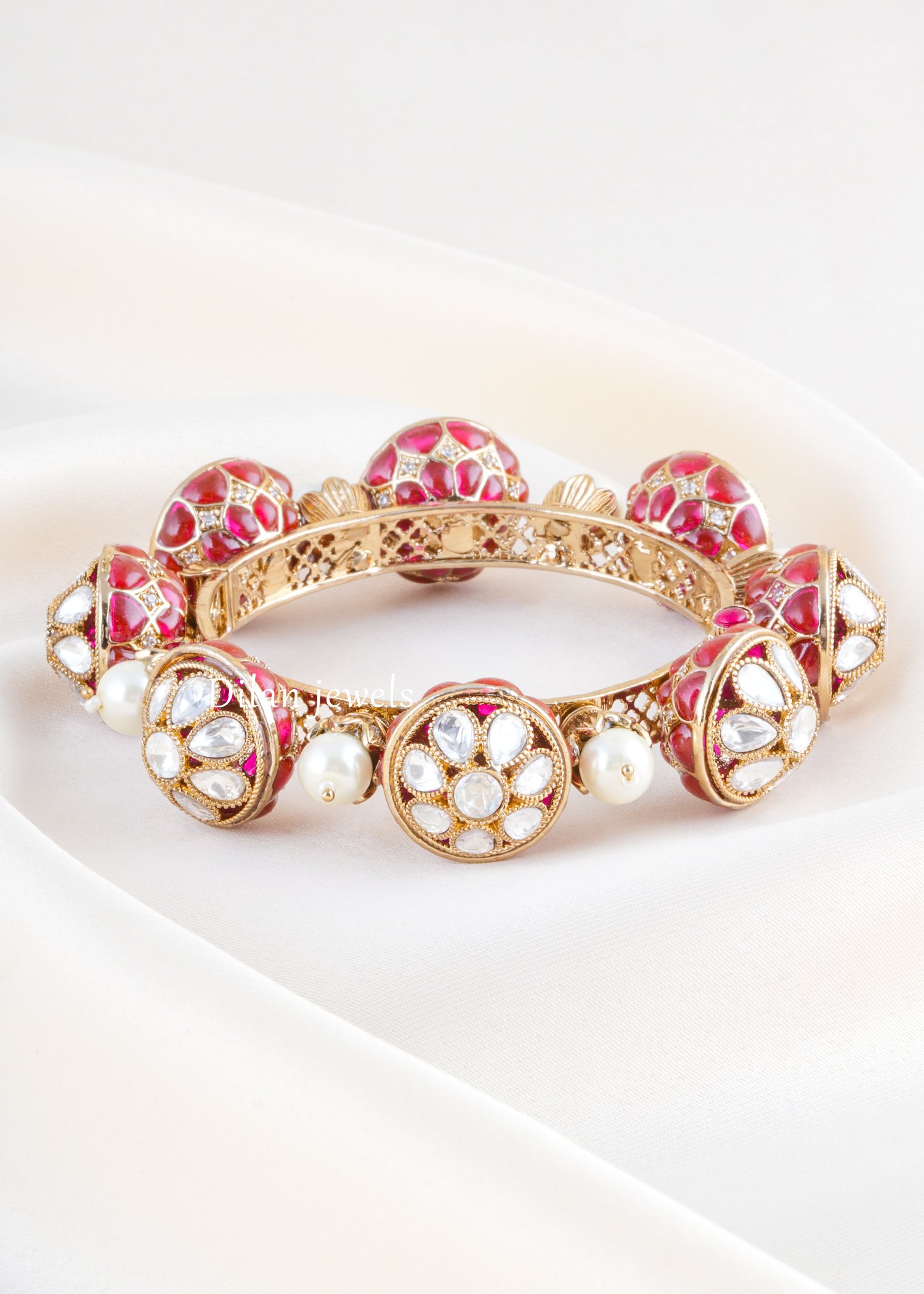 Exquisite German silver bangle bracelet featuring stunning kundan and pearl embellishments with rich ruby-red enamel detailing. This ornate piece showcases intricately carved spherical charms adorned with kundan stones and creamy white pearls, complemented by elegant circular medallion pendants accented with lustrous pearls. The finely crafted German silver band features detailed filigree work and scalloped ornamental finials, creating a regal aesthetic. The vibrant ruby-red enamel contrasts beautifully with the precious stone settings, evoking traditional Indian bridal elegance. Perfect for weddings, festivals, or special occasions, this heirloom-quality bracelet combines timeless artistry with luxurious materials, making it an unforgettable statement piece.