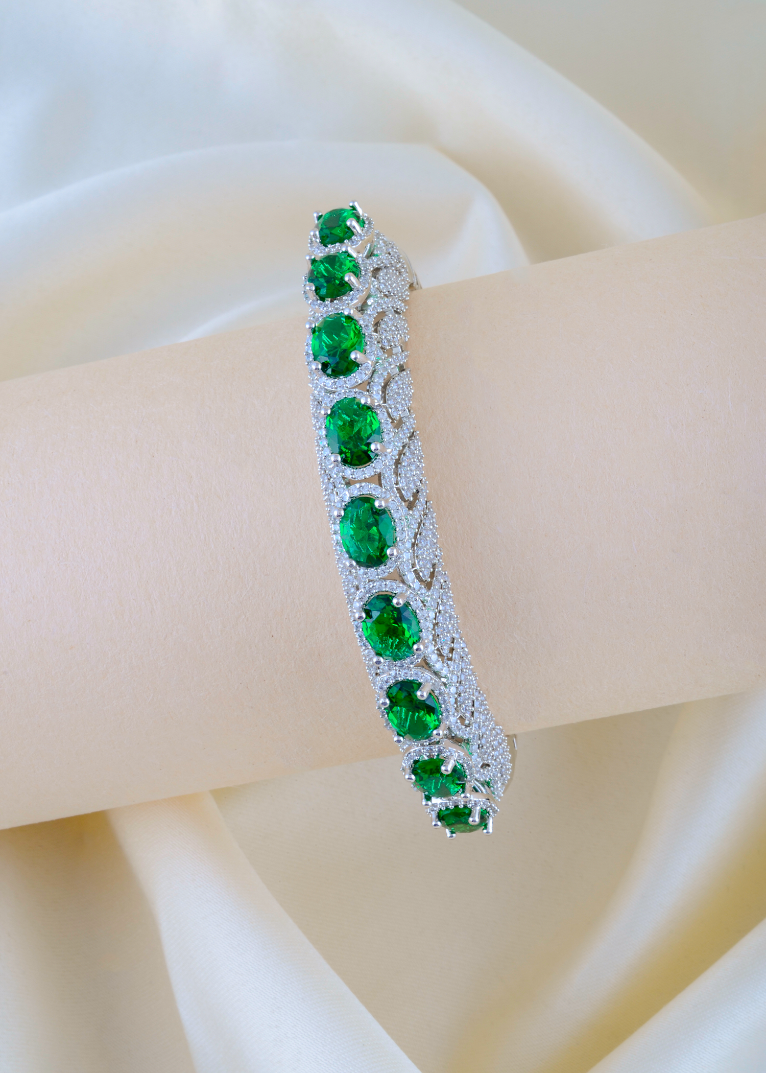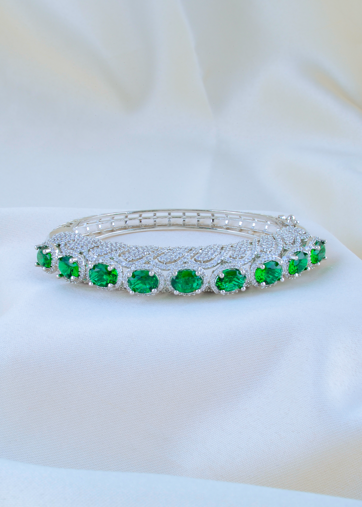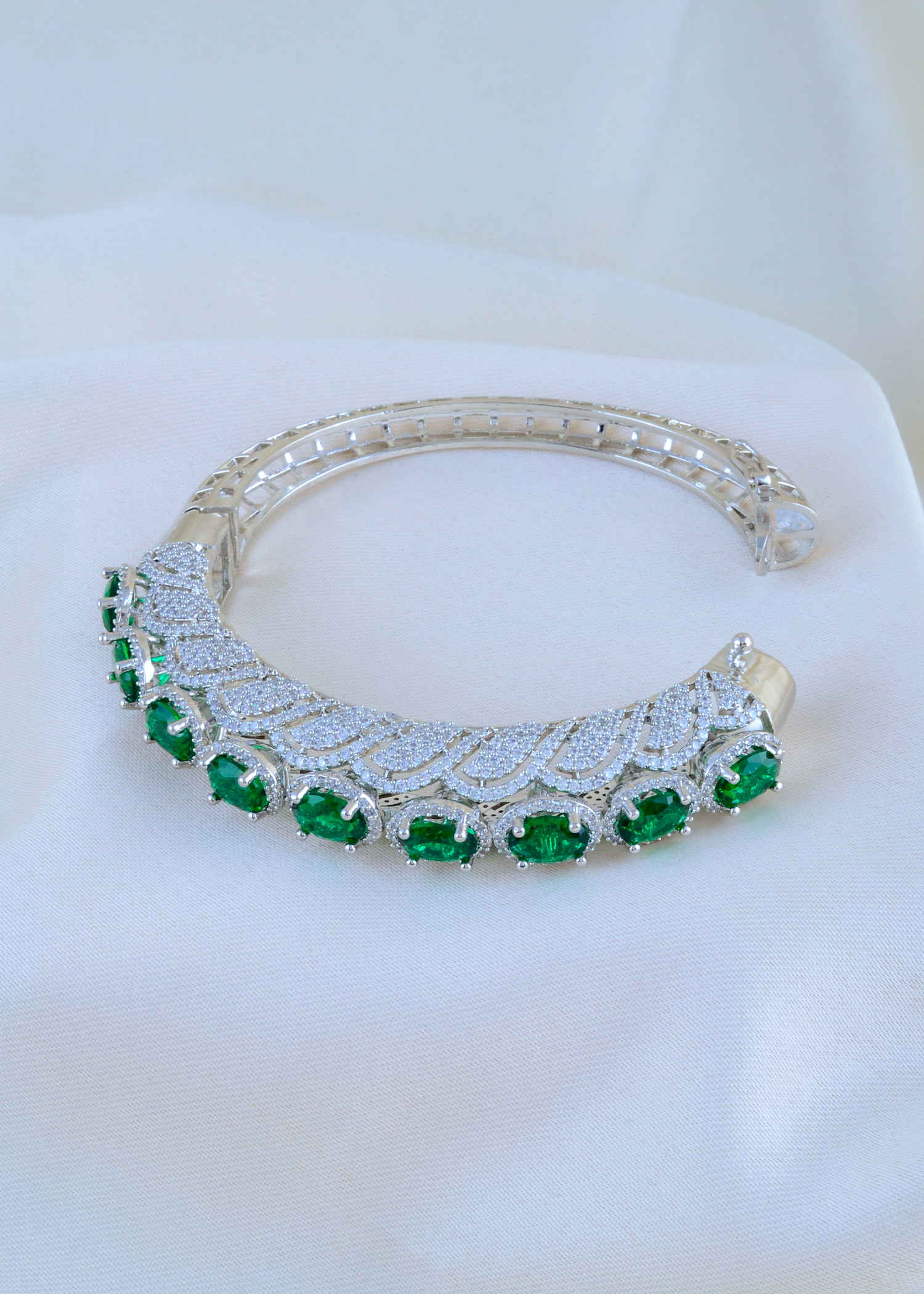 Elevate your wristwear with this openable bracelet, exquisitely crafted in German silver and adorned with dazzling AAA-quality American diamonds. Featuring vivid green stones set in an intricate diamond-studded design, this piece effortlessly merges traditional grandeur with modern sophistication. Built for comfort and durability, it offers a secure fit and timeless appeal. With a lifetime guarantee on stones, this bracelet is not just an accessory—it’s a lasting statement of luxury and elegance. Ideal for weddings, festive occasions, or premium gifting.