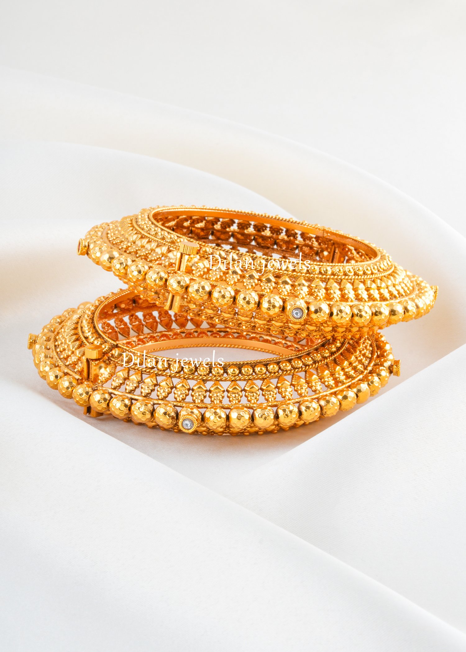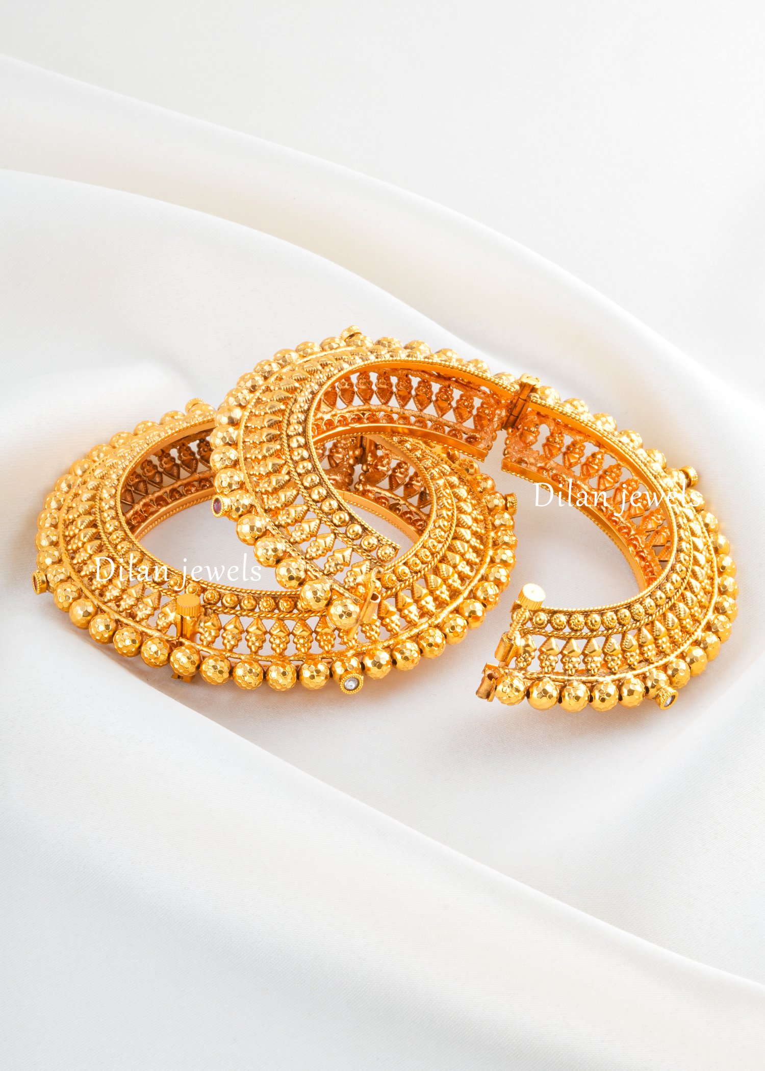 Elevate your wrist with this stunning set of intricately designed bangles crafted in premium German silver with luxurious gold plating. Each bangle features elaborate filigree patterns complemented by decorative beaded embellishments that create a rich, textured surface with exceptional visual depth. The open-ended design ensures comfortable fit for varied wrist sizes while maintaining secure wear. Perfect for weddings, festivals, and special occasions, these traditional-inspired pieces radiate ethnic elegance and timeless beauty. The meticulous craftsmanship and ornamental detailing make this set an ideal choice for brides and those seeking statement jewelry. Stack them for maximum impact or wear individually for versatile styling options that enhance any ensemble.