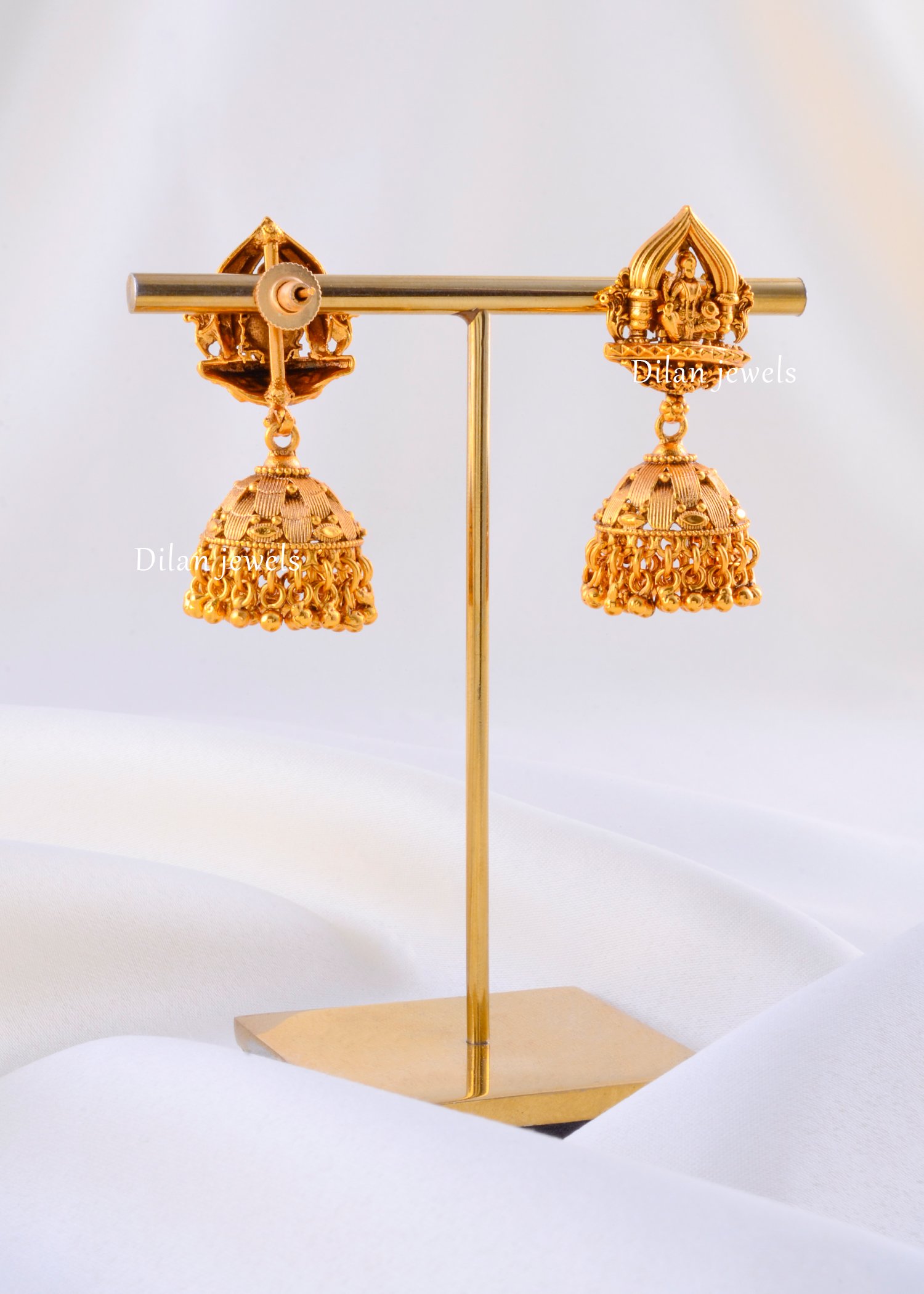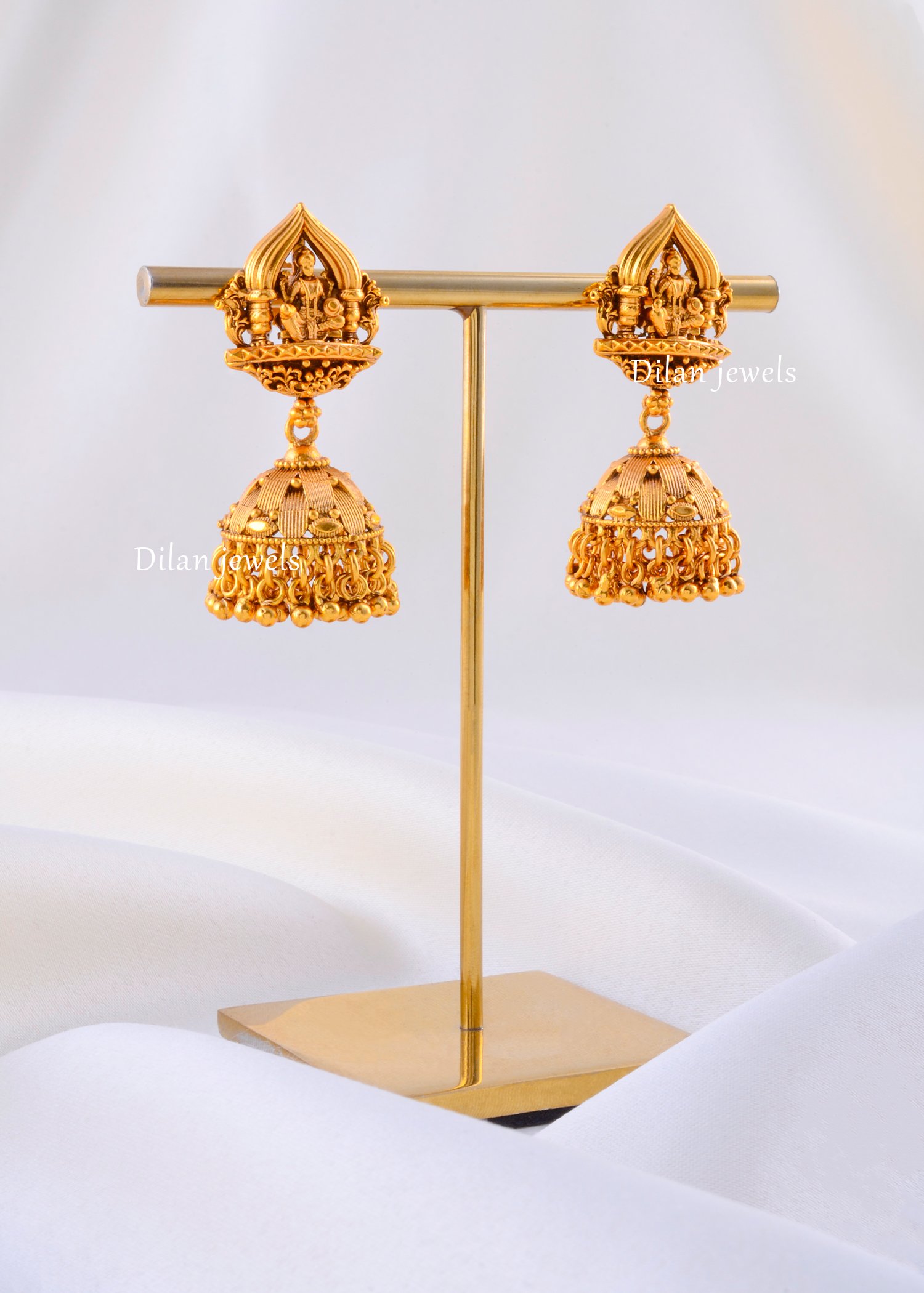 Embrace the divine charm of tradition with these exquisite gold-plated jhumka earrings, expertly crafted from high-quality German Silver. The design features a beautifully detailed stud showcasing a seated Goddess Lakshmi, symbolizing prosperity and grace, framed within an elegant arch. Suspended below is a classic jhumka dome, adorned with intricate patterns and delicate gold bead danglers that add movement and elegance. The rich matte gold finish gives them an antique, heritage look, making them a perfect accessory for weddings, festive occasions, and traditional celebrations. Lightweight yet striking, these earrings effortlessly elevate any ethnic ensemble.