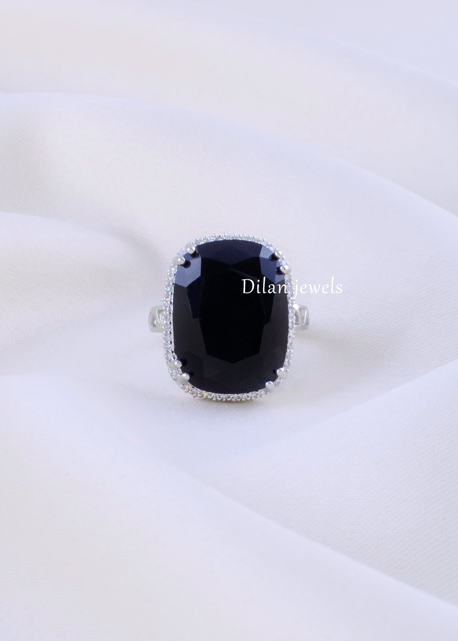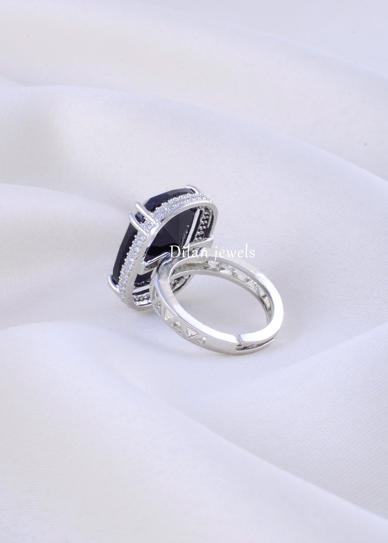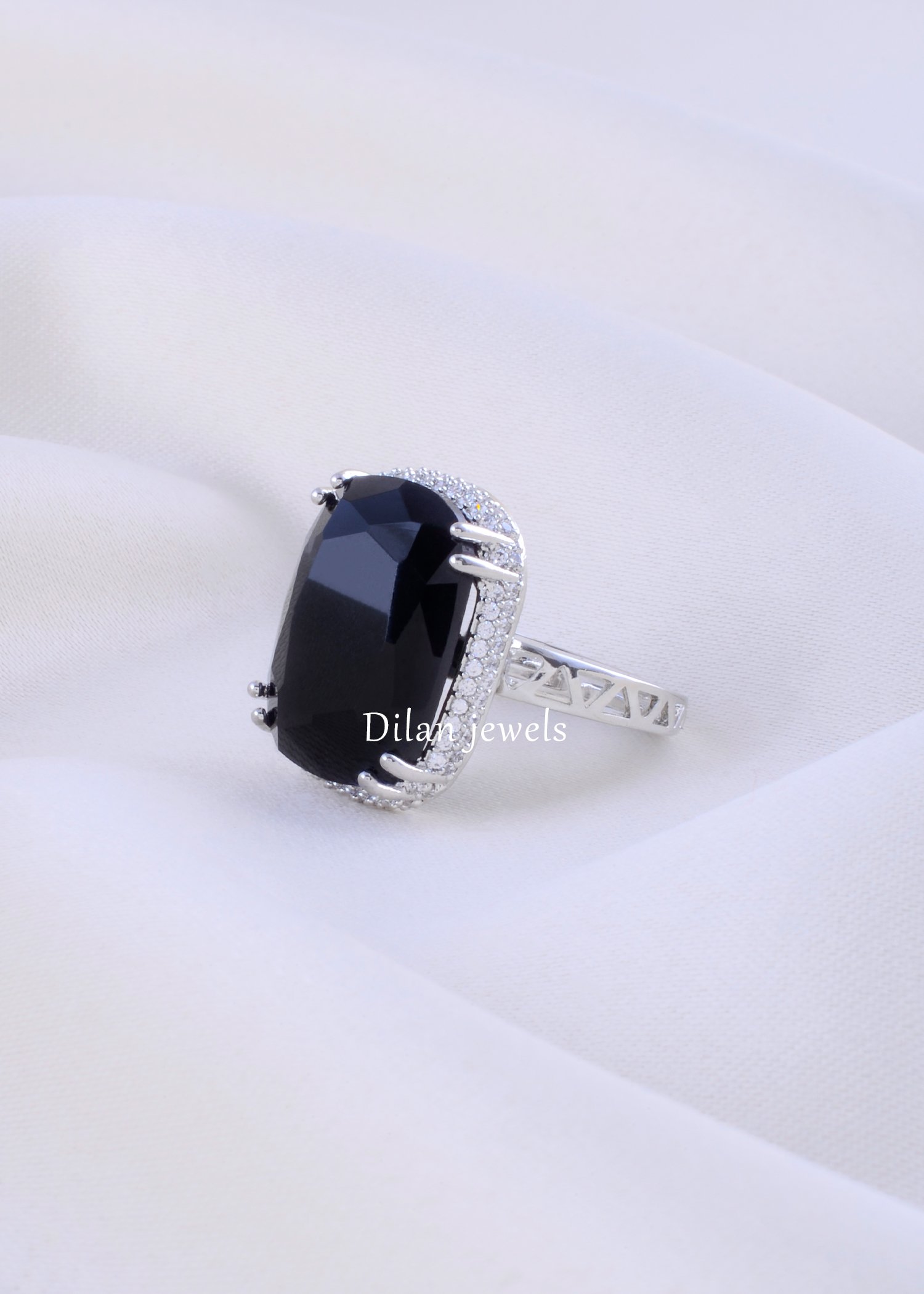 Experience bold sophistication with this stunning adjustable German Silver ring featuring a magnificent black onyx stone centerpiece. The ring showcases a striking cushion-cut black gemstone beautifully framed by a glittering halo of AAA-quality American Diamond stones that provide dazzling contrast. The flexible, open-band design ensures perfect comfort and fit for any finger size, making it ideal for universal sizing. Adorned with sparkling diamond accents throughout the band, this dramatic piece combines elegance with edge. Perfect for cocktail occasions, everyday wear, or statement styling, this affordable luxury ring delivers exceptional craftsmanship and timeless appeal.