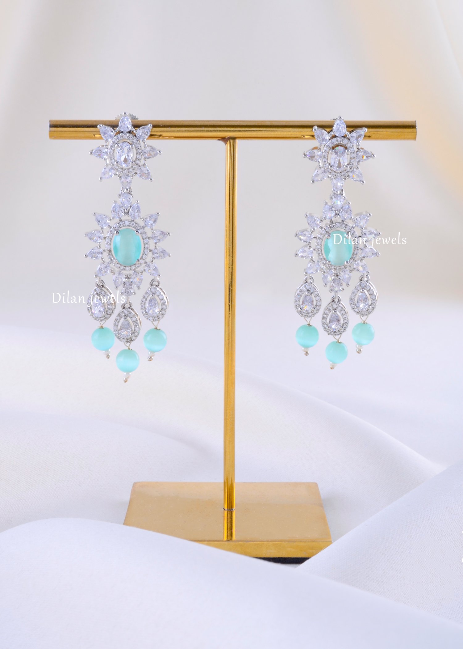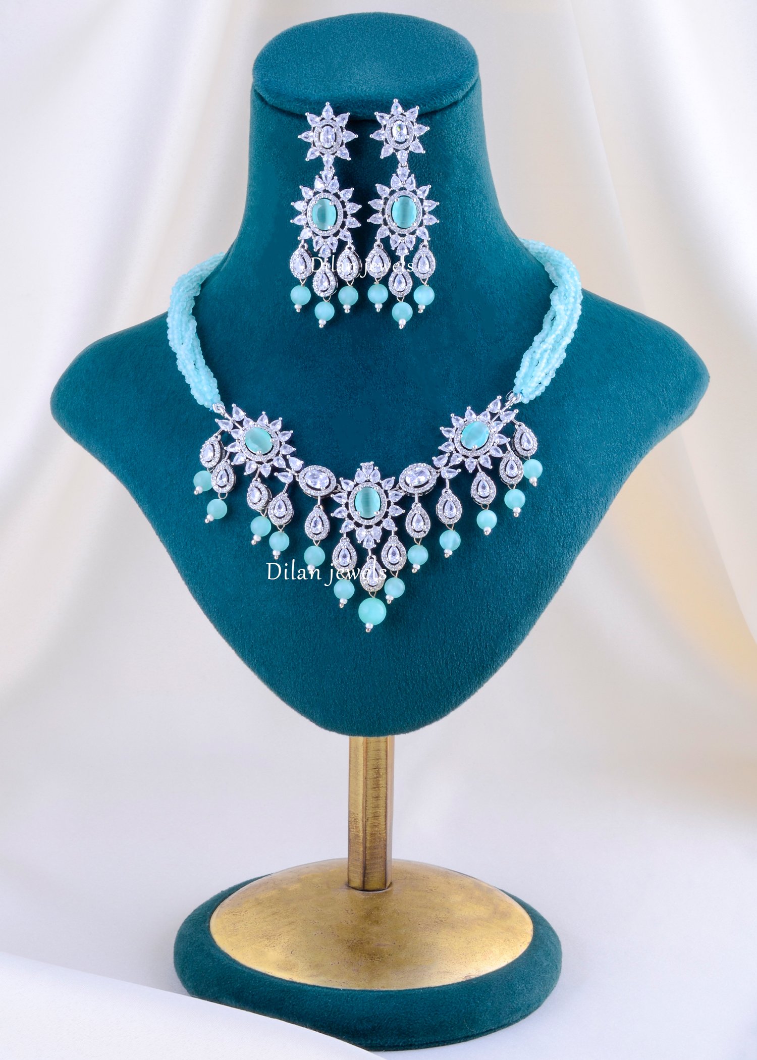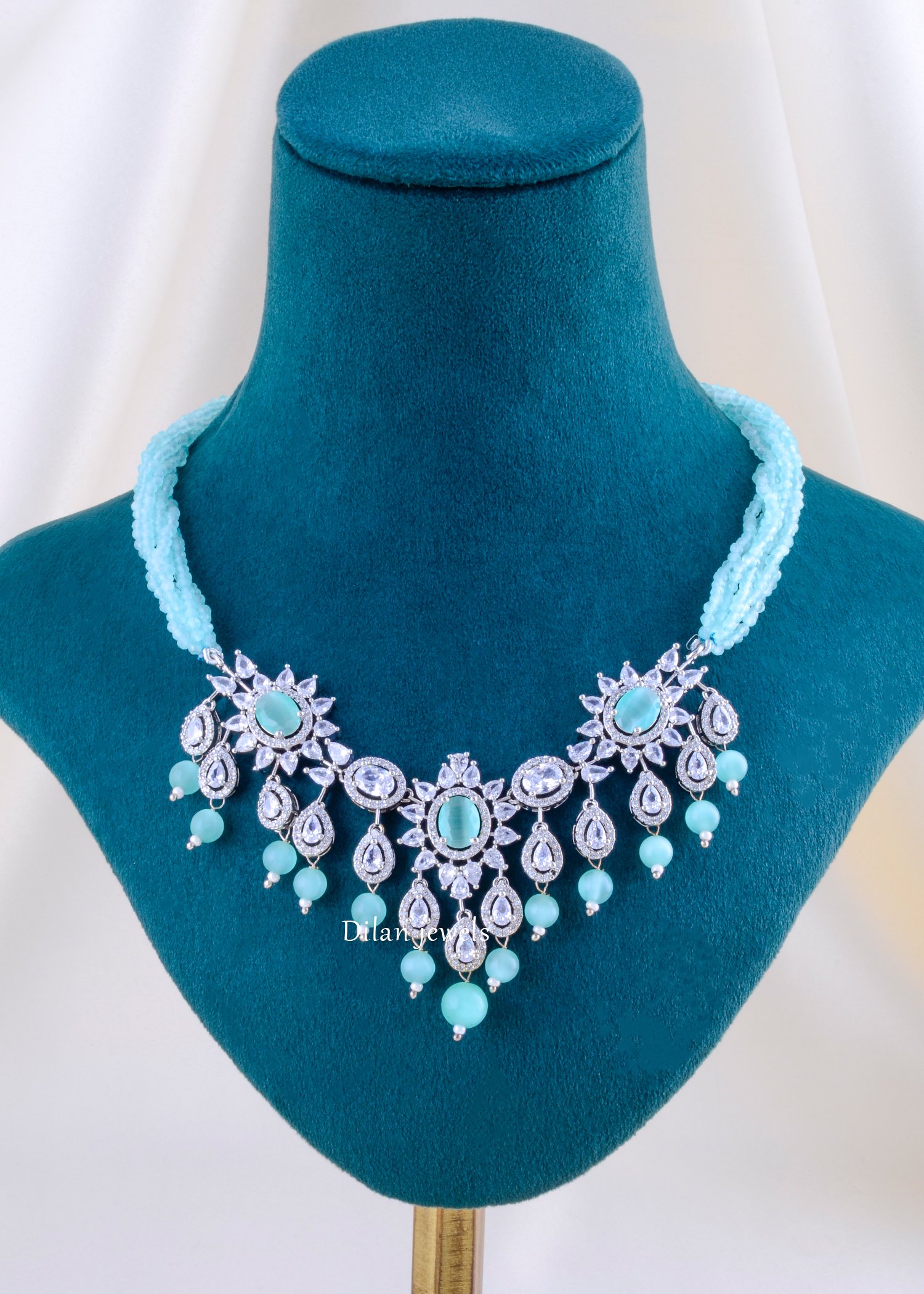 Radiate ethereal charm with this icy aqua necklace set, exquisitely crafted in premium German silver and embellished with AAA-quality American diamonds. The design features intricate sunburst floral motifs centered with soothing aqua cabochon stones, surrounded by shimmering diamond petals. Delicate teardrop diamond clusters and soft aqua bead danglers create graceful movement and a luxurious layered look. A multi-strand beaded aqua neck cord completes the design, offering comfort and perfect neckline coverage. Matching chandelier earrings mirror the necklace’s celestial motif, making this set ideal for cocktails, sangeet nights, and destination weddings.