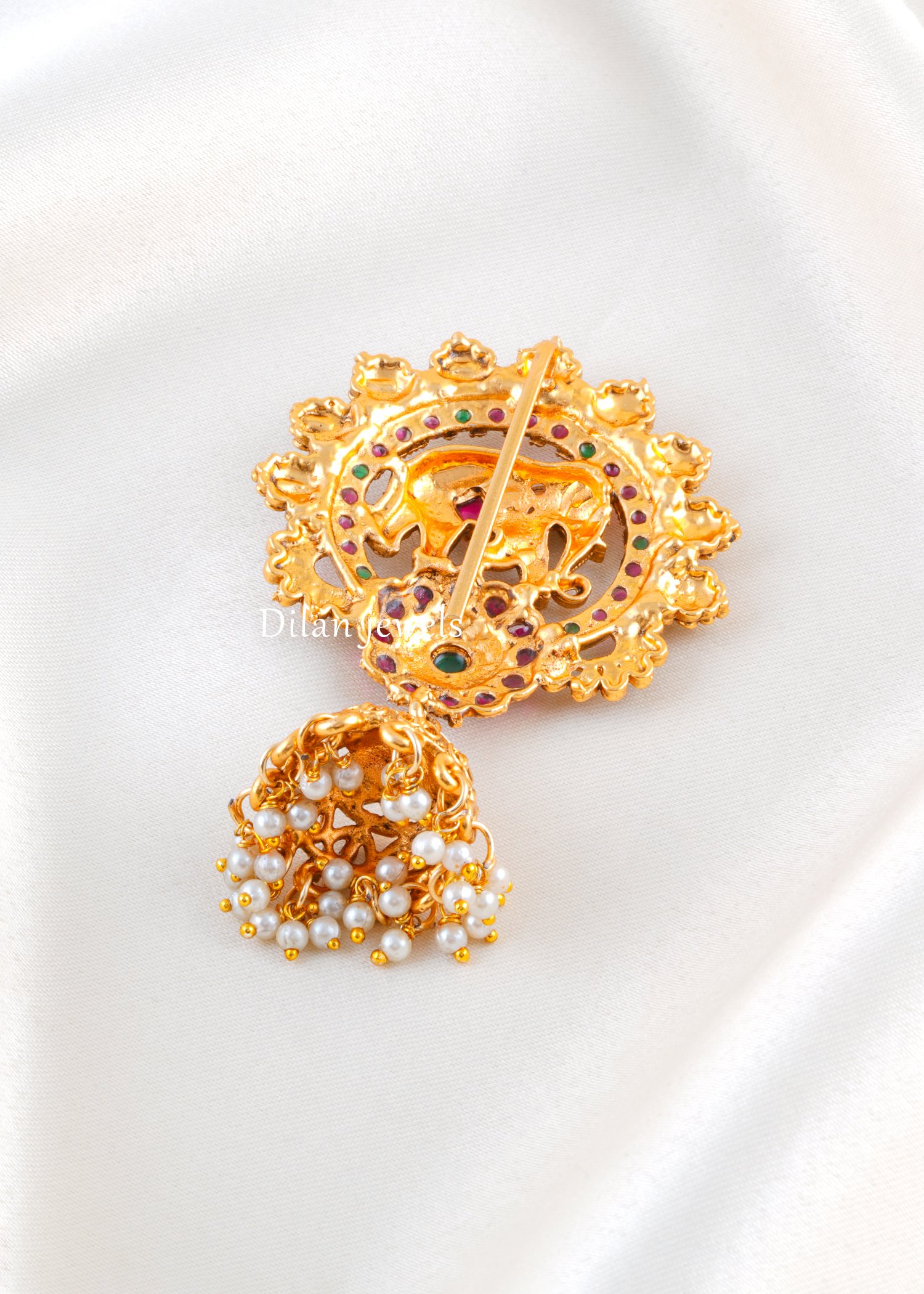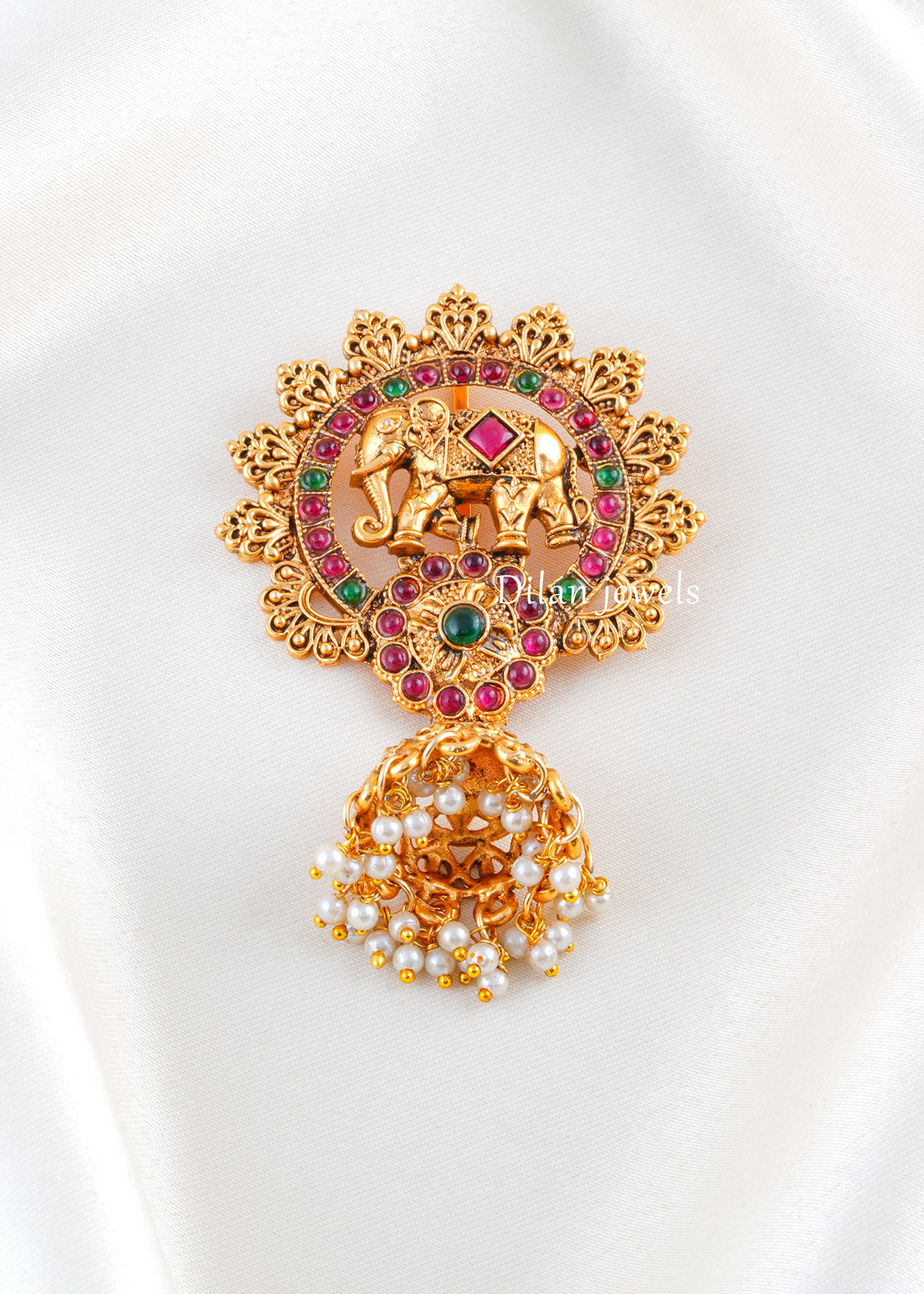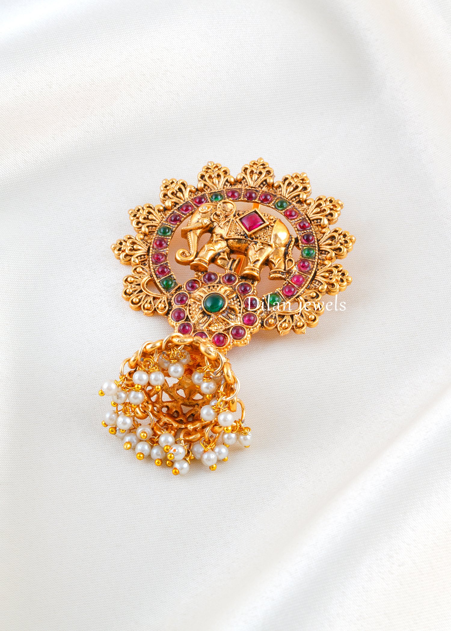 Elevate your traditional hairstyle with this intricately crafted Juda Pin, made in premium German silver with a rich antique gold finish. The centerpiece features a beautifully detailed elephant motif symbolizing royalty and prosperity, surrounded by delicate stone embellishments in classic festive hues. The ornate circular frame is enhanced with fine craftsmanship, while the pearl danglings at the bottom add graceful movement and charm. Perfect for weddings, festive occasions, classical dance performances, and bridal wear, this Juda Pin adds heritage elegance and a majestic touch to your bun hairstyle.