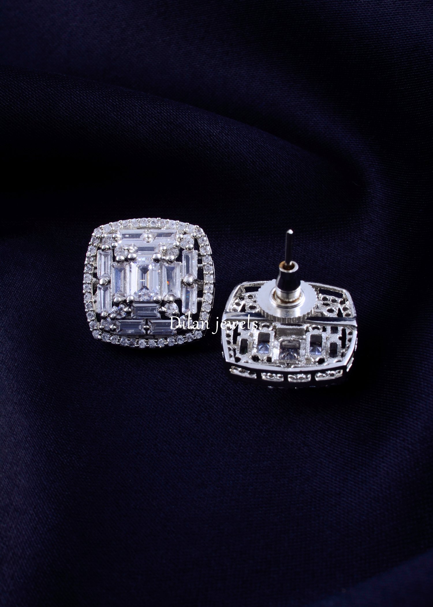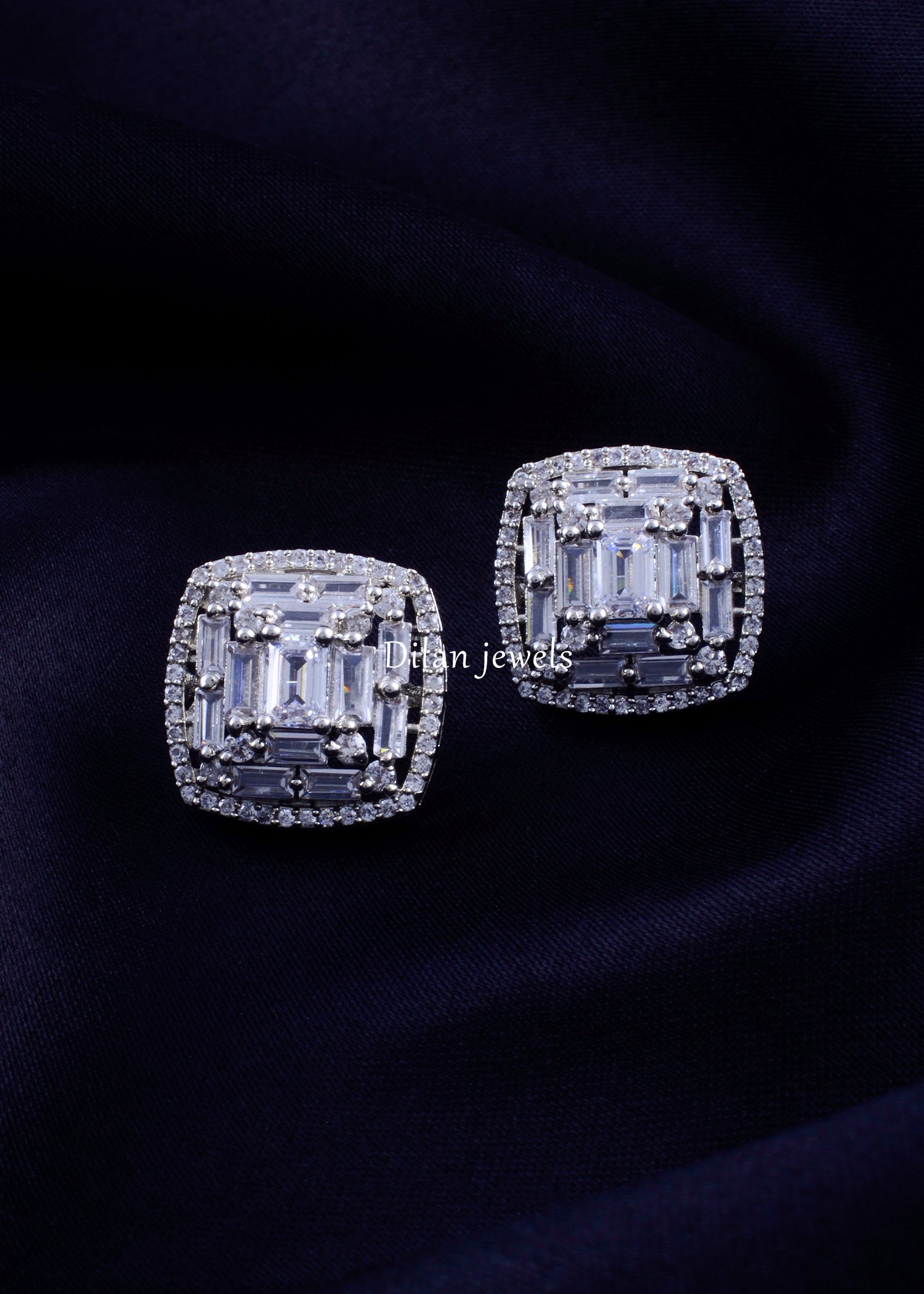 Elevate your elegance with these stunning square stud earrings, expertly crafted in premium German silver and finished in lustrous white rhodium. The design features a sophisticated geometric pattern combining brilliant baguette-cut AAA-quality American diamonds with perfectly placed round diamonds, creating a striking mosaic effect. The cushion-shaped frame with diamond border adds refined dimensionality and luxurious sparkle. Lightweight yet substantial in presence, these statement studs complement both formal evening wear and festive occasions. The impeccable craftsmanship and brilliant diamond arrangement make them a versatile investment piece, perfect for brides, special celebrations, or as a timeless gift.