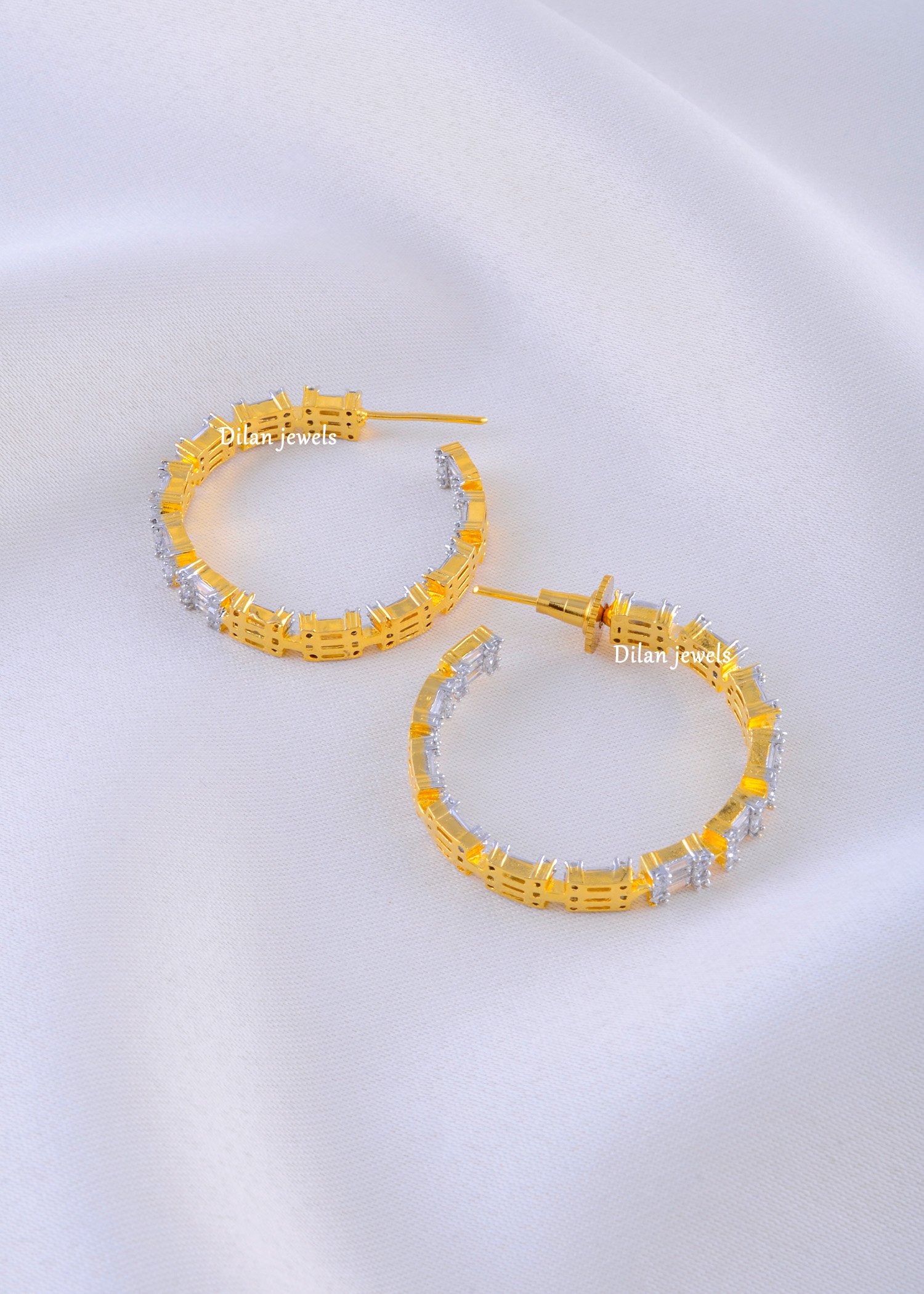 Make a bold statement with these striking German Silver hoop earrings, designed for the woman who loves contemporary elegance. These large, open-style hoops feature a meticulously set array of baguette-cut, AAA-quality American Diamonds that provide a sophisticated, glass-like brilliance. The high-polish gold plating over a durable German Silver base ensures a luxurious finish that effortlessly complements both modern western outfits and chic festive ensembles. Featuring a secure push-back closure for all-day comfort, these radiant hoops are the perfect accessory for cocktail parties, weddings, or high-fashion events.