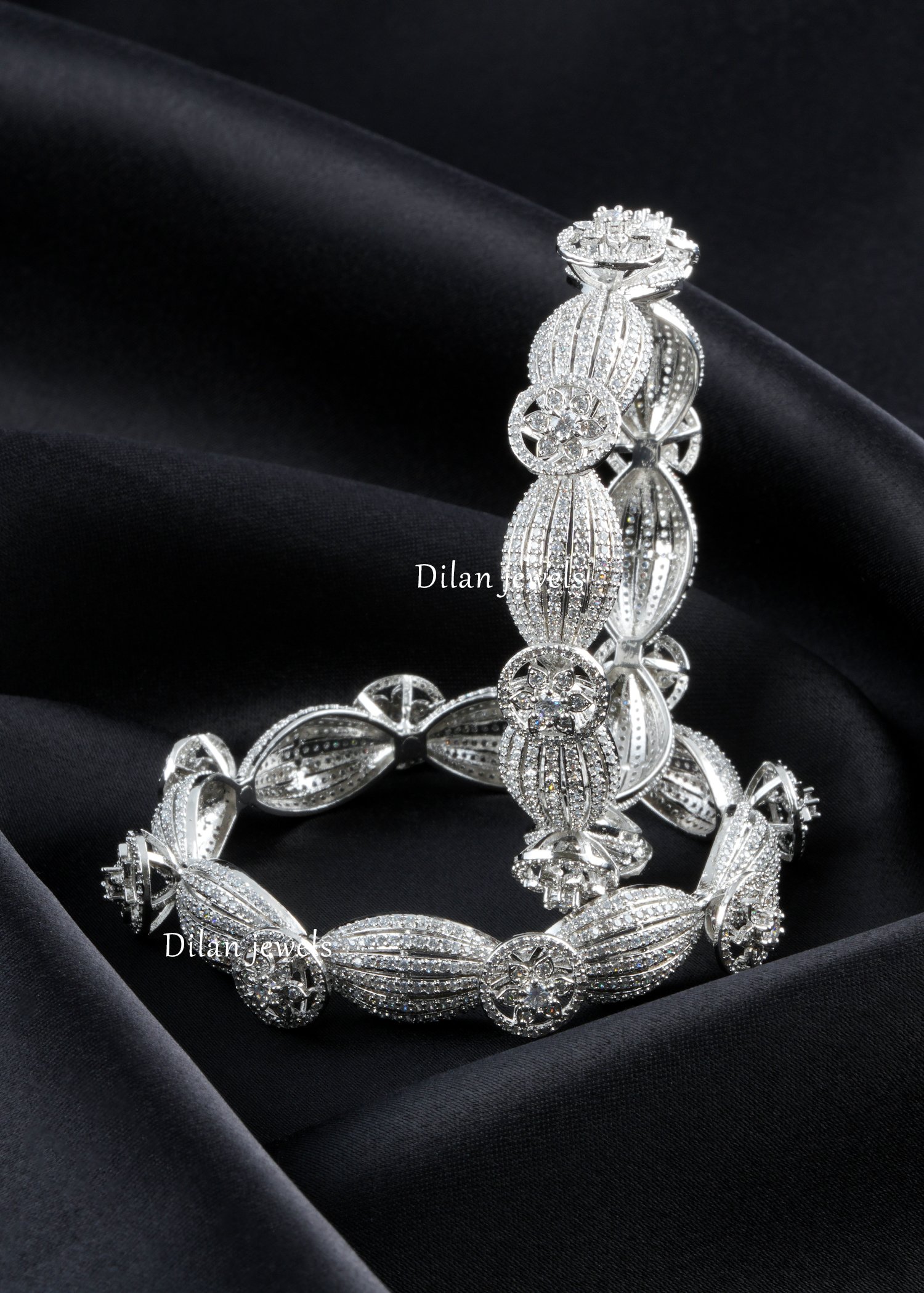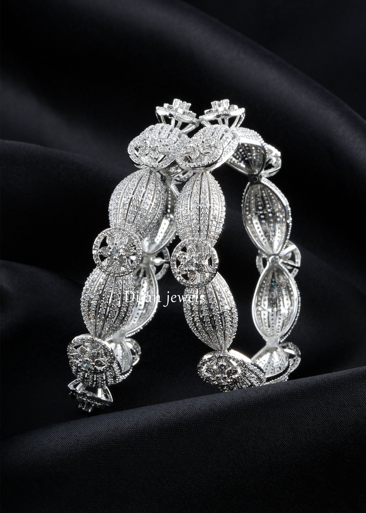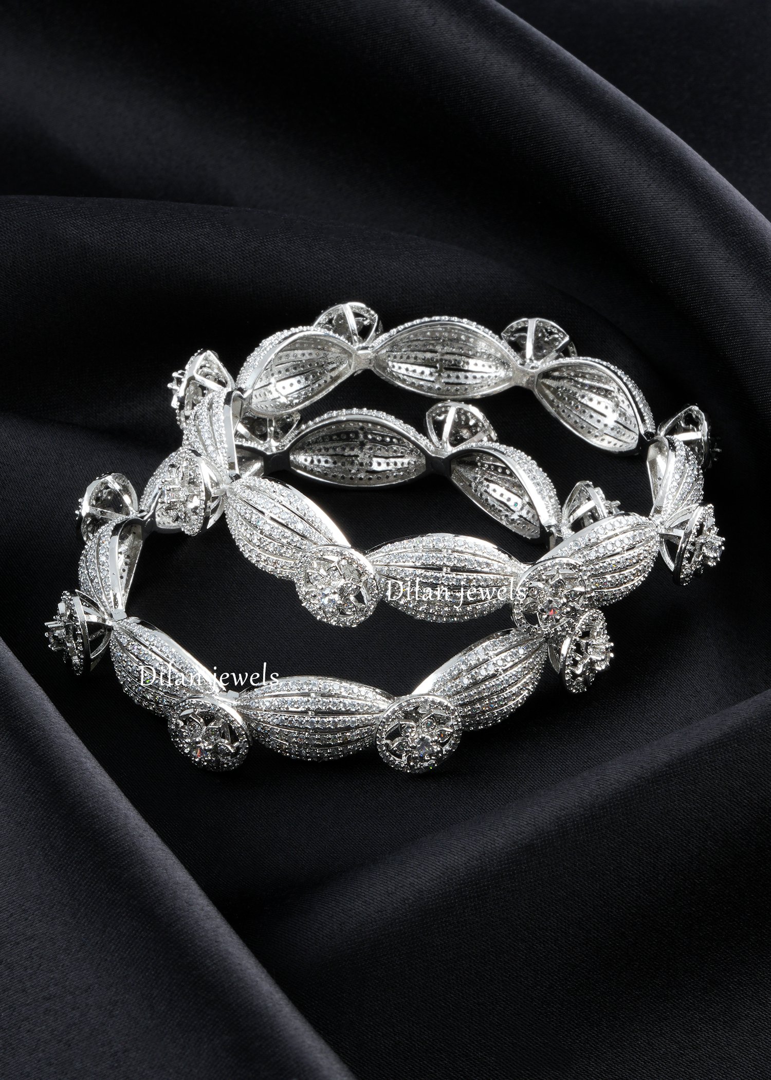 A breathtaking pair of German silver bangles featuring intricately carved floral motifs studded with AAA-grade American diamonds. The delicate leaf-shaped panels showcase meticulous pave detailing and ornate spherical embellishments, creating a three-dimensional botanical masterpiece. Each bangle gleams with exceptional sparkle and brilliance, capturing light beautifully from every angle. Perfect for bridal collections, festive occasions, or as an investment piece. The precise craftsmanship demonstrates premium jewelry artistry with traditional Indian design sensibilities. Lightweight yet durable German silver ensures comfortable, all-day wearability. This stunning bangle set represents timeless elegance and sophisticated luxury suitable for discerning collectors.