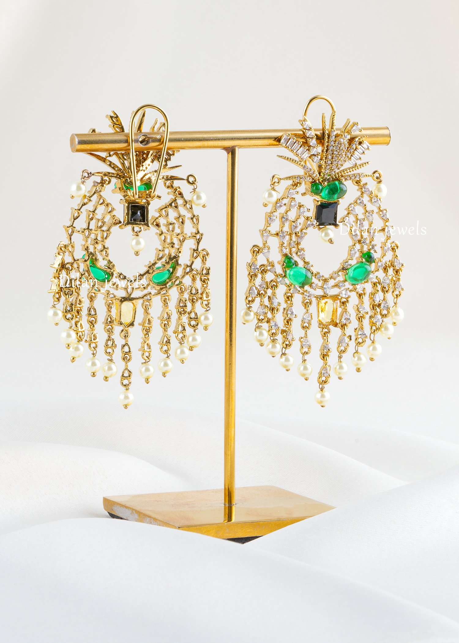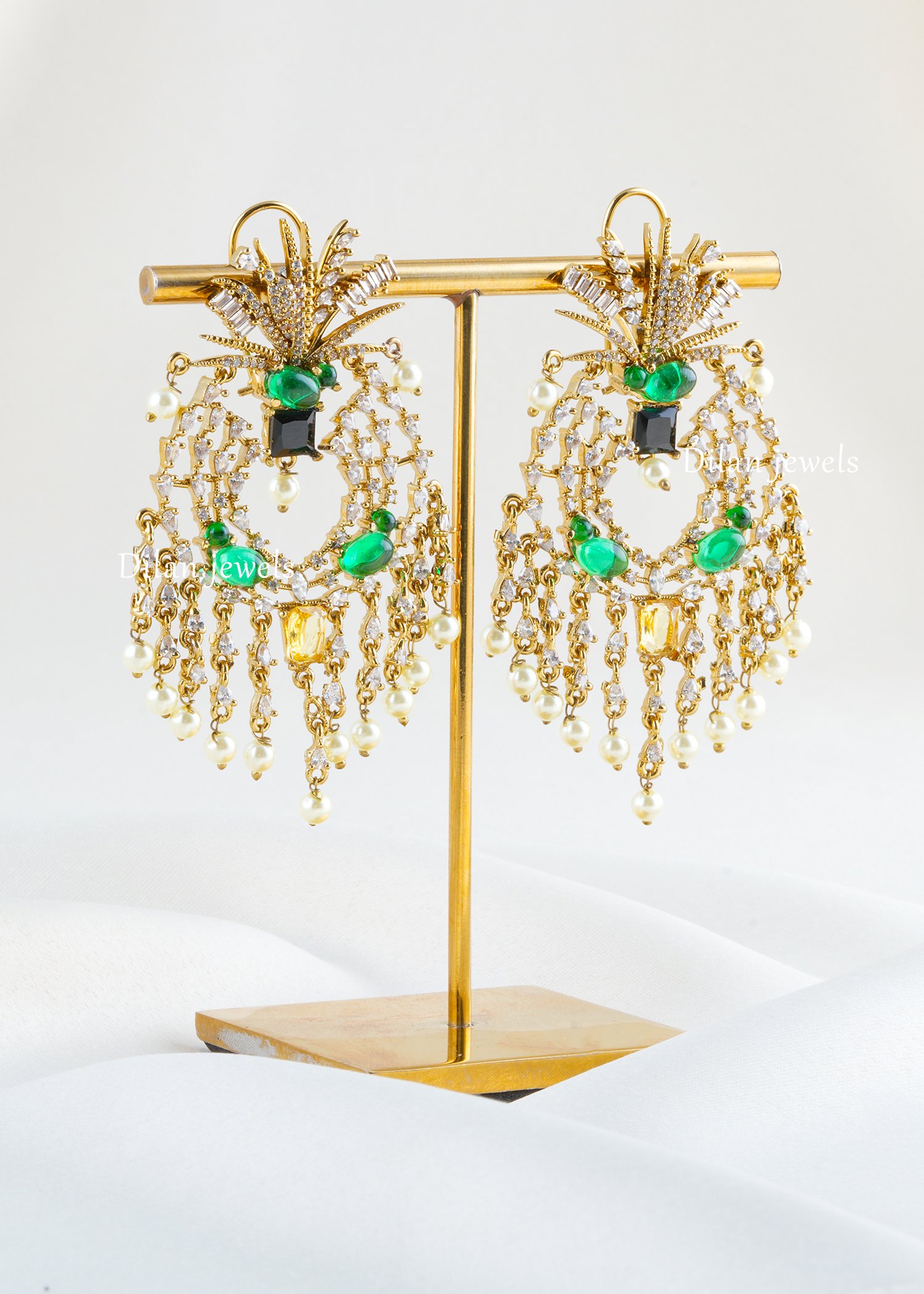 Enchant with luxurious opulence through these exquisite multi-gemstone chandelier earrings, expertly crafted in premium German silver with lustrous gold finish. The design showcases an ornate peacock motif featuring cushion-cut emeralds, black onyx, golden citrine gemstones, and lustrous pearl drops. AAA-quality American diamonds create luminous sparkle throughout the intricate lattice pattern and ornamental crown. The harmonious blend of vibrant gemstones beautifully contrasts with shimmering diamond accents and cascading pearls, creating dramatic movement and elegance. Perfect for weddings, celebrations, and special occasions, these statement pieces exude timeless luxury, sophisticated grandeur, and contemporary glamour.