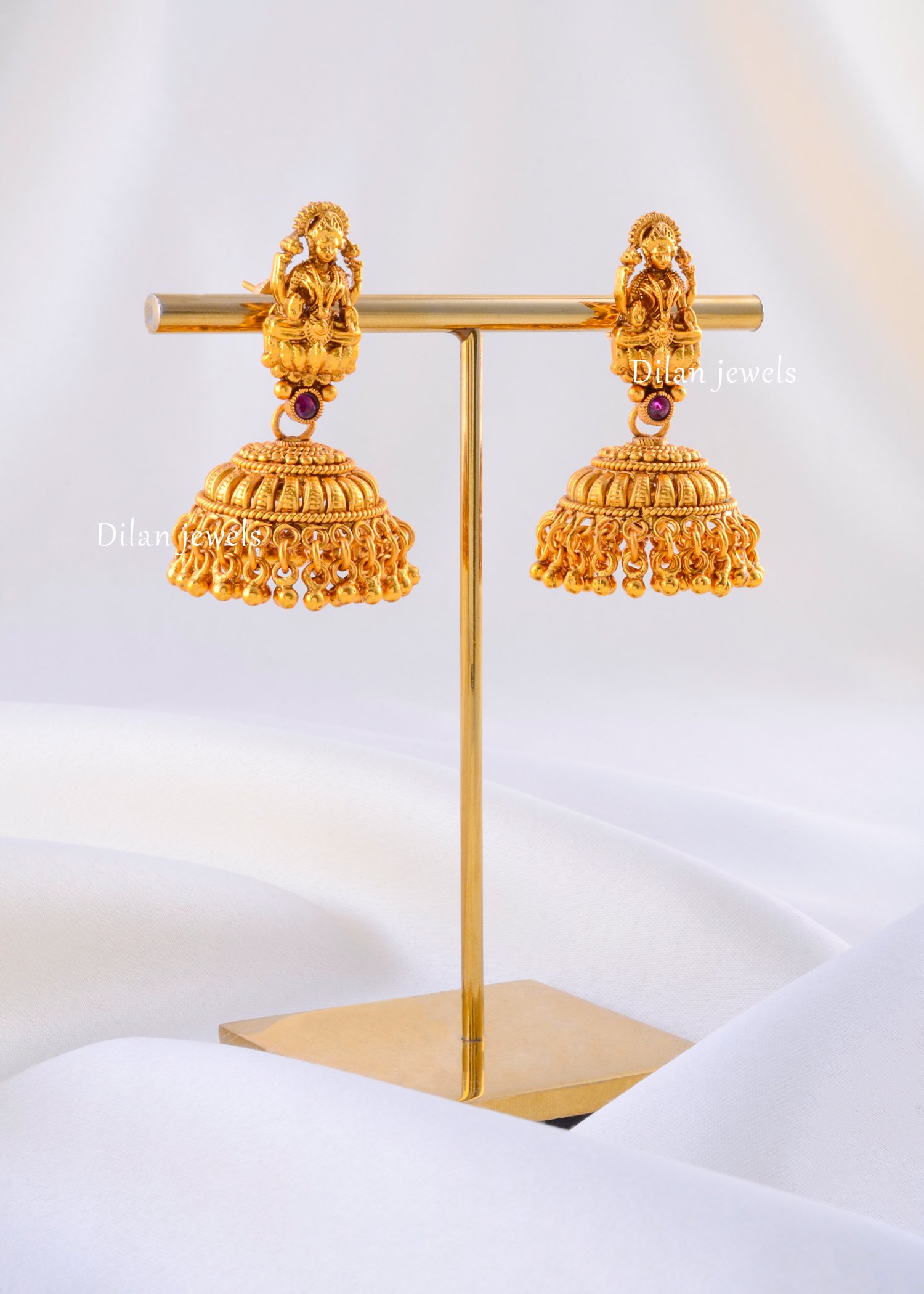 Embrace divine elegance with these exquisite gold-plated temple jhumka earrings, meticulously crafted from high-quality German Silver. The design features a beautifully detailed Goddess Lakshmi motif on the stud, symbolizing prosperity and grace. Suspended below is a traditional jhumka dome, adorned with intricate filigree work and delicate golden beads that dangle playfully with every movement. A single ruby-pink stone adds a vibrant pop of color, enhancing the rich gold finish. These lightweight yet statement-making earrings are perfect for weddings, festivals, and traditional celebrations, adding a touch of heritage charm to your ethnic attire.