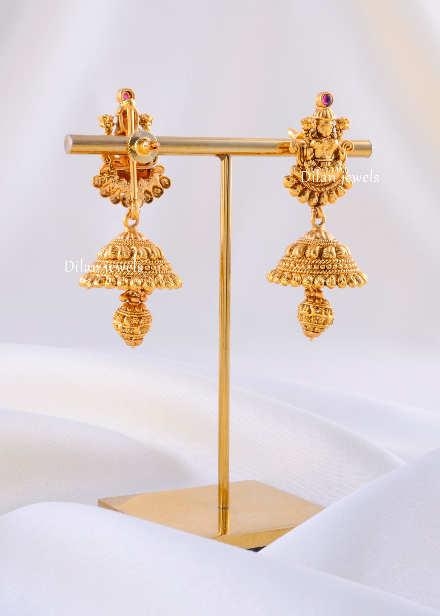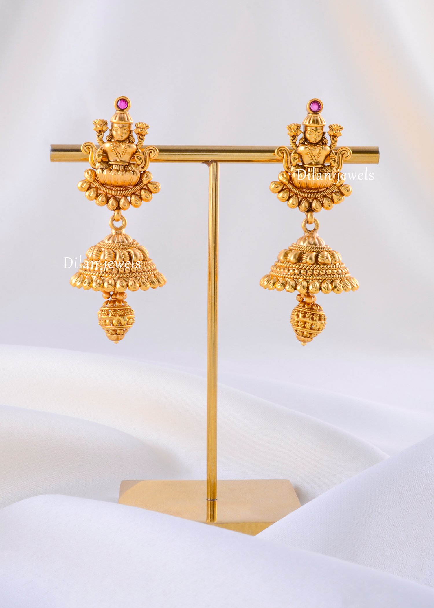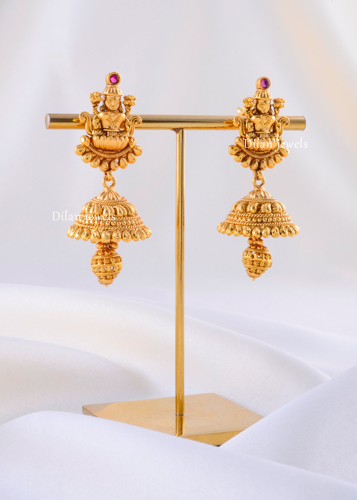 Embrace the divine essence of heritage with these captivating gold-plated jhumka earrings, masterfully crafted from premium German Silver. The studs feature an intricate depiction of Goddess Lakshmi seated within a blossoming lotus, symbolizing abundance and purity. Suspended below is a classic, perfectly rounded jhumka dome, adorned with finely detailed beadwork and textures that reflect superior craftsmanship. The antique matte gold finish lends a regal, timeless appeal, while a tiny ruby accent adds a subtle hint of color. Lightweight yet luxurious, these earrings are the perfect choice for weddings, festive celebrations, and traditional gatherings.
