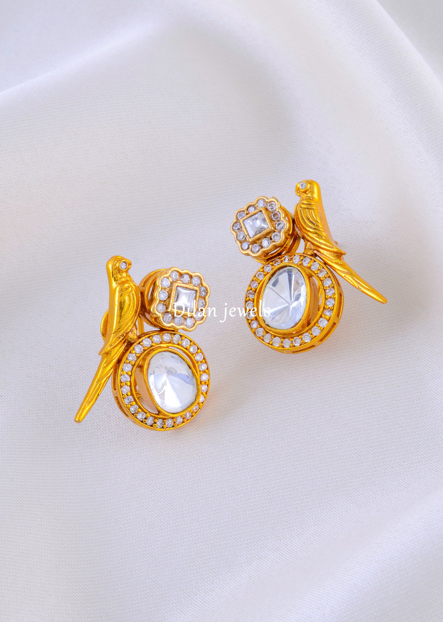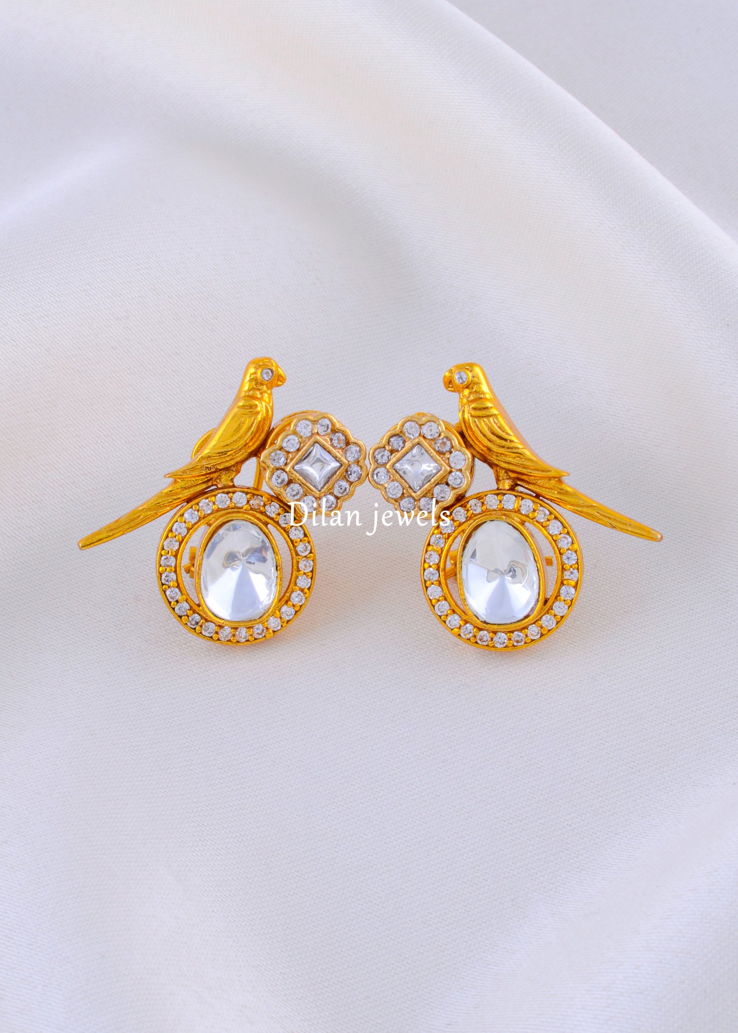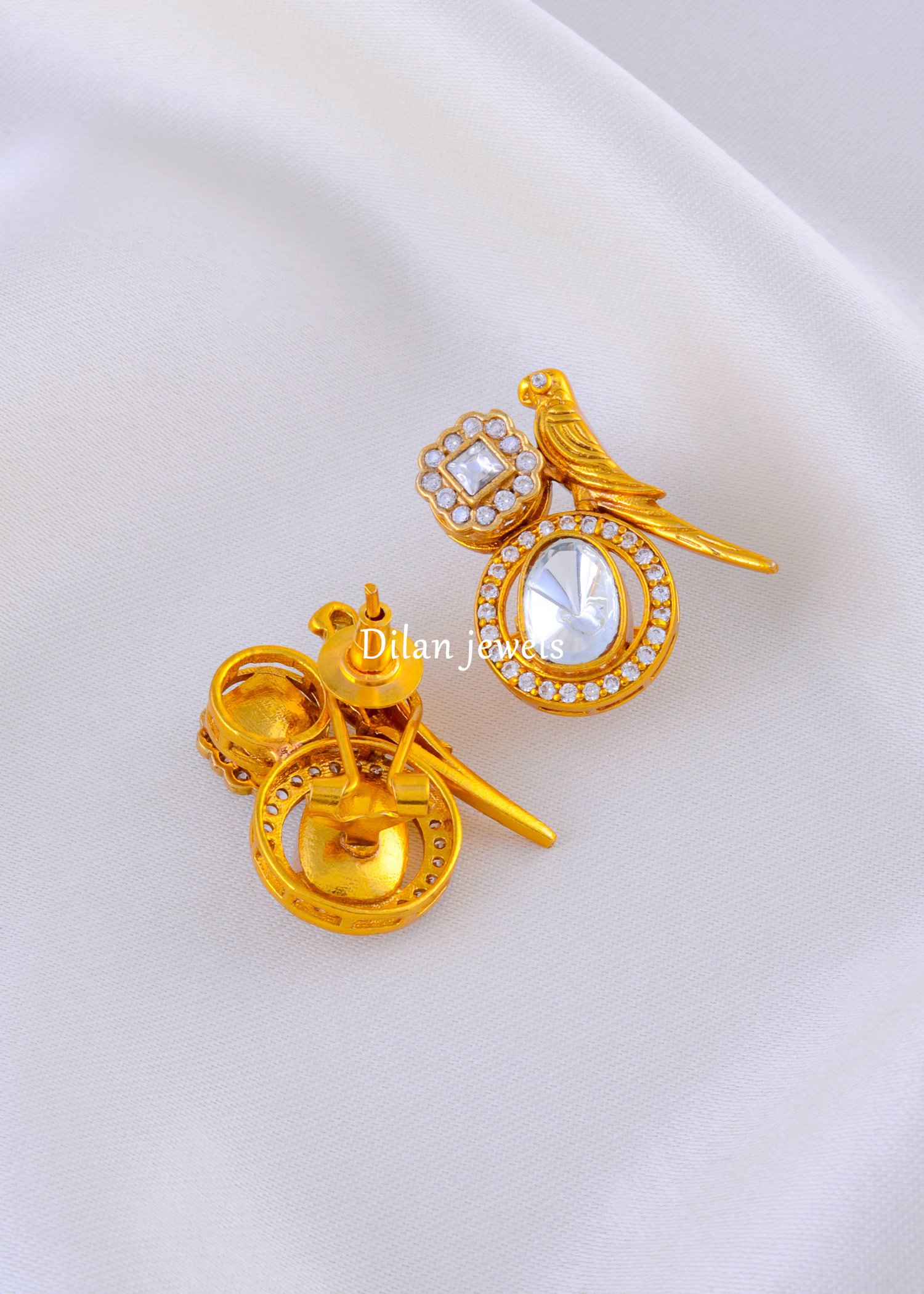 Embrace the charm of nature with these exquisite Gold-Plated Parrot Polki Earrings, masterfully crafted in German Silver. This distinctive design features a beautifully sculpted golden parrot perched elegantly beside a setting of lustrous Kundan Polki stones. A square stud and a large oval drop are haloed by brilliant AAA quality American Diamonds, creating a stunning contrast between the uncut style of Polki and the modern sparkle of AD. Perfect for weddings and festive occasions, these earrings blend regal tradition with a playful, artistic flair, making them a conversation-starting accessory for your ethnic wardrobe.