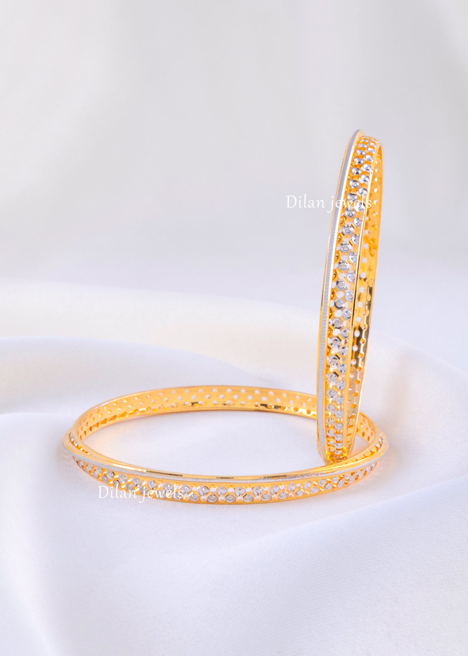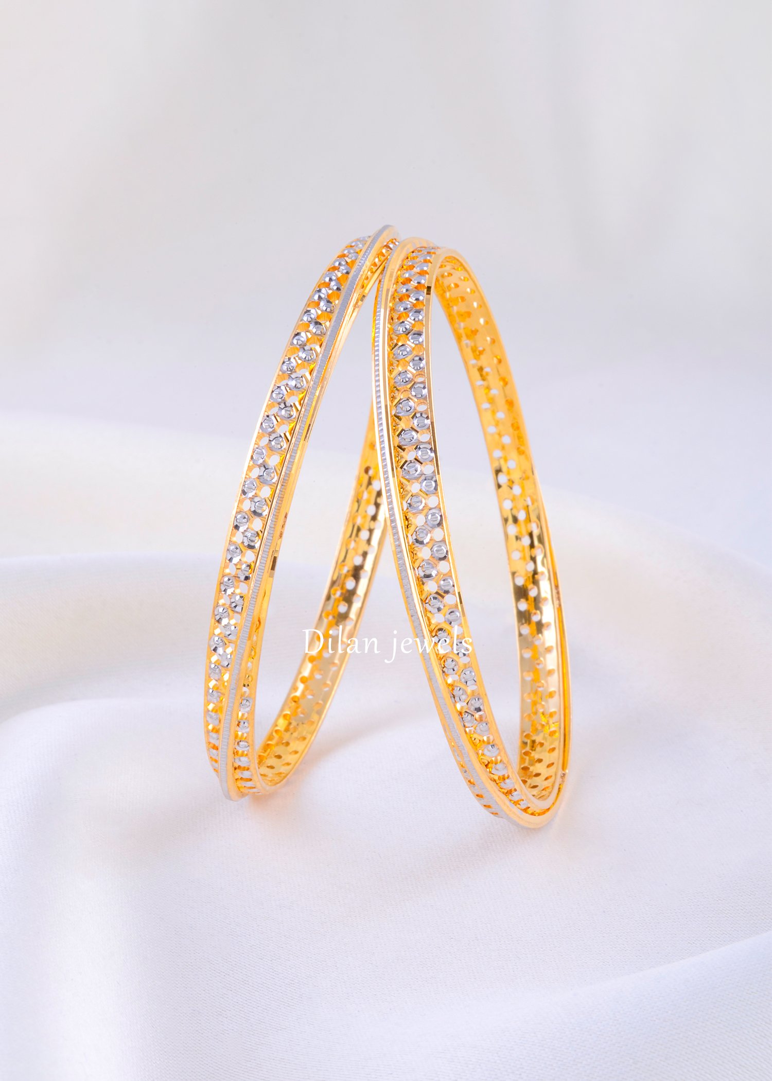 These elegant bangles are crafted from premium German silver and finished with luxurious 22K gold plating for a timeless shine. Embellished with sparkling AAA American Diamonds, they offer a stunning blend of traditional charm and contemporary sophistication. Lightweight yet durable, these bangles are perfect for festive occasions, weddings, parties, or daily wear. Their refined detailing and brilliant sparkle make them an effortless statement piece to elevate any outfit. A must-have jewellery essential for women who love subtle glamour and premium craftsmanship.