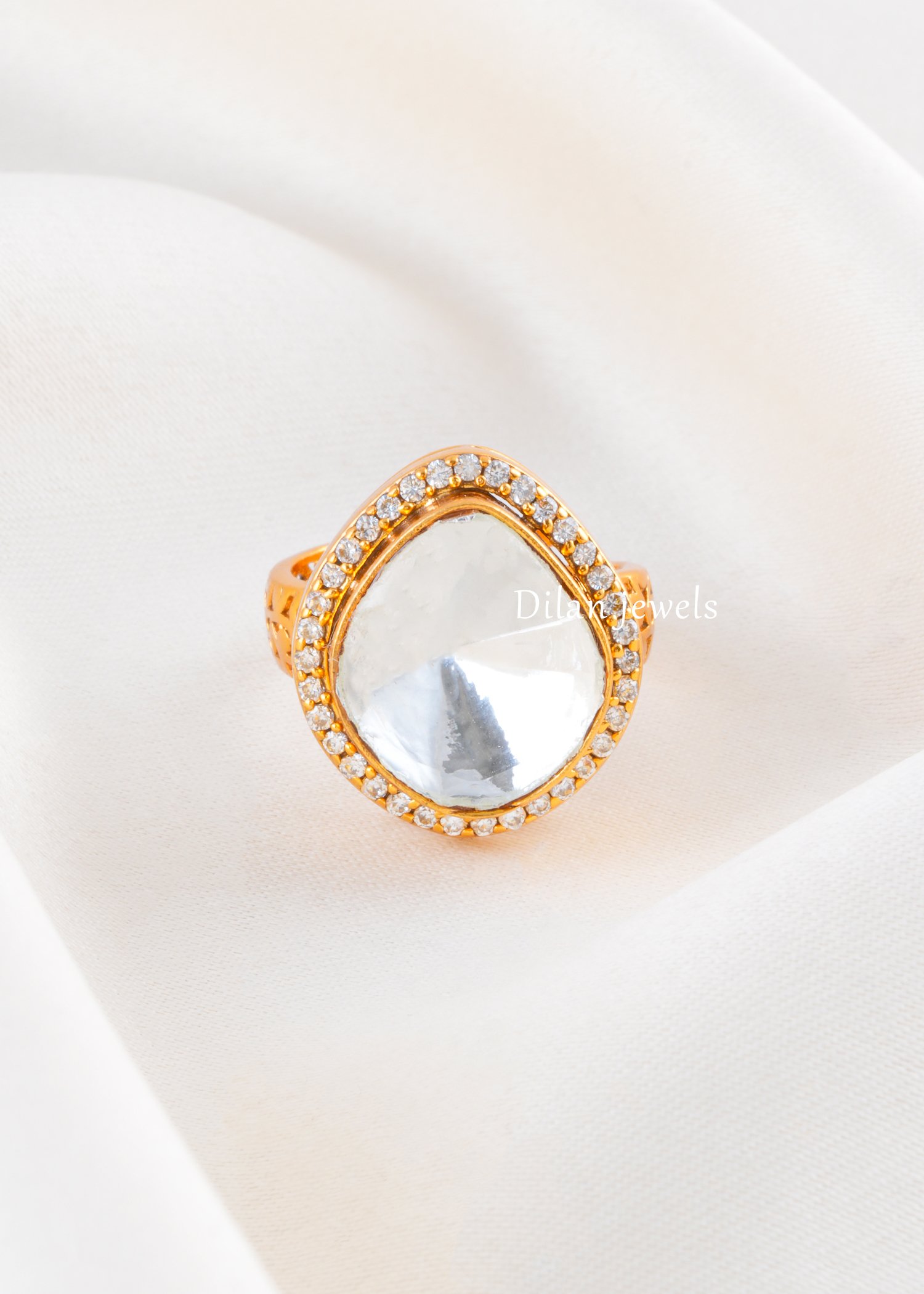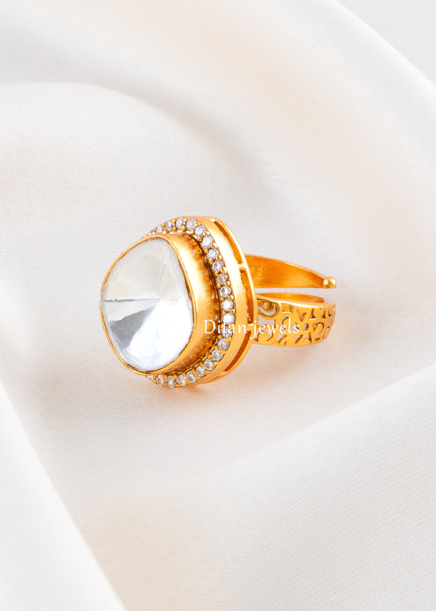 Turn heads with this elegant German silver ring, finished in a rich gold-tone and crafted to shine at every angle. The centerpiece features a pear-shaped AAA Quality American Diamond with a mirror-like sparkle, bordered by a delicate halo of micro-stones for added brilliance. Detailed cutwork on the shank gives it a premium, airy look, while the open adjustable band ensures a comfortable fit. Ideal for parties, festive styling, weddings, and gifting—this statement ring elevates even the simplest outfit.