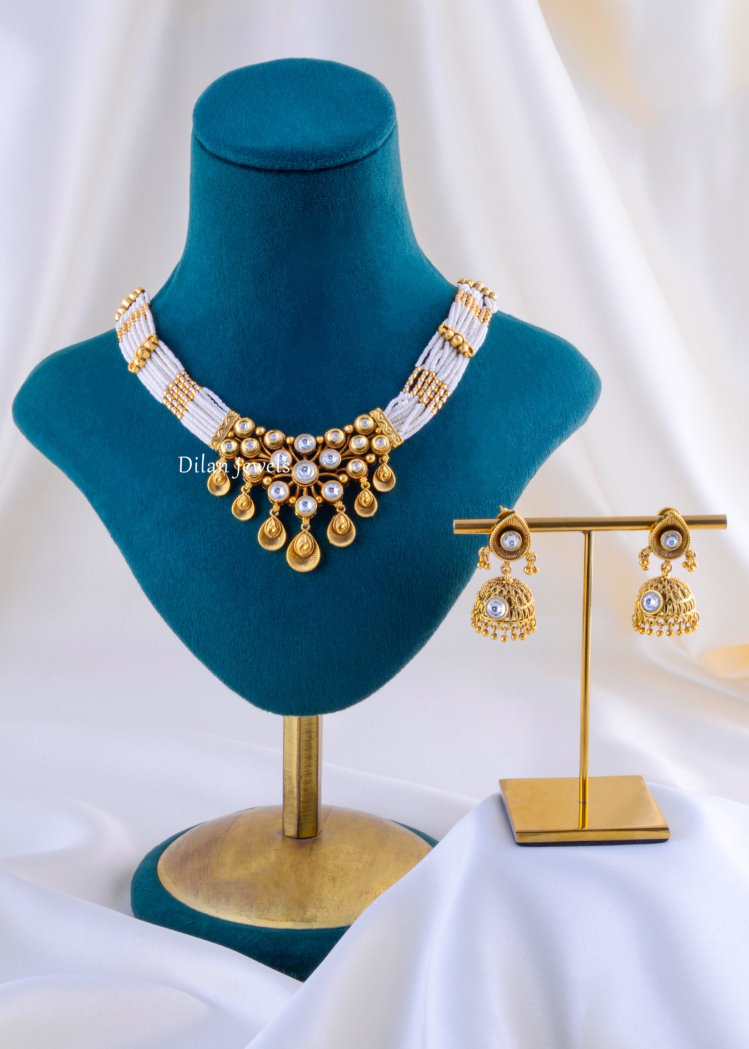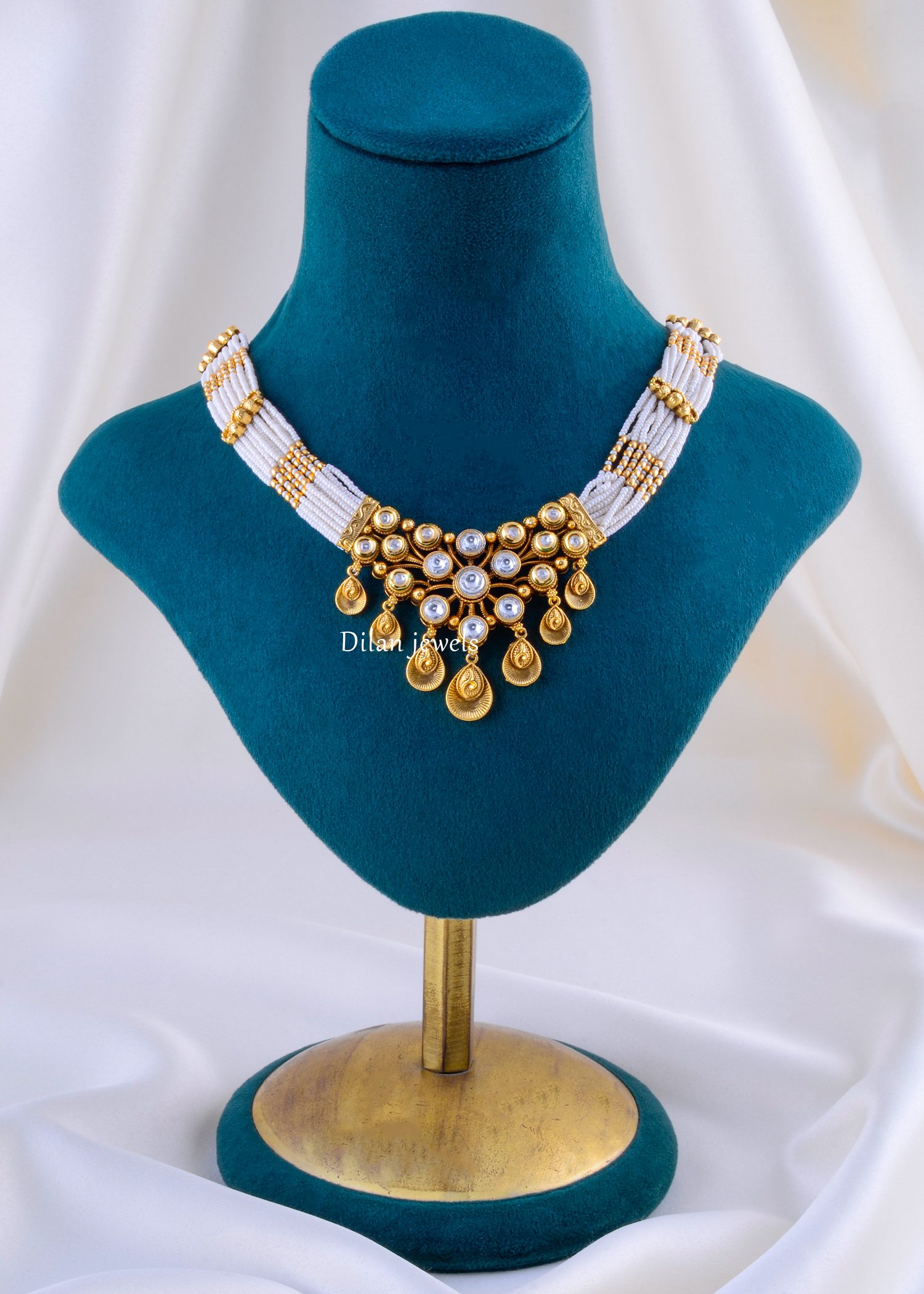 Embrace timeless sophistication with this elegant pearl and gemstone necklace set, expertly crafted from premium German Silver with a luxurious gold finish. The set features a stunning statement necklace with graceful white and gold beaded straps that beautifully frame an ornate pendant adorned with lustrous white pearls and dazzling AAA-quality American Diamond stones arranged in a cascading teardrop pattern. The matching chandelier earrings showcase identical pearl-centered designs with dangling gold-beaded accents and decorative filigree metalwork. The sophisticated design merges classic elegance with contemporary flair. Perfect for weddings, festivals, traditional celebrations, and special occasions, this coordinated set elevates any bridal look with refined luxury. The complete jewelry set offers affordable elegance with undeniable style and sophistication.