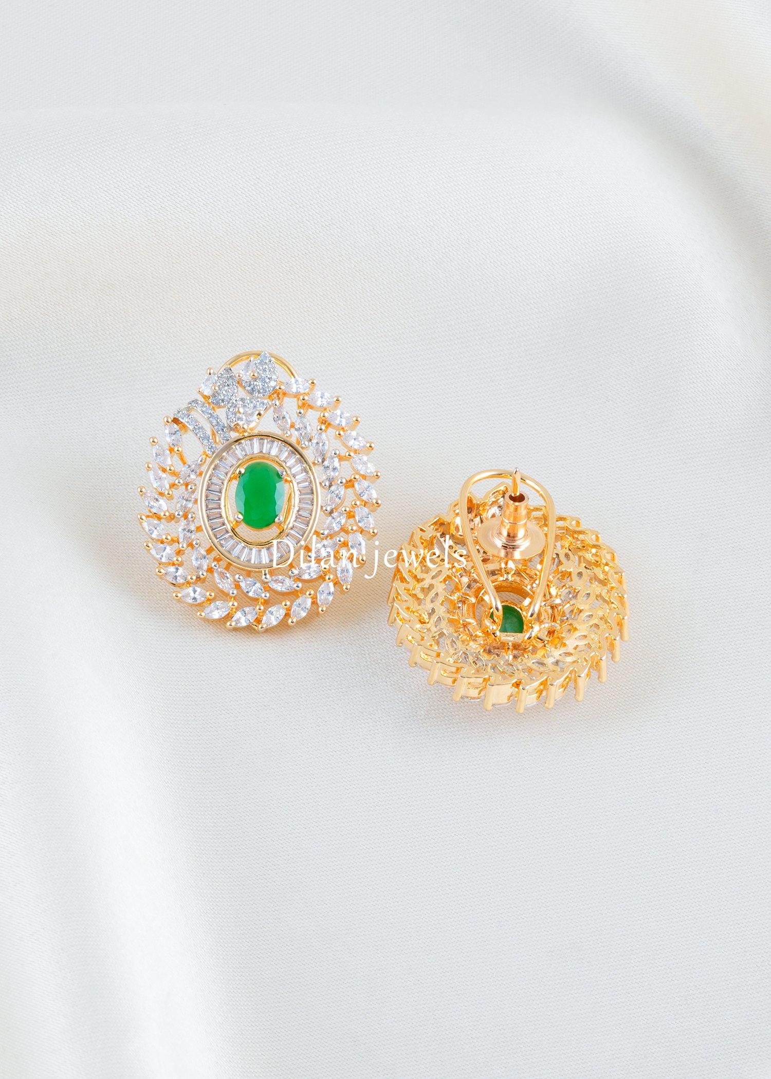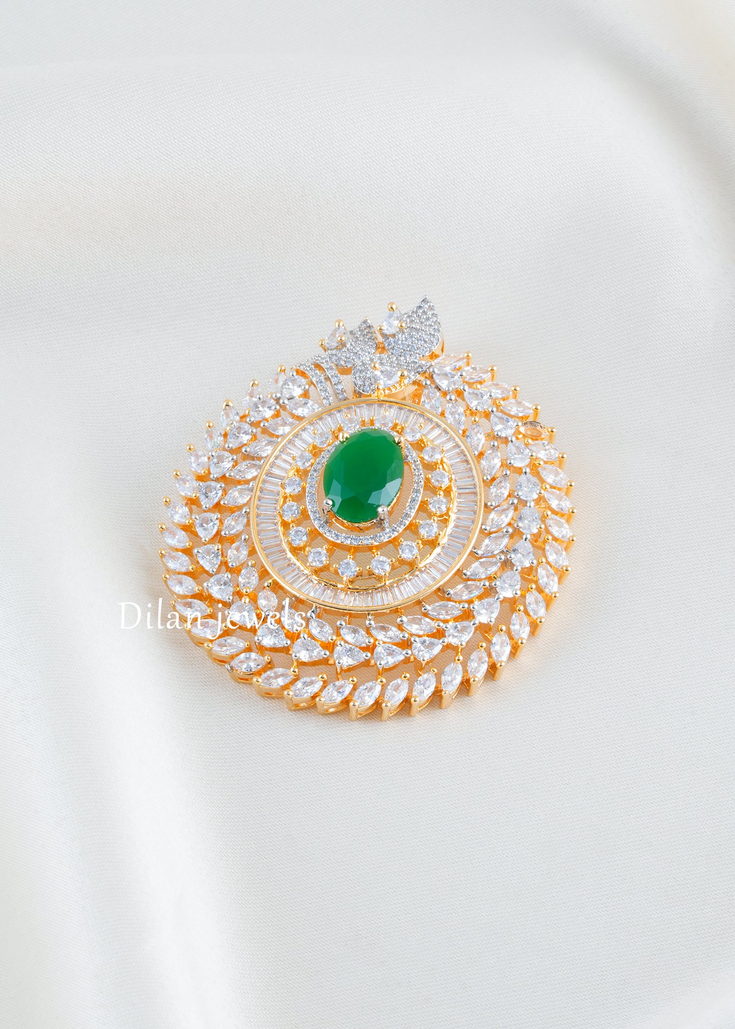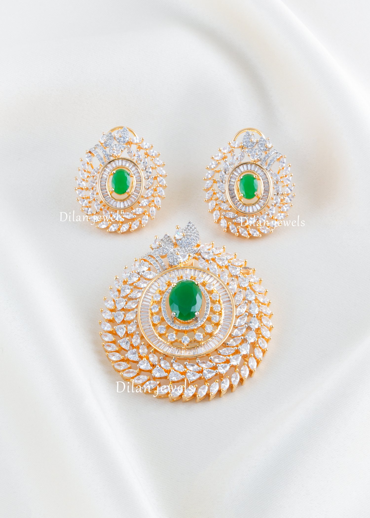 Add a touch of royal elegance with this exquisite pendant set, crafted in high-quality German silver with a luxurious gold finish. Featuring a striking emerald-green centerpiece, the design is beautifully encircled by AAA quality American diamonds arranged in a radiant floral pattern. The 6.1 cm pendant offers a perfect balance of boldness and grace, making it ideal for weddings, festive occasions, and statement styling. Paired with matching stud earrings, this set effortlessly blends classic charm with modern sparkle, ensuring you stand out with timeless sophistication.