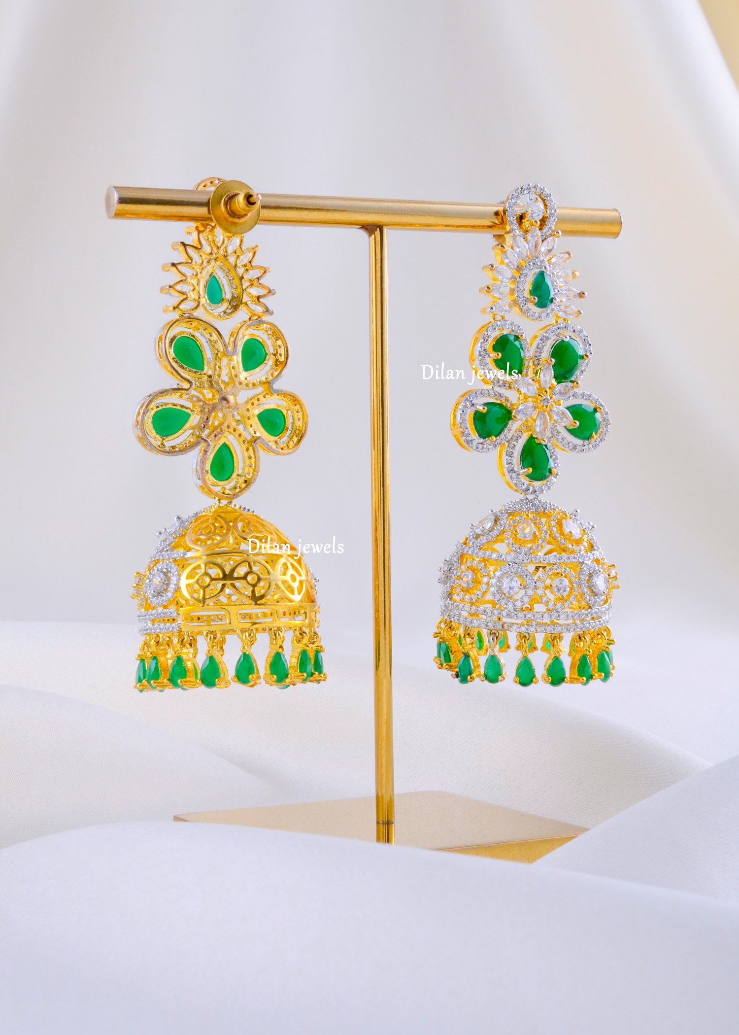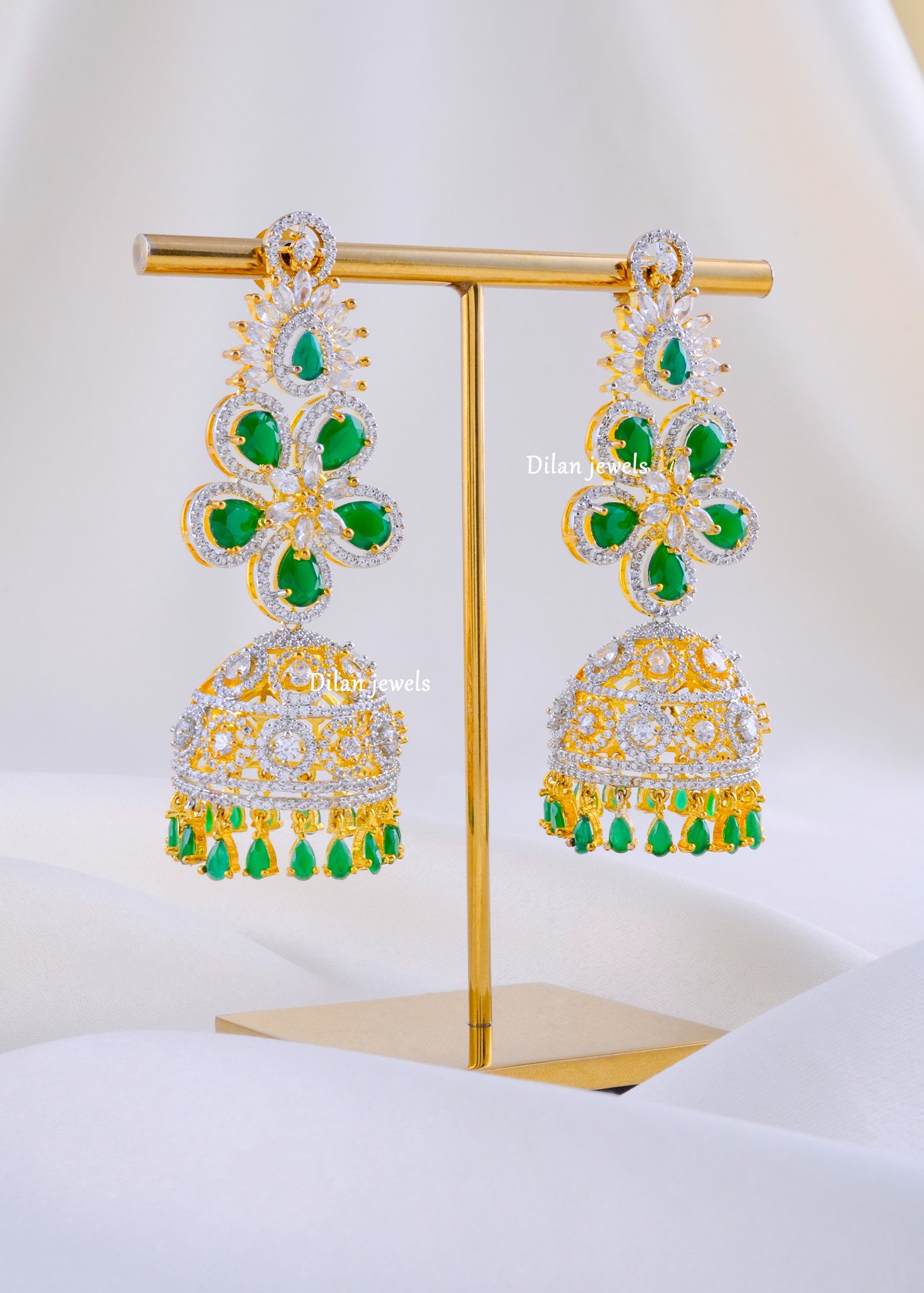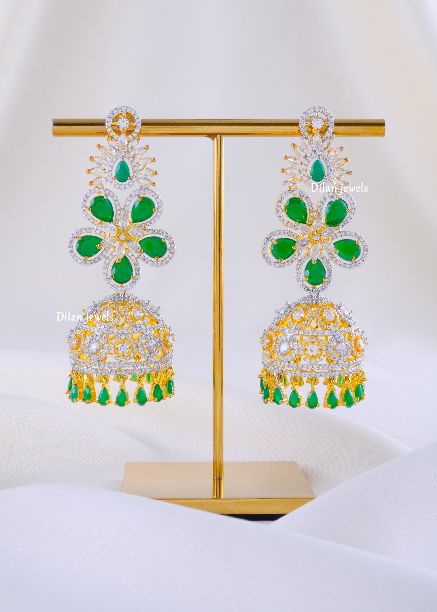 Elevate your festive elegance with these exquisite German Silver earrings, crafted to perfection with AAA quality American Diamonds and vibrant emerald-green stones. The intricate floral motifs paired with a regal jhumka design create a stunning fusion of tradition and modern glamour. Each element is finely detailed, offering brilliance, durability, and luxurious charm. Perfect for weddings, parties, and festive celebrations, these earrings add a touch of royal sophistication to any outfit. Lightweight yet statement-making, this pair is designed to make you stand out effortlessly.