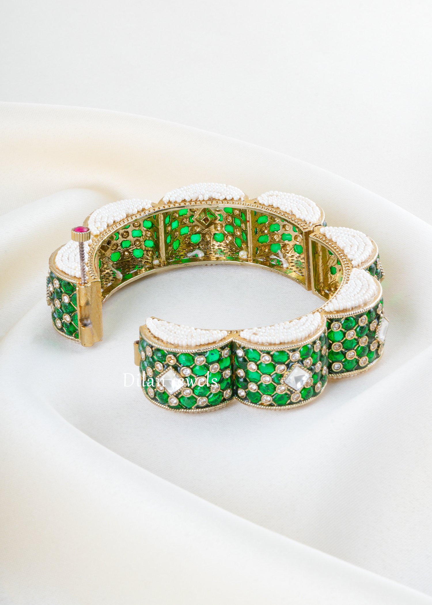 Make a stunning statement with this exquisite German silver bracelet featuring vibrant emerald-green kundan stones and lustrous freshwater pearls. The intricately segmented bangle showcases bold scalloped designs adorned with an elaborate arrangement of brilliant emerald kundan gems and shimmering cubic zirconia accents. Each section features pristine white pearl detailing along the contoured edges, creating an elegant contrast. The hinged clasp ensures secure, comfortable wear. Perfect for weddings, celebrations, and festive occasions, this opulent piece blends traditional Indian kundan craftsmanship with contemporary elegance. The durable German silver construction guarantees lasting brilliance and exceptional artistry.