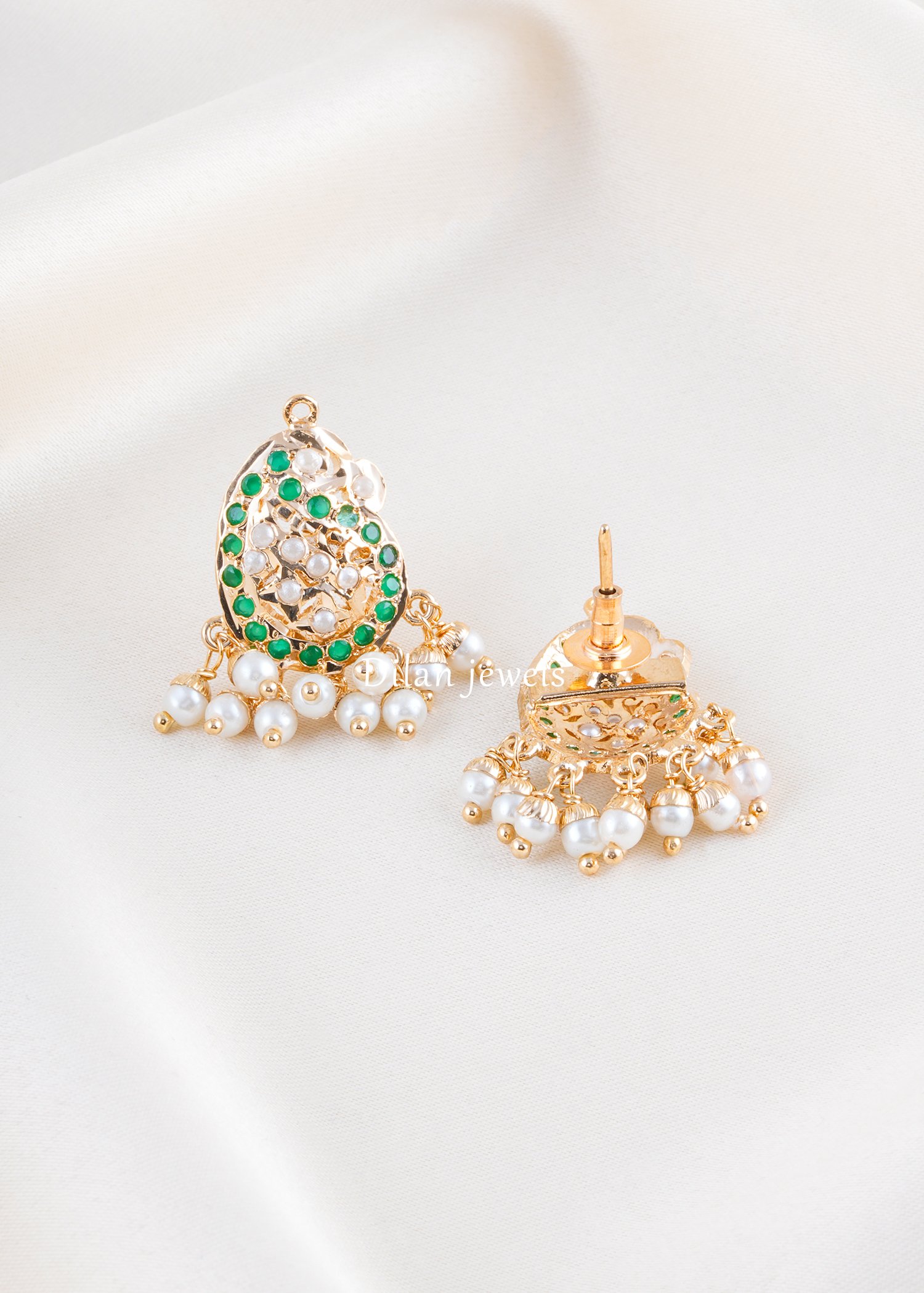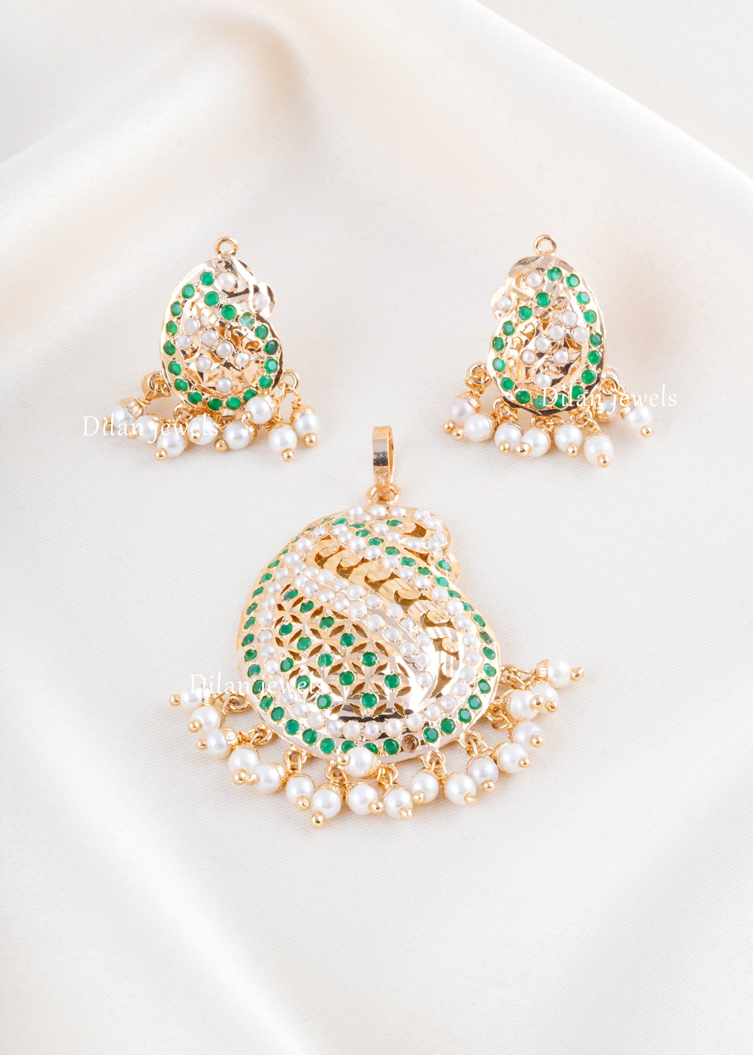 Exude graceful elegance with this refined German silver pendant set featuring brilliant emerald-green stones and lustrous freshwater pearls. The uniquely sculpted teardrop pendants showcase sophisticated lattice work adorned with vibrant green gemstones and glistening cubic zirconia accents. Luxurious pearl drops cascade gracefully beneath, creating a refined waterfall effect. The harmonious blend of emerald tones and neutral pearl white provides a sophisticated color palette perfect for any occasion. Ideal for weddings, festivals, and formal celebrations. This meticulously crafted piece combines traditional artistry with contemporary design, making it a timeless treasure for discerning jewelry enthusiasts.