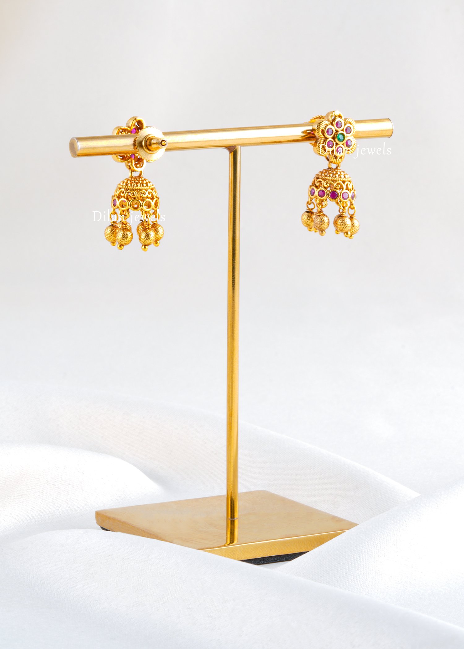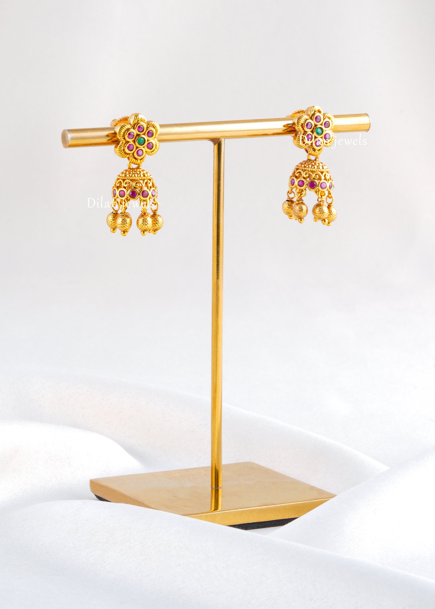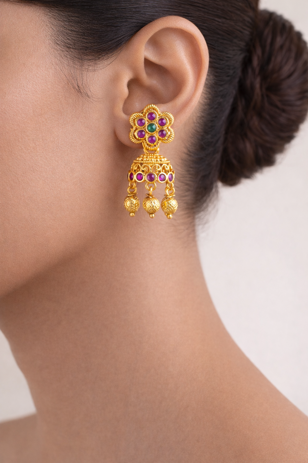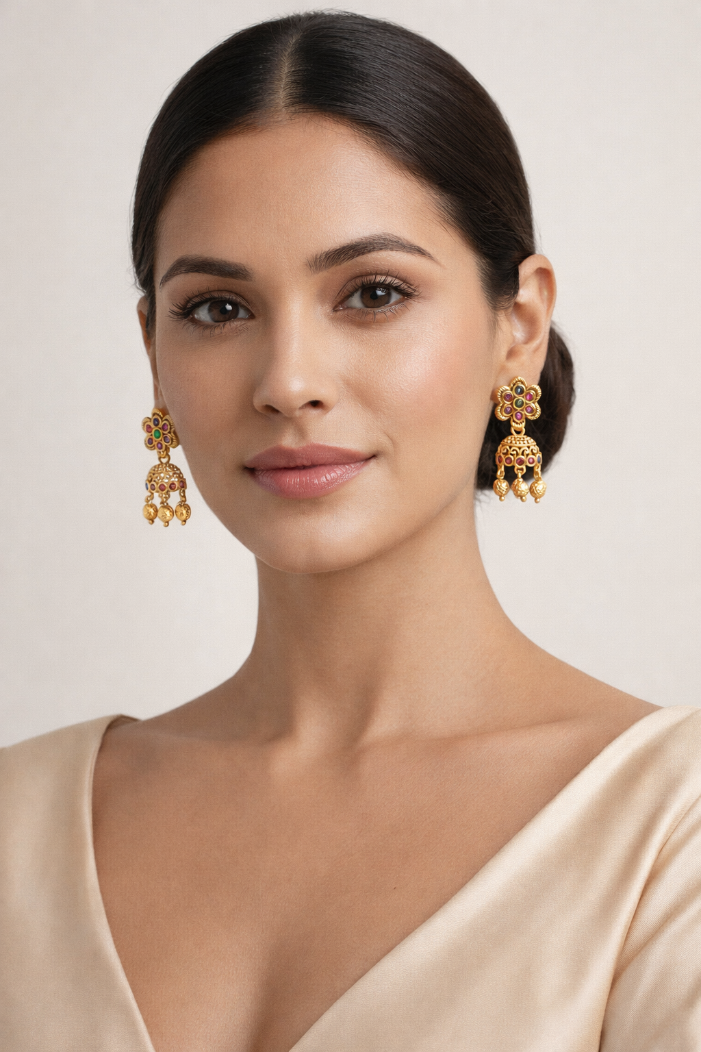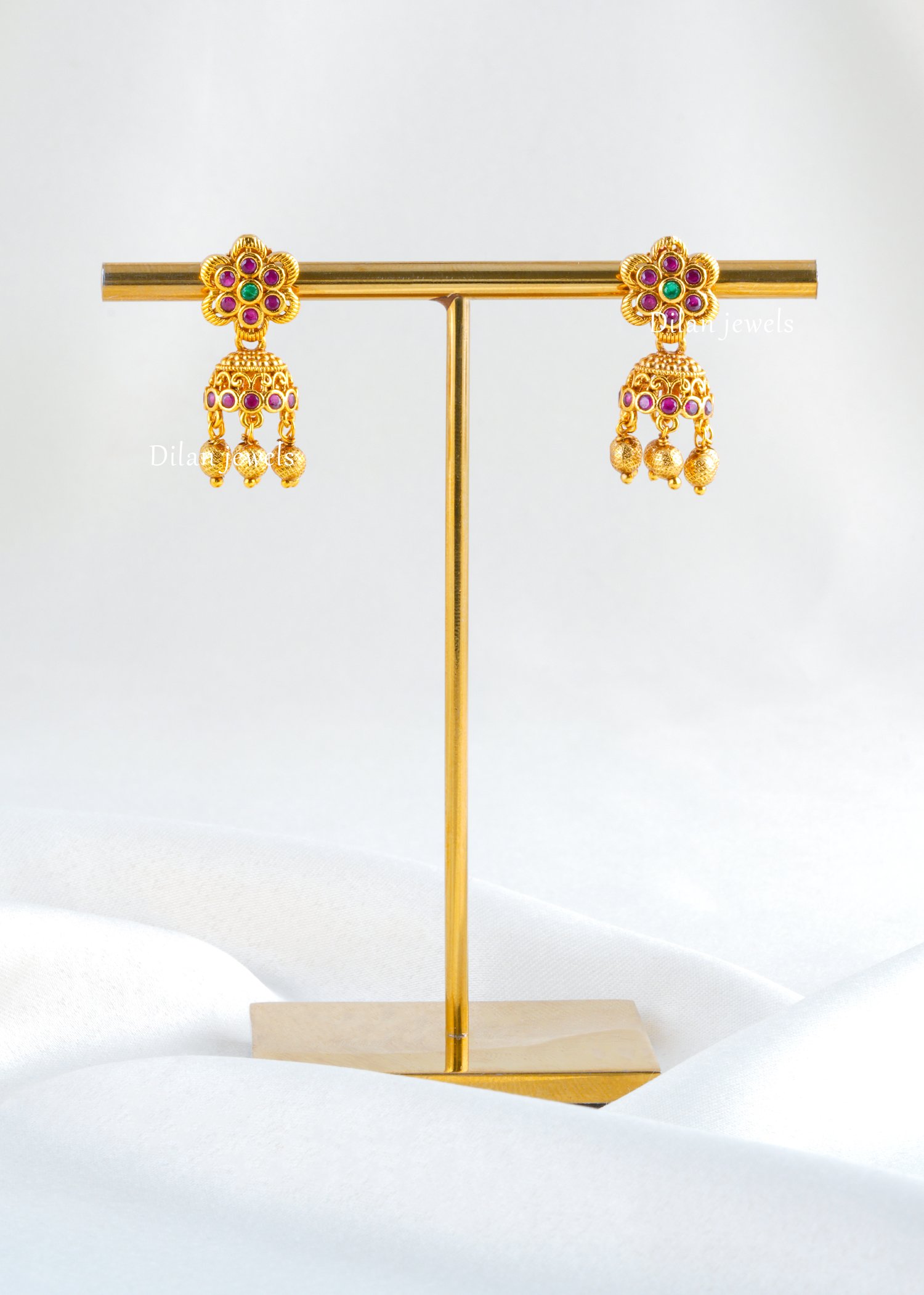 Add a festive sparkle to your look with these floral jhumka earrings crafted in German silver with a rich gold-tone finish. The flower stud is highlighted with vibrant pink and green stone detailing, leading into a classic dome jhumka accented with matching stones and tiny ghungroo-style bead drops for beautiful movement. Intricately carved yet comfortable for long wear, they pair perfectly with sarees, lehengas, kurtas and fusion outfits—ideal for weddings, poojas and celebrations when you want traditional charm with a modern pop of colour.