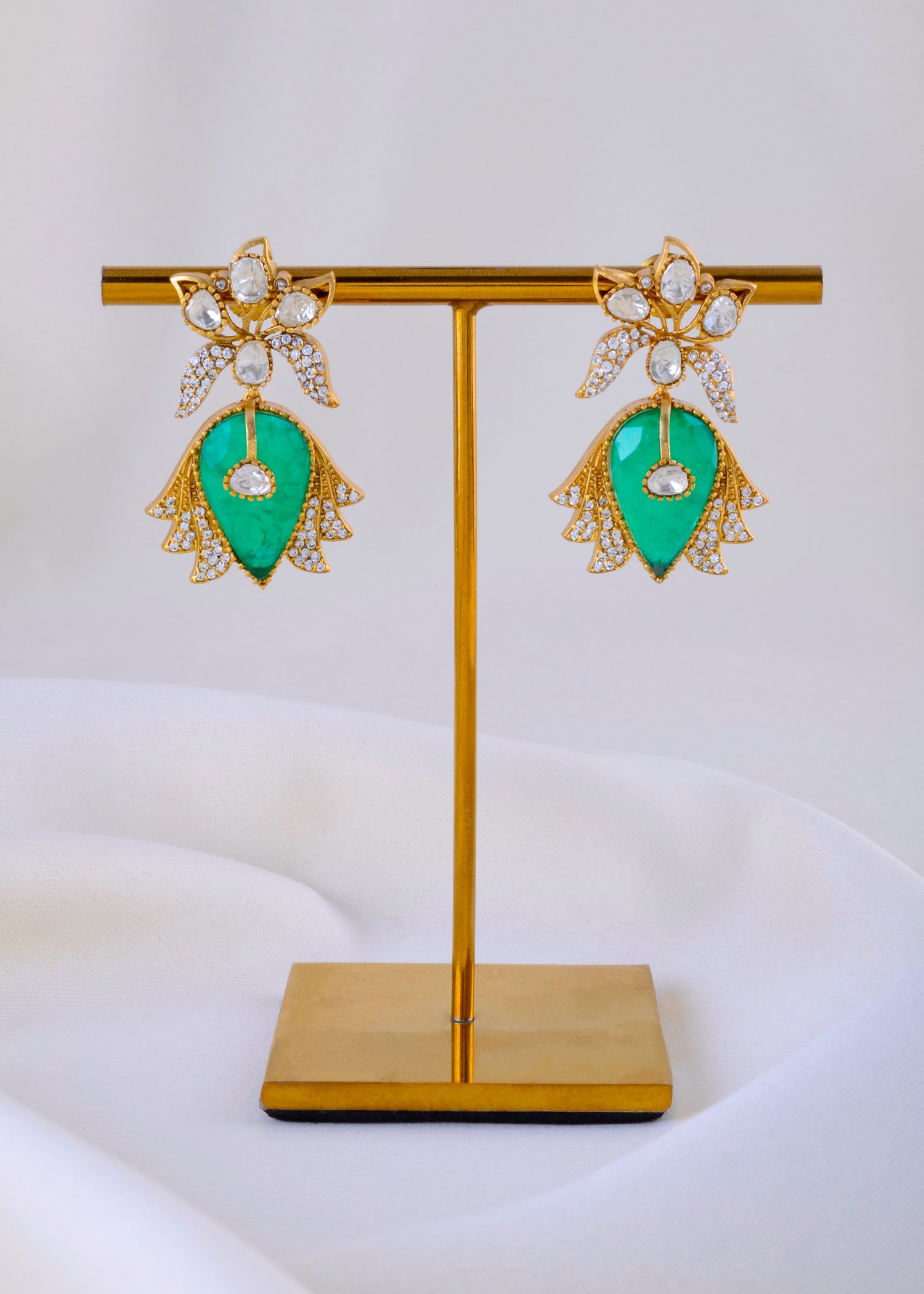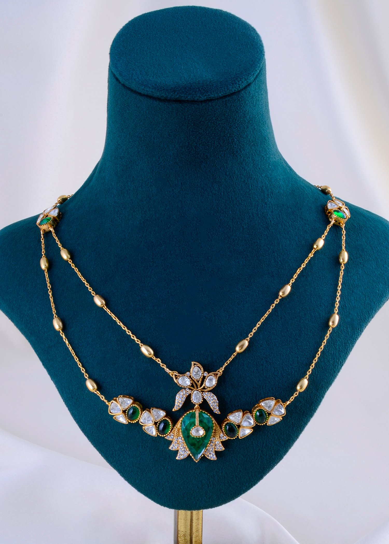 This exquisite necklace set, crafted in premium German Silver, celebrates the grandeur of heritage jewelry. Featuring a graceful double-layered chain, it is adorned with Kundan Polki work and embellished with AAA quality American Diamonds, creating a perfect blend of tradition and sparkle. The central floral motif with a striking green teardrop stone radiates royal elegance, while the matching earrings add a touch of timeless sophistication. Lightweight yet opulent, this set is ideal for weddings, festive occasions, and special celebrations. With a lifetime guarantee on stones, it embodies everlasting charm.