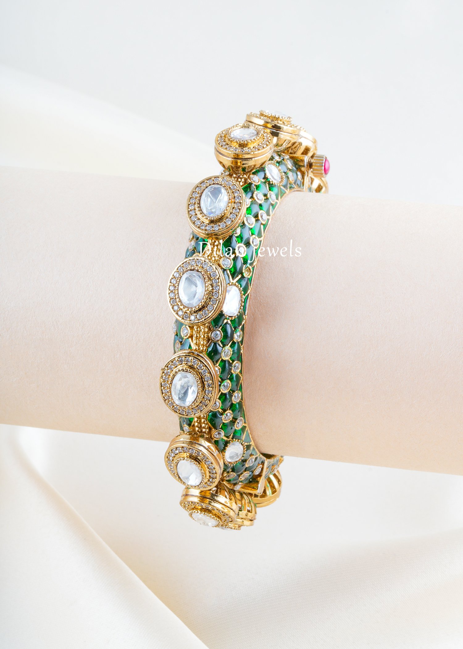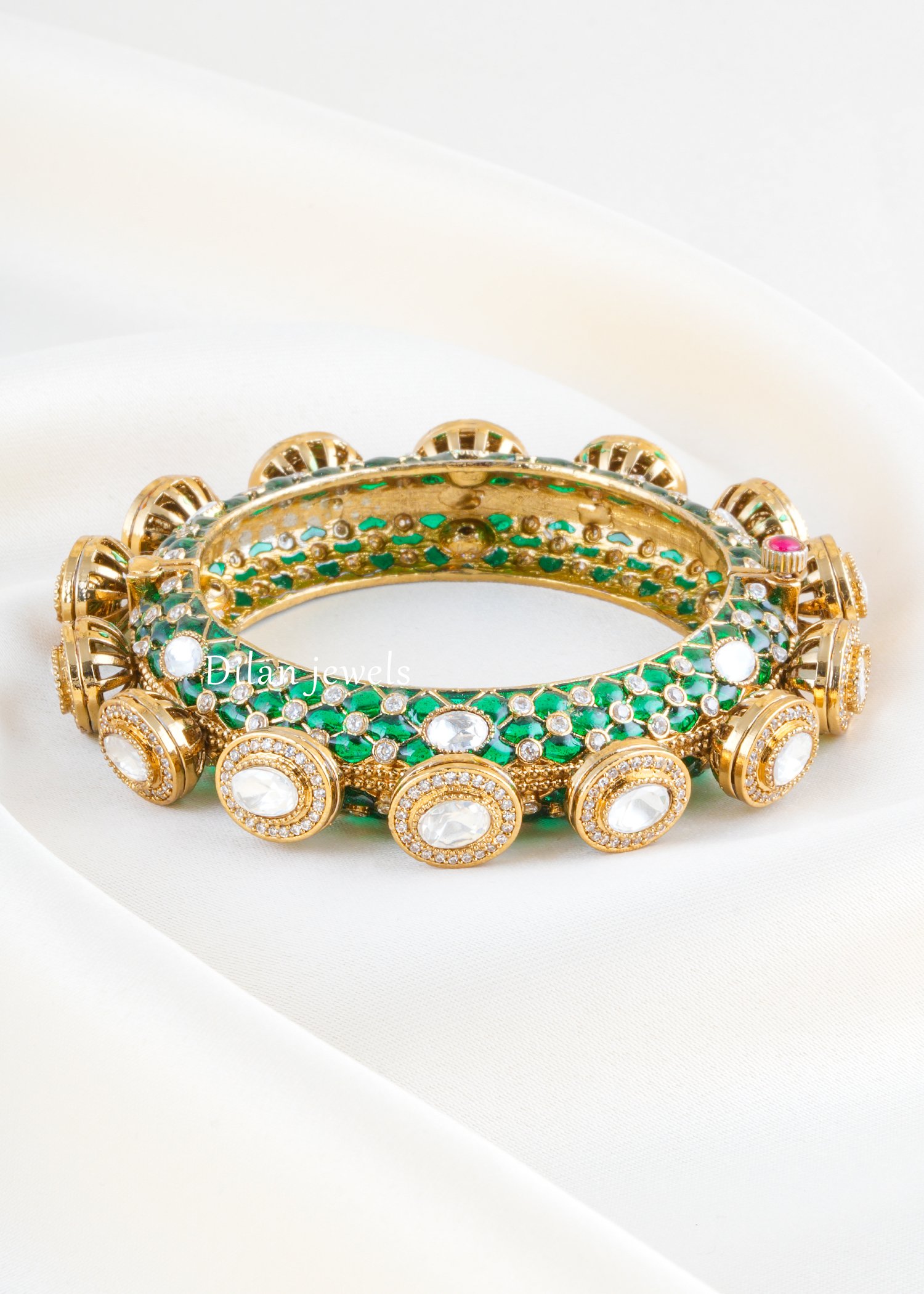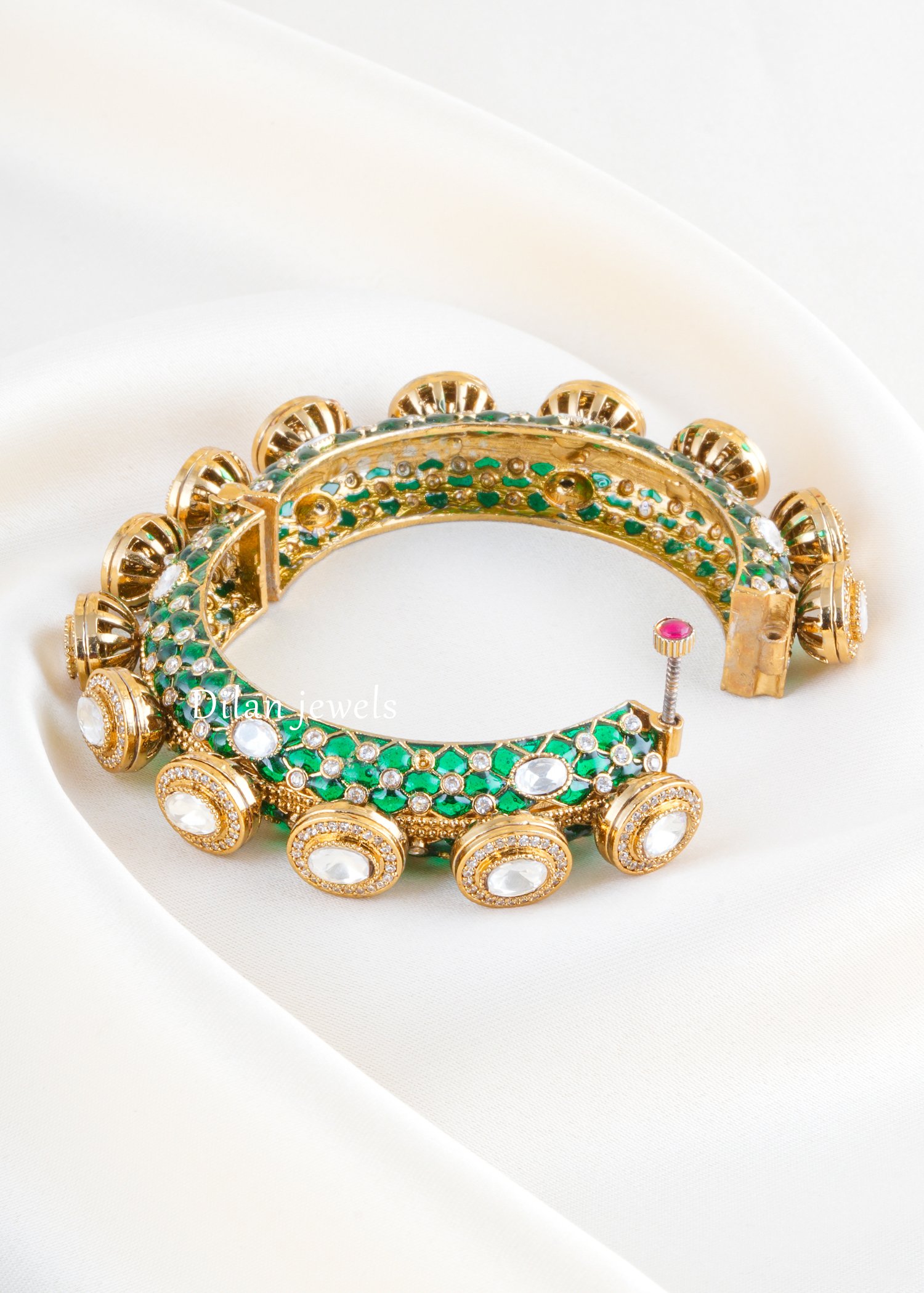 Stunning German silver bangle bracelet featuring AAA quality American diamonds paired with traditional kundan craftsmanship. This luxurious piece showcases luminous oval-cut diamond charms set in ornate bezels with gleaming gold-plated settings, complemented by vibrant emerald-green enamel detailing on the intricately carved band. Eight striking diamond pendants dangle gracefully around the bracelet’s circumference, catching light brilliantly. The ornamental scalloped edges and detailed filigree work exemplify masterful Indian jewelry artistry. Perfect for weddings, celebrations, or as an investment piece, this heirloom-quality bracelet combines timeless elegance with contemporary sparkle, making it an unforgettable statement accessory for special occasions.