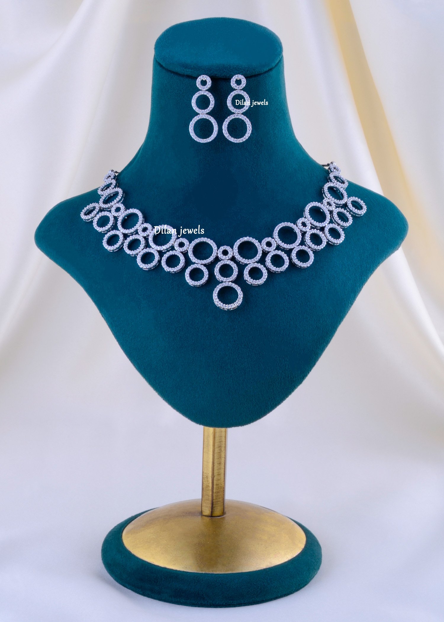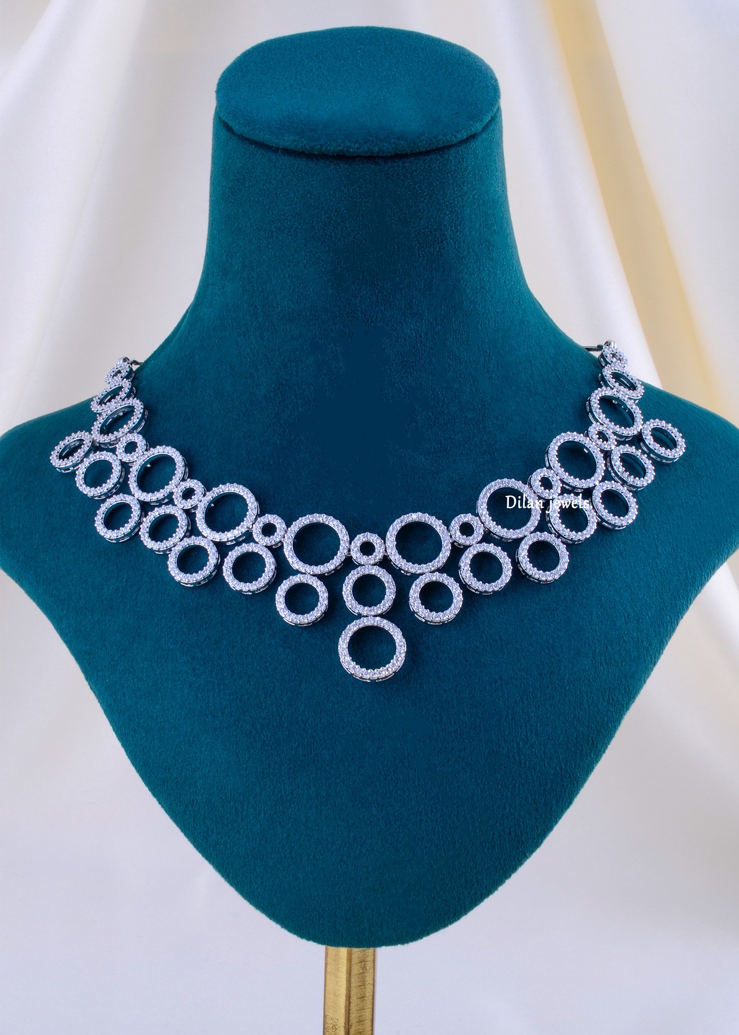 Make a bold yet elegant statement with this stunning German silver necklace set, crafted with precision and adorned with dazzling AAA-quality American diamonds. The unique circular pattern creates a modern, high-fashion look that beautifully reflects light from every angle. Paired with matching double-hoop earrings, this set adds the perfect touch of glamour to both Western and Indo-fusion outfits. Lightweight, durable, and luxurious, it’s an ideal choice for parties, receptions, cocktail nights, and special occasions. A must-have accessory for women who love contemporary sparkle with timeless sophistication.