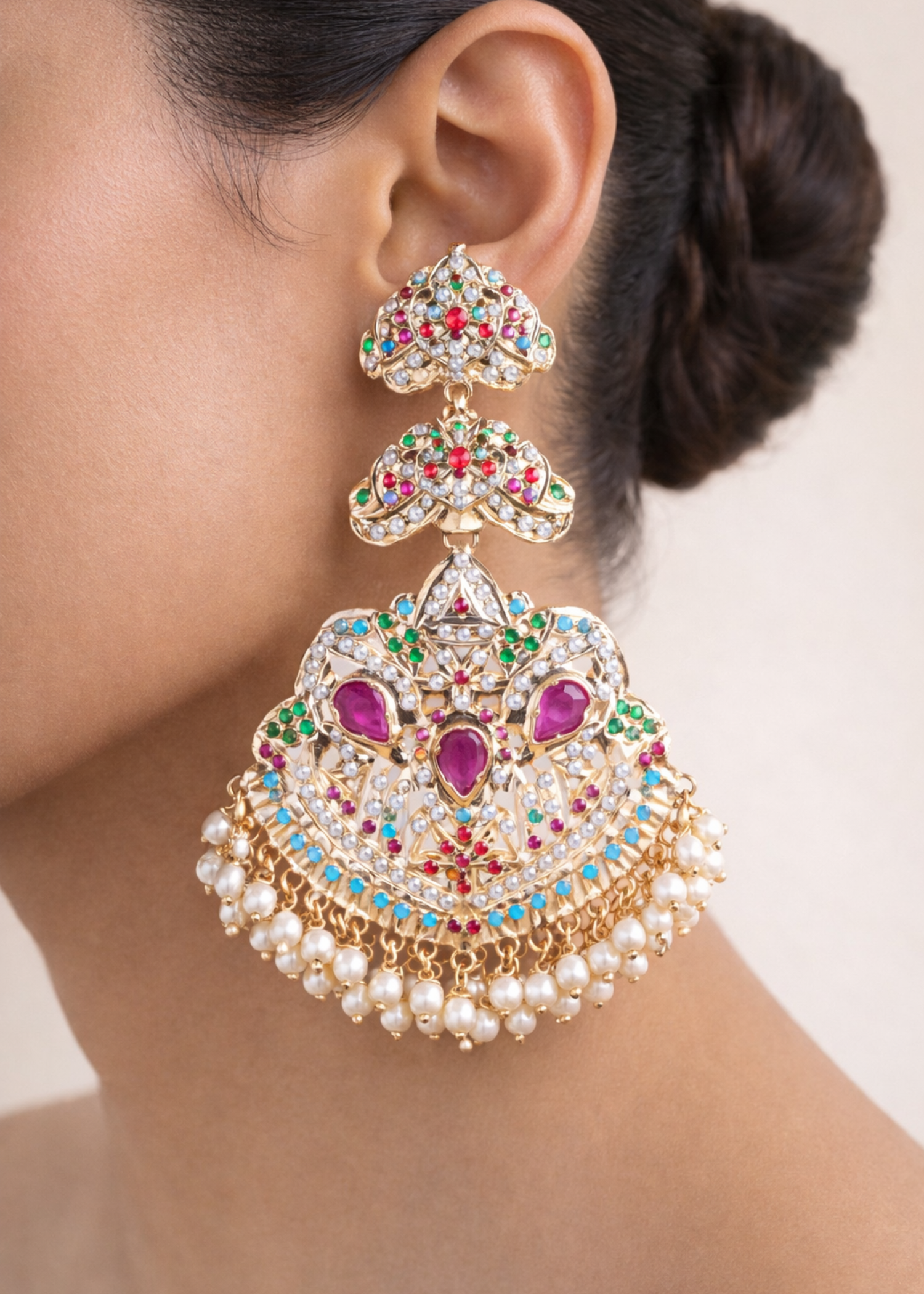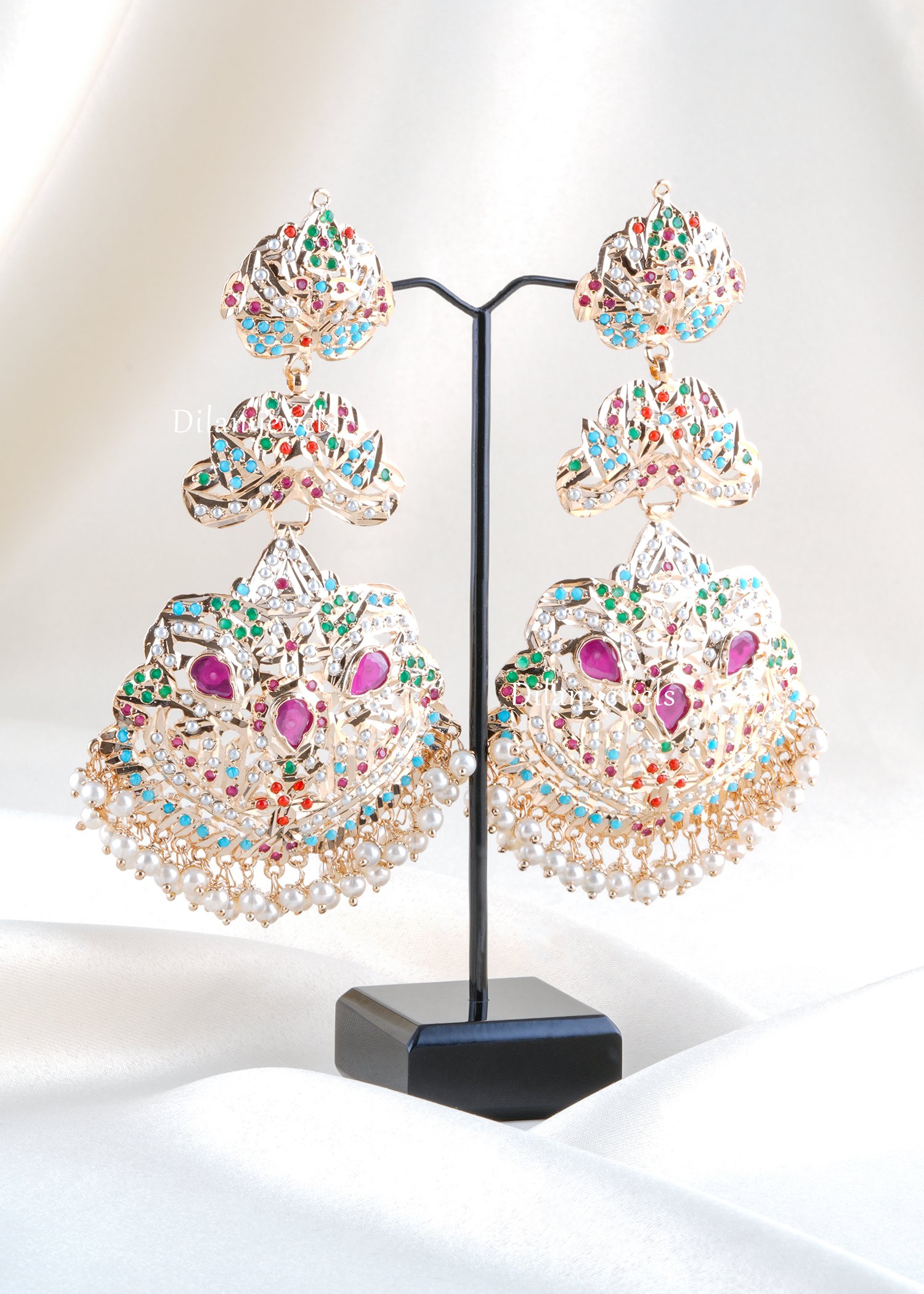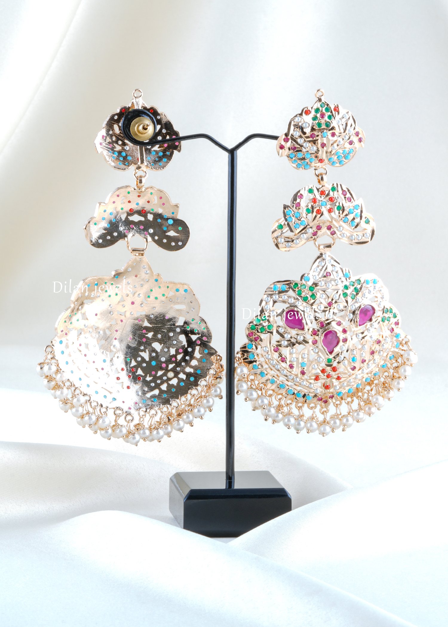 Make every festive look stand out with these handcrafted German silver statement earrings, beautifully detailed with multicolour stone accents and a graceful pearl dangled border. Designed in an ornate layered silhouette, this pair blends traditional artistry with a bold, regal finish that instantly elevates ethnic outfits, lehengas, sarees, and Indo-western styles. The intricate cutwork pattern adds richness, while the soft pearl detailing brings balance and elegance. Lightweight in appearance yet grand in impact, these earrings are perfect for weddings, festive celebrations, and special occasion styling.