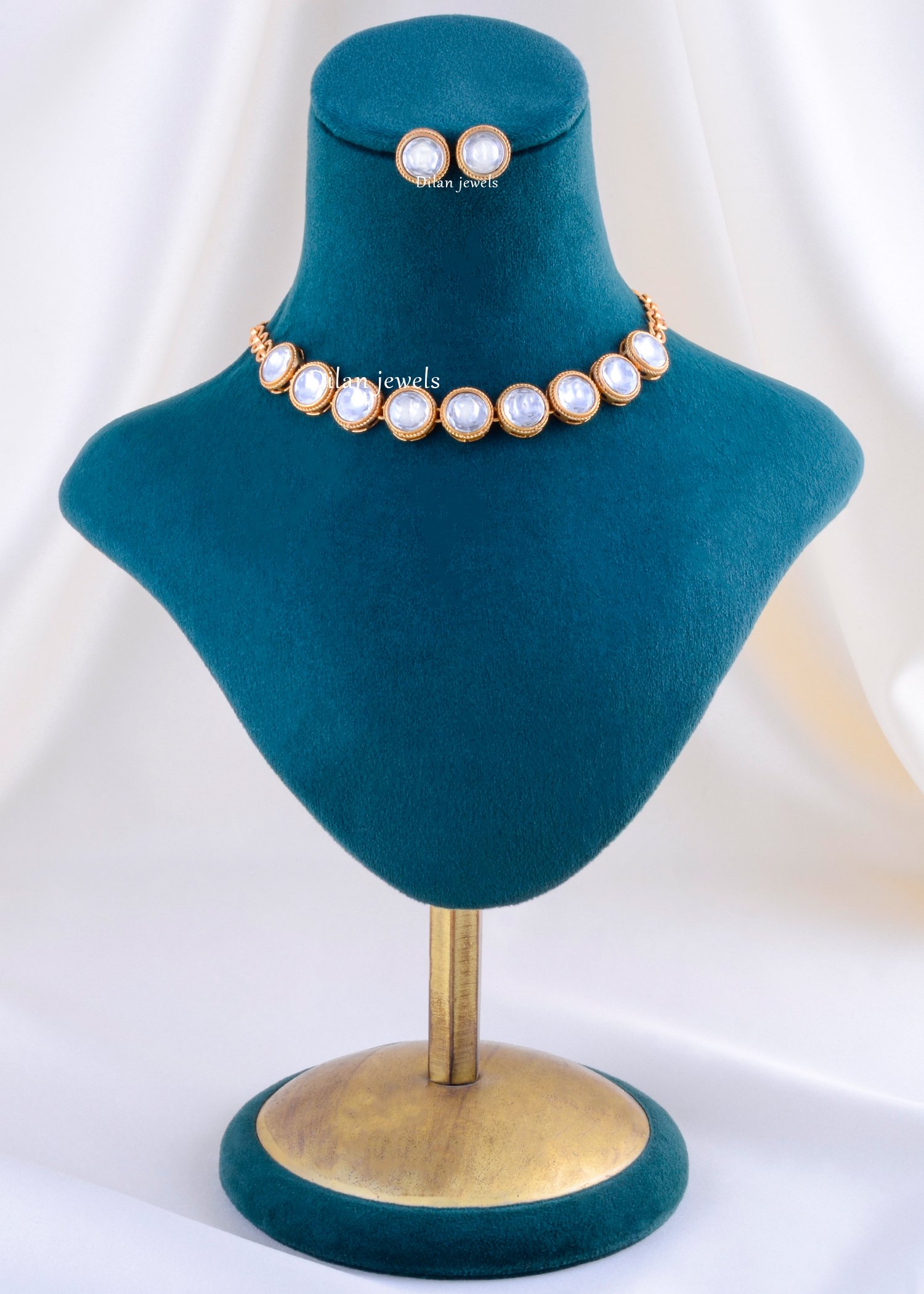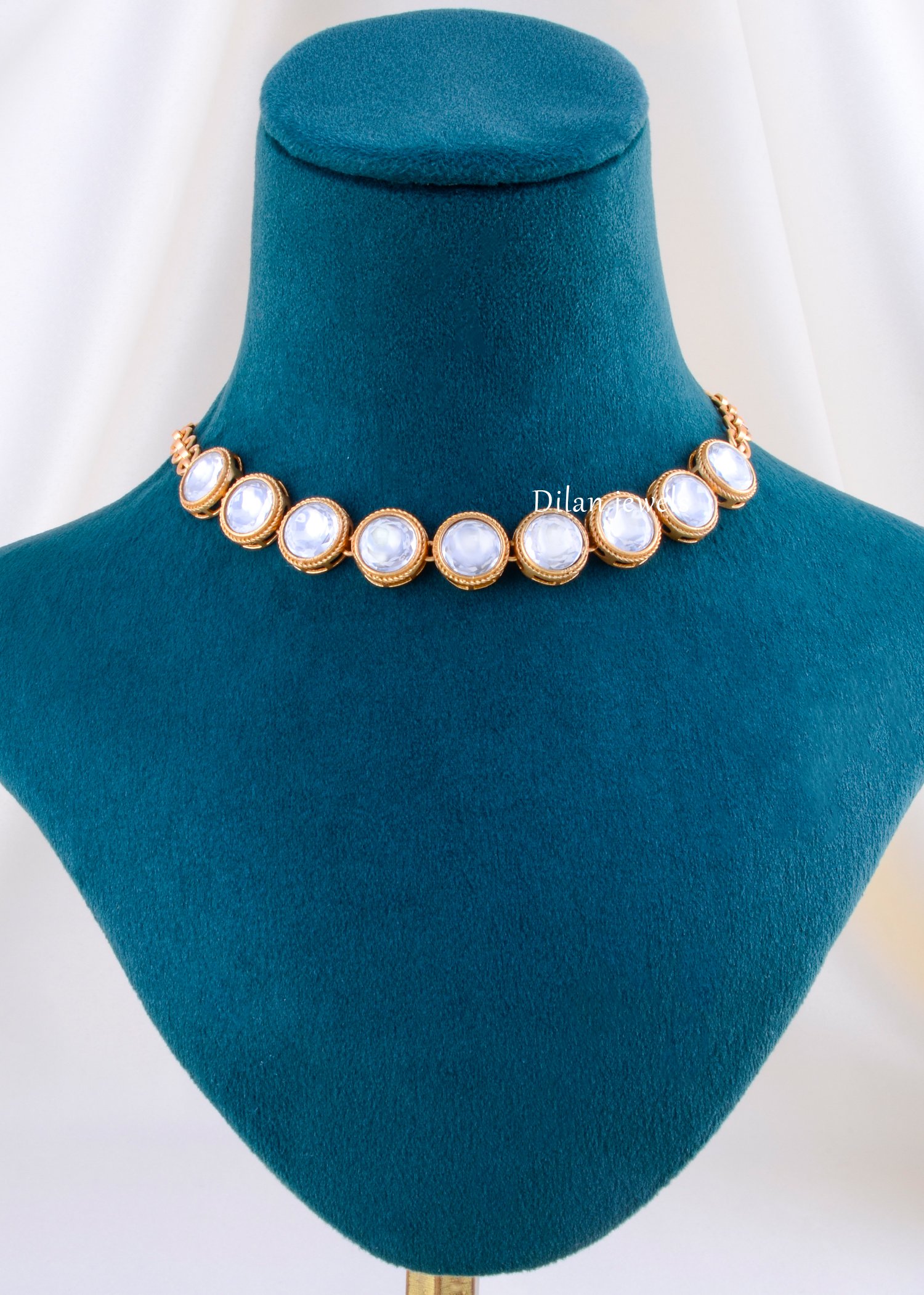 Elevate your ethnic look with this timeless Kundan Pulki necklace set, artistically crafted in premium German silver with luxurious gold finish. A row of luminous, round Kundan stones sits in intricately textured bezel settings, creating a sleek yet regal collar that drapes beautifully along the neckline. Matching stud earrings mirror the elegant design, making this set perfect for weddings, festivals, and family celebrations. Lightweight and comfortable for long wear, this versatile piece pairs effortlessly with sarees, lehengas, and Indo‑western outfits, adding a sophisticated royal glow to every occasion.